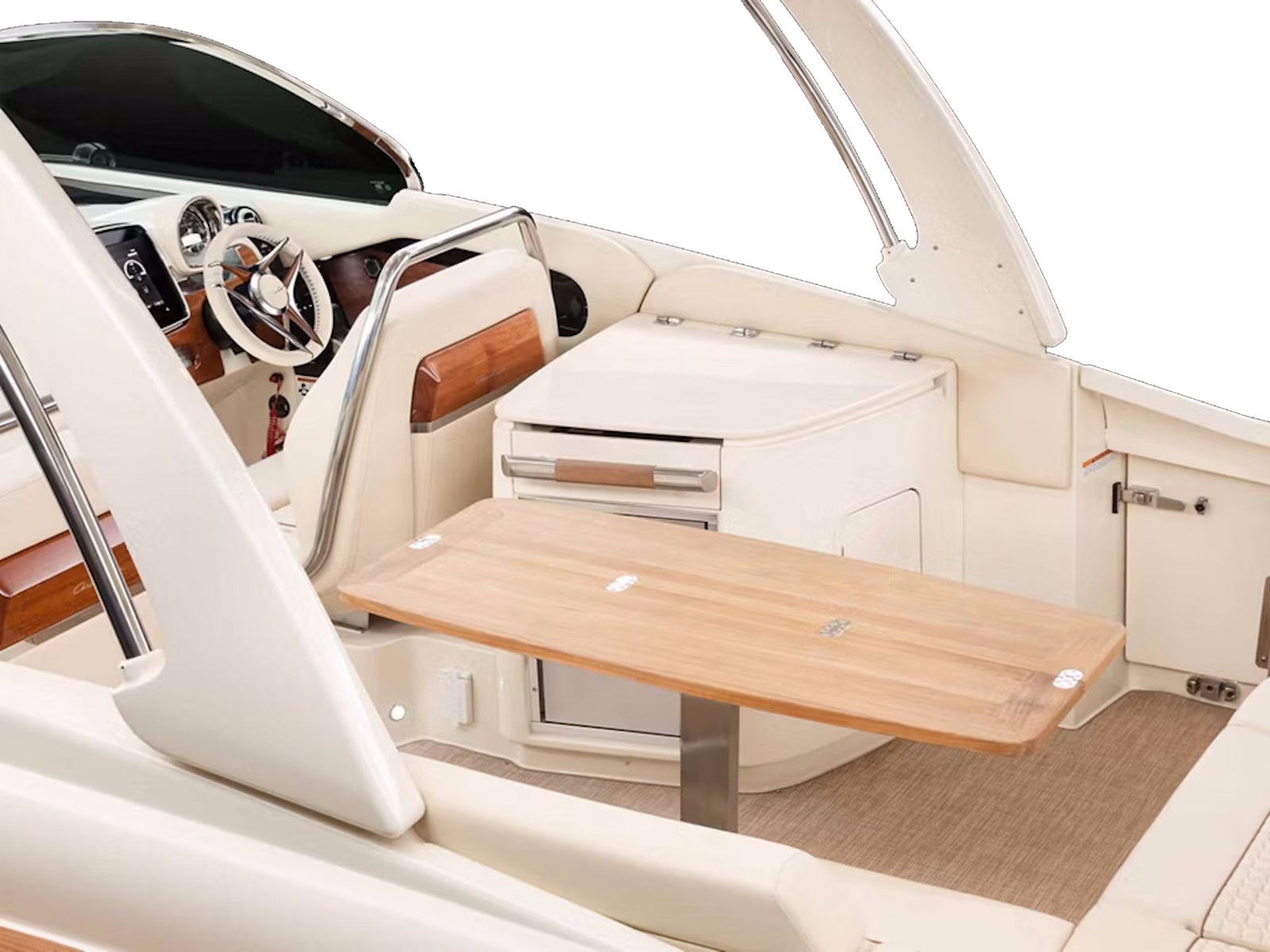 A convenient galley near the starboard side-boarding door keeps snacks and beverages at the ready. This optional integrated refreshment center features a sink, refrigerator, and grill to elevate onboard meals. The standard teak cockpit table easily deploys and stows (under the seats), while an optional teak bow table creates another social zone