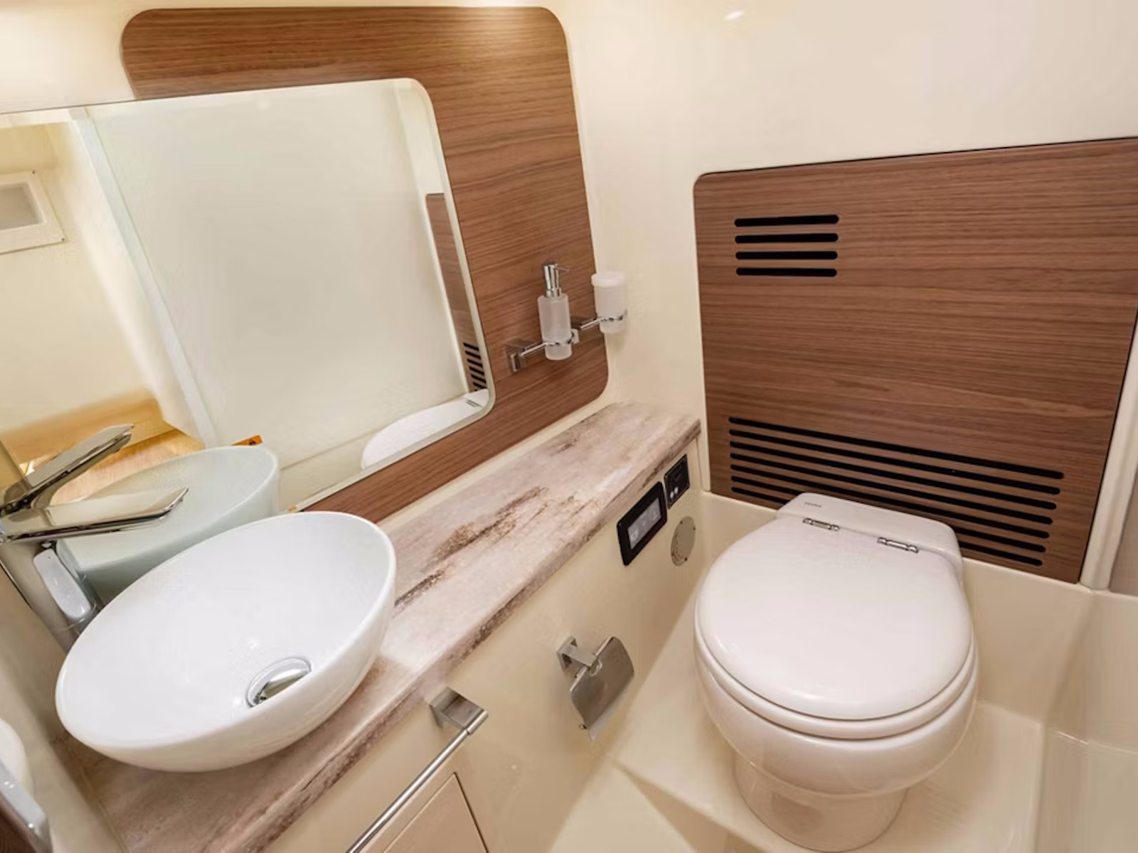 Spacious and well-appointed, the head can be fitted with an optional air conditioner, perfect for warmer climates. The porcelain toilet includes dockside pumpout functionality, and there’s a cabinet for extra storage.