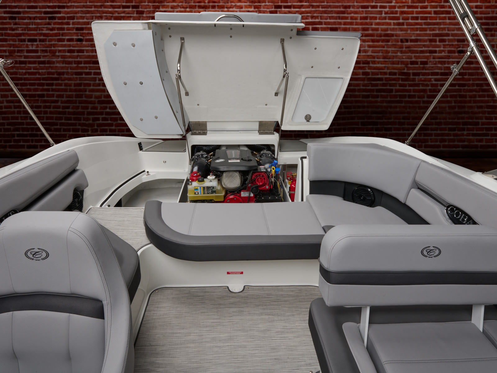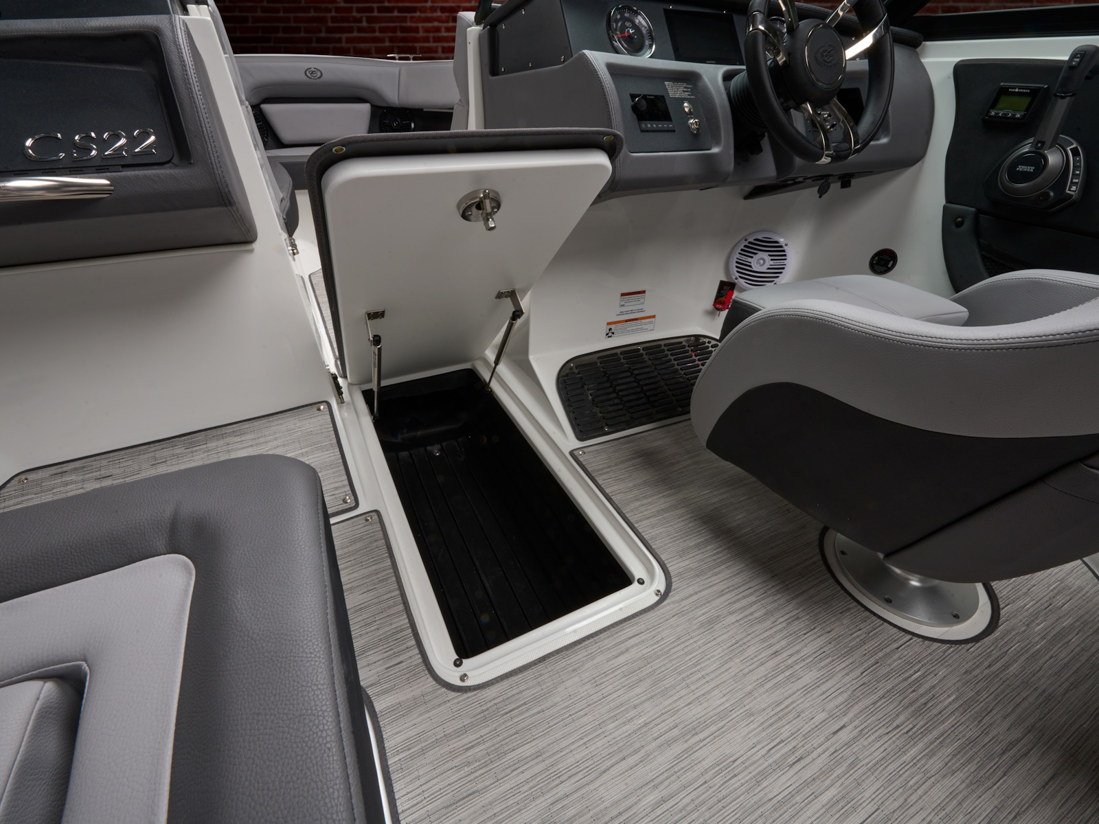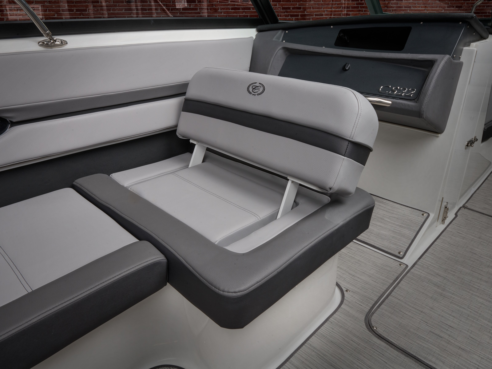 The detailed interior of the CS22 features a wide interior beam, walk-thru transom, digital helm instrumentation, and a six-speaker sound system with Bluetooth capability that allows you to unplug with family and friends for the perfect day on the water.