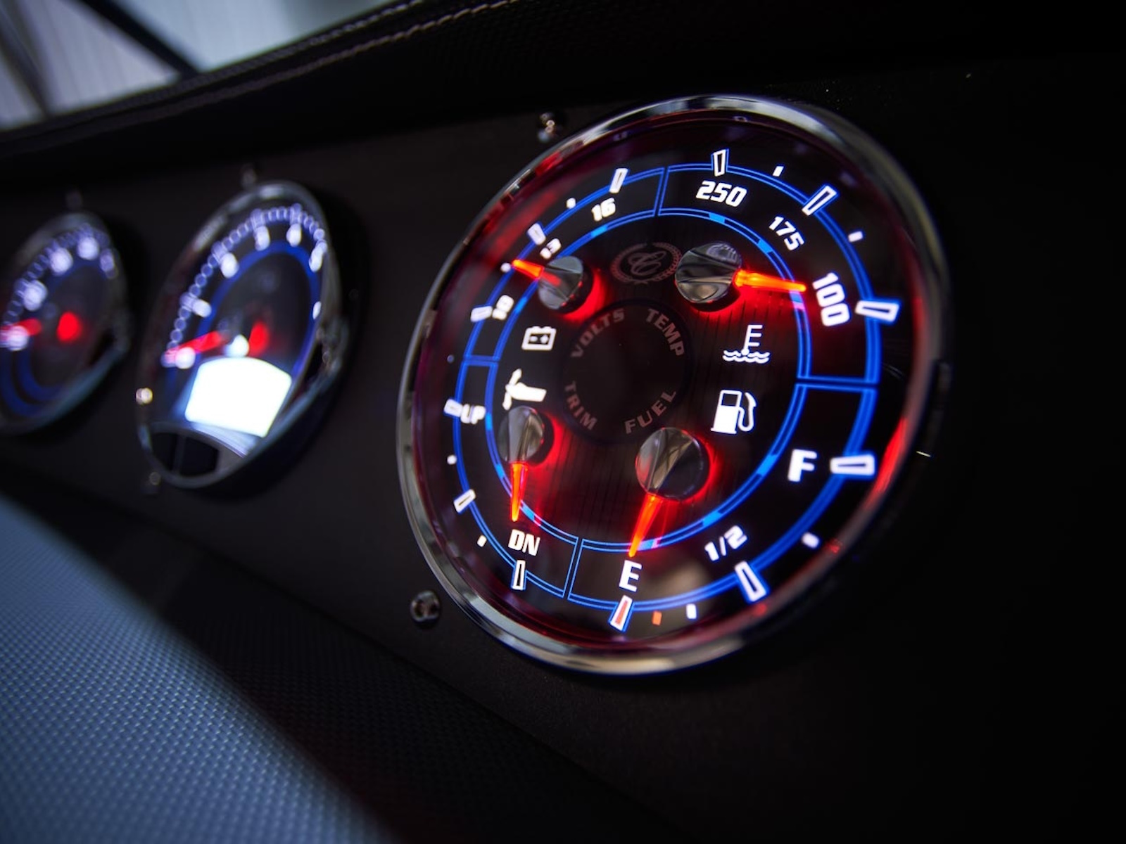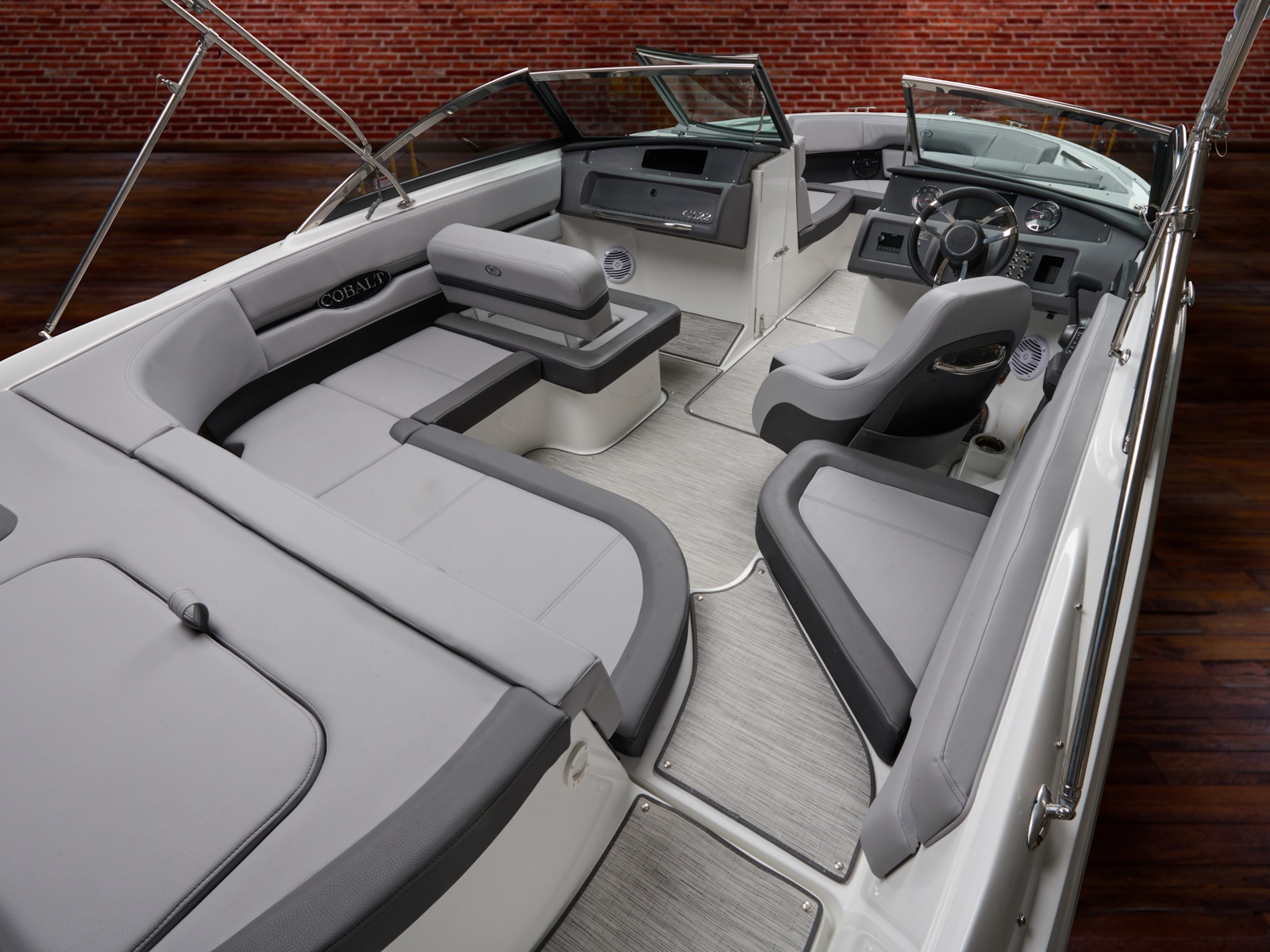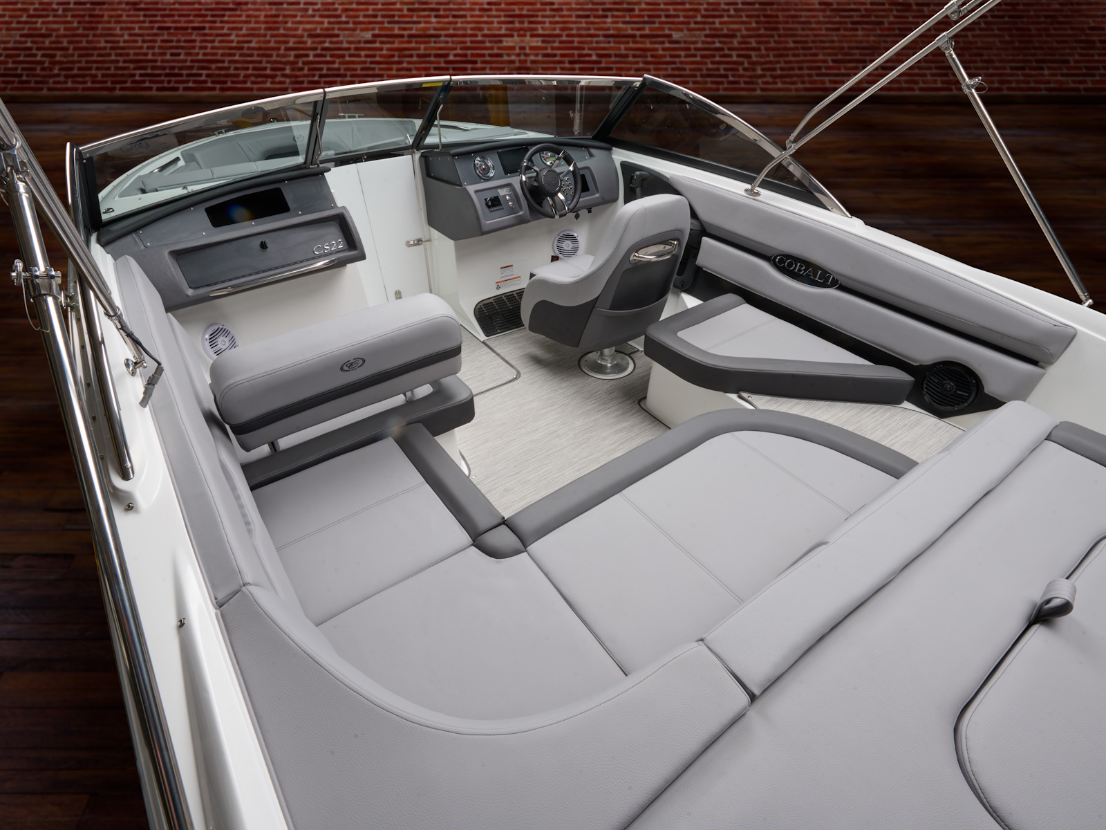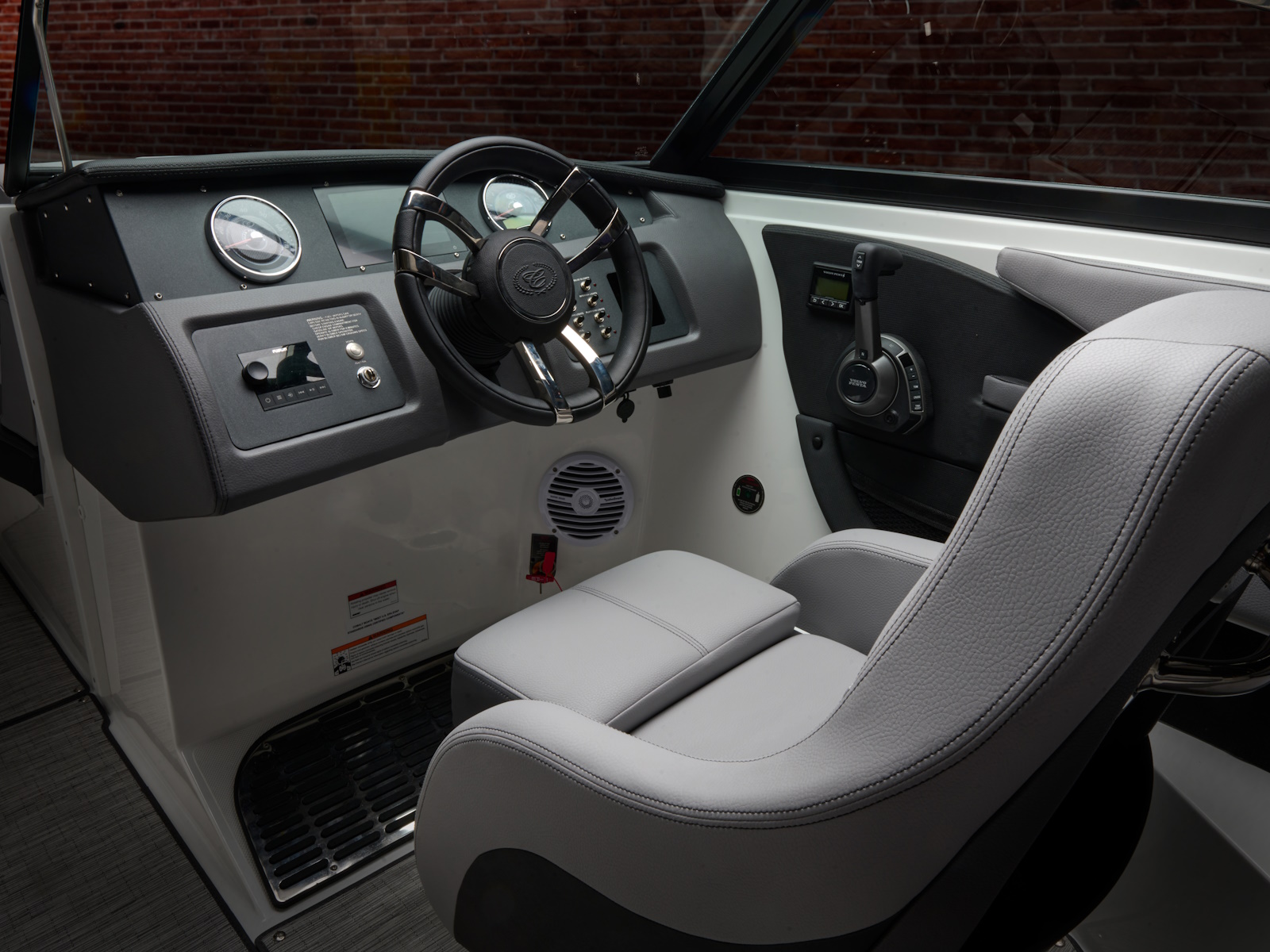 The detailed interior of the CS22 features a wide interior beam, walk-thru transom, digital helm instrumentation, and a six-speaker sound system with Bluetooth capability that allows you to unplug with family and friends for the perfect day on the water.