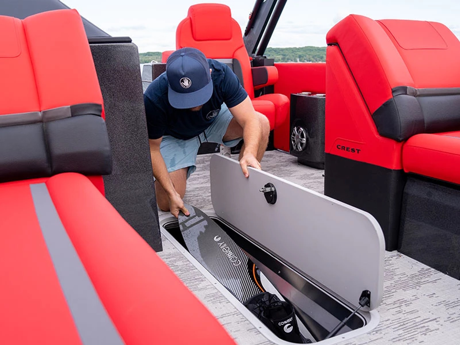 Escape the ordinary on the Caribbean RS. Introducing the newly-designed wakeboard arch with an integrated sport bimini for style and functionality. Capture the action behind the boat with the Ski Tow Extension Package that includes GoPro and flag holders. Premium audio upgrade options are available so you get the crystal-clear marine sound technology that keeps the crew going. Indulge in unparalleled comfort with the choice of SoftTouch and CoolFeel upholstery options, allowing you to design a seating oasis that reflects your unique style. The new rugged ultra-lightweight cooler, complete with a custom SeaDek pad, ensures your favorite beverages stay chilled and afloat. Escape the ordinary and design your extraordinary boating experience with the Caribbean RS.