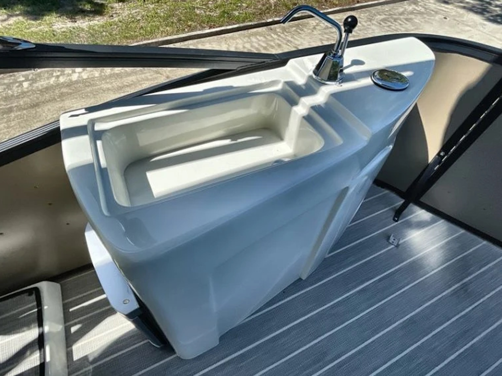- Bar (Includes Fridge w/ Ice Maker, Trash container, Sink with 6 Gal Fresh Water, Grill, and Cutting Board)