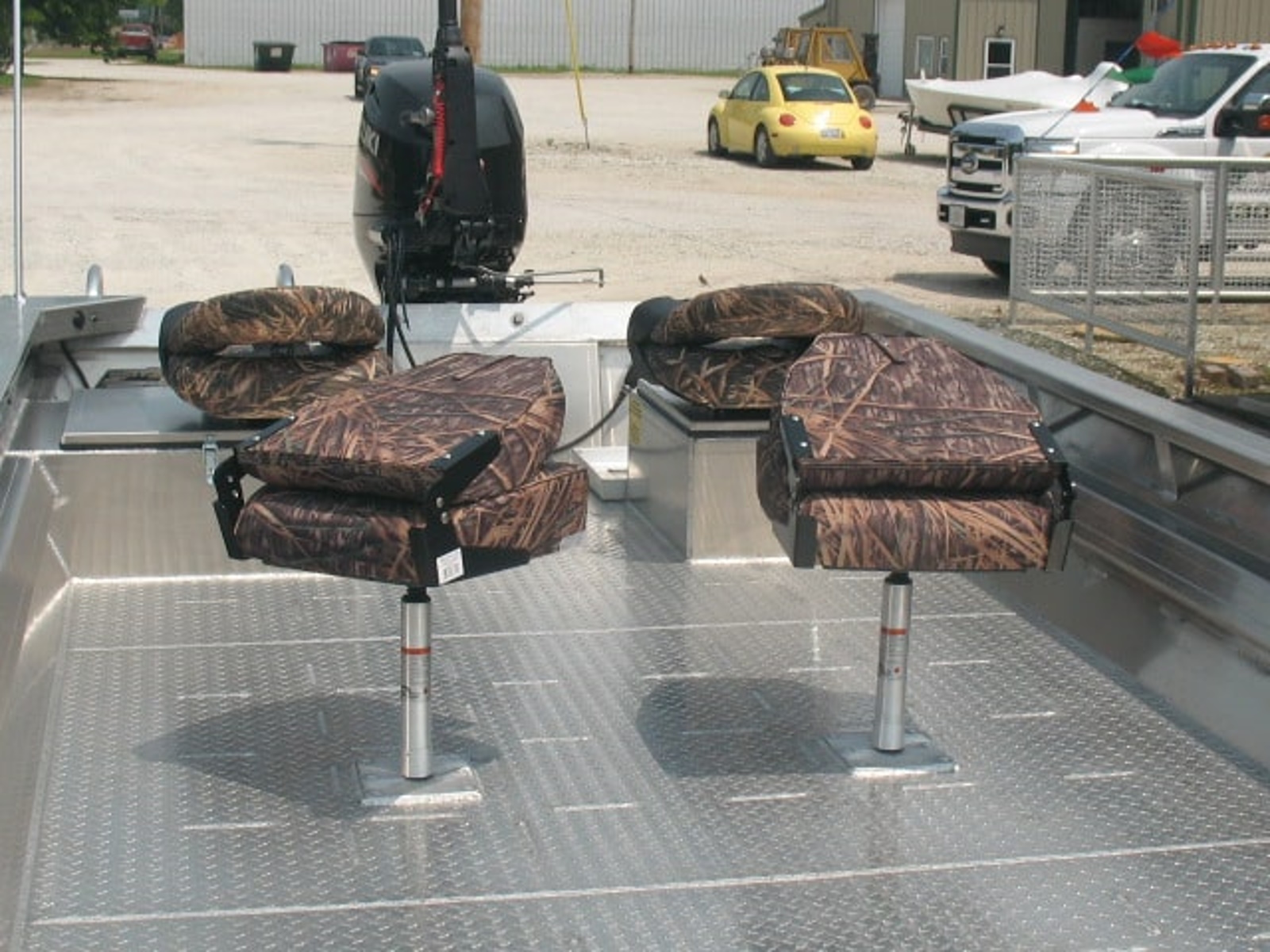 Can you see yourself this season in a top of the line duck blind? Oquawka Boats specializes in various boats for the avid hunter, including a hand painted design of your choice. One high quality boat can be both a duck blind and fishing boat. We can incorporate gun racks, fishing rod holders, a toilet, live wells, dog ramps or whatever you want in your boat. We also offer removable duck blinds, with or without a ramp for your four legged hunting partner. Our blinds are built to the same existing standards as everything else we build. The blind can be easily removed when the season is over.