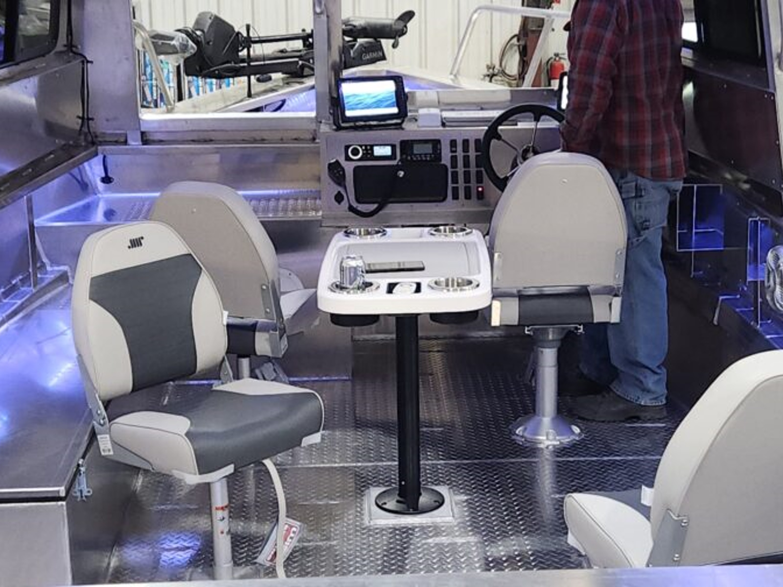 - Options: 5' 3-Sided Cabin With Console/Tempered Safety Glass Windshield/ 2 Side Windows / (4) Pedestal Seats/Navigation Lights/Hydraulic No Feedback Steering/50 Gallon Live Well With Pump & Aerator/ 30 Gallon Permanent Custom Built EPA Compliant Aluminum Fuel Tank/7' Rod Locker/1100 GPH Bilge Pump & Switch/Bluetooth Radio w/speakers/Washdown Kit/Marine Boat Table w/leg set/ Trolling Motor/Powered by a 175 HP Suzuki w/kicker motor/Tandem Axle Aluminum Trailer
