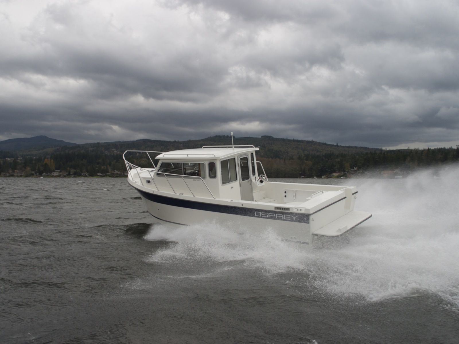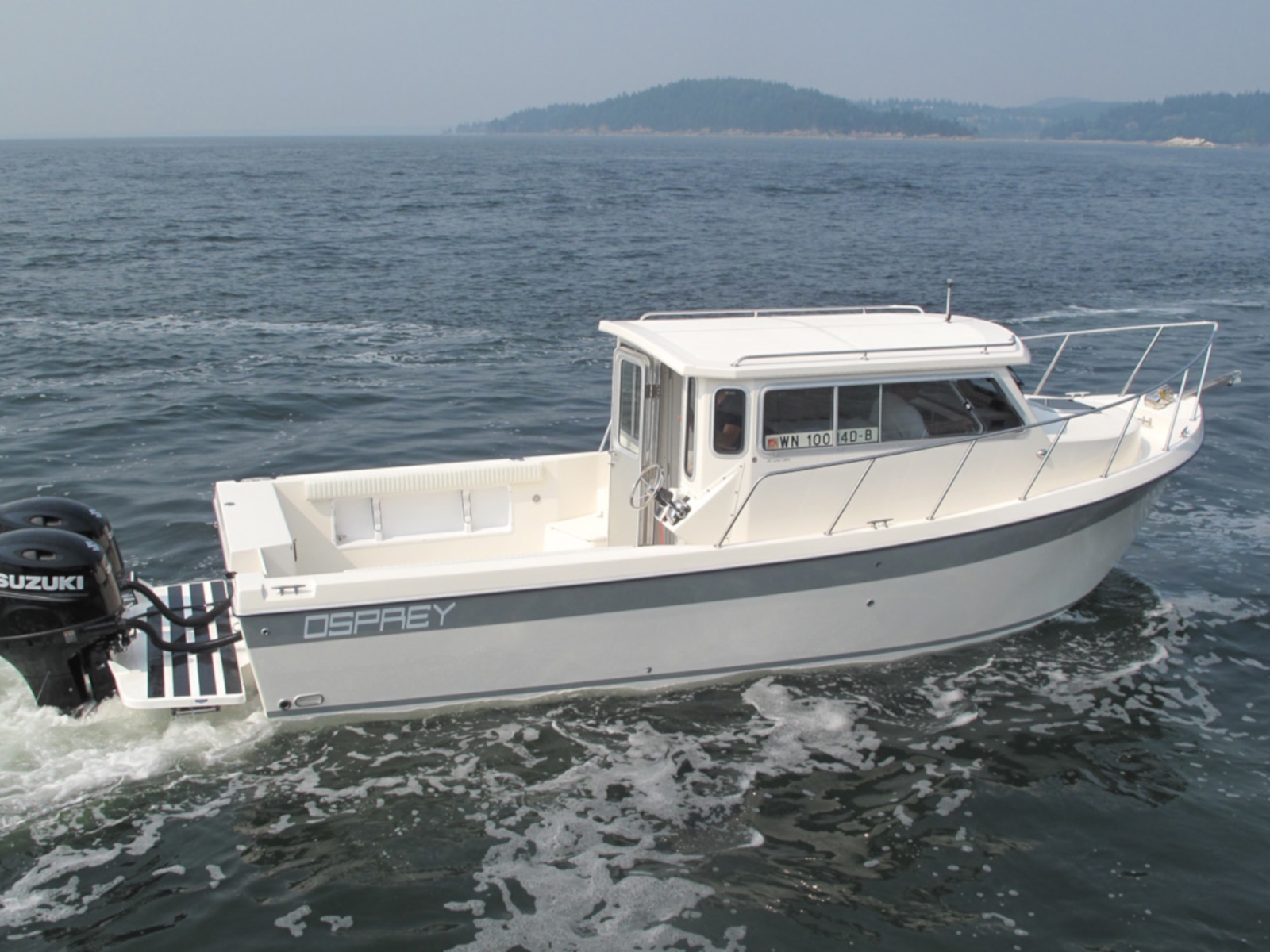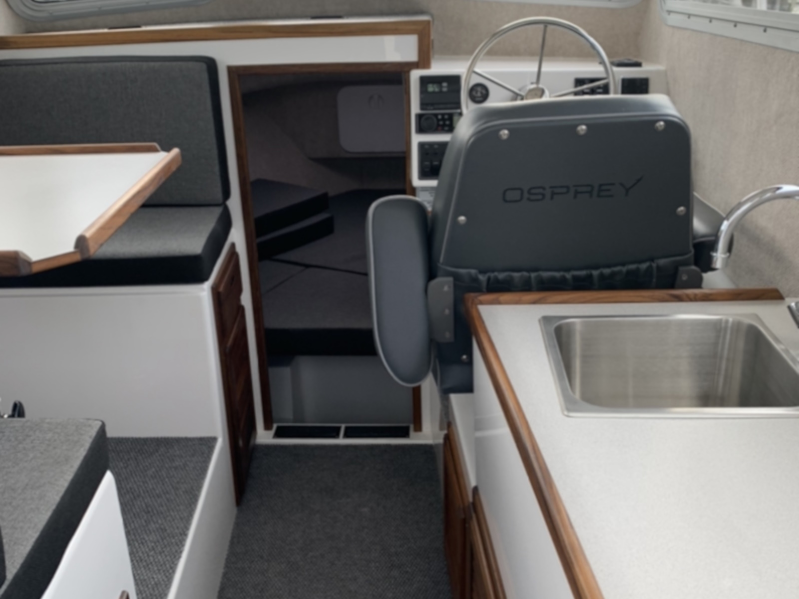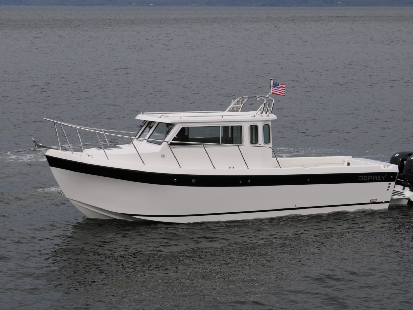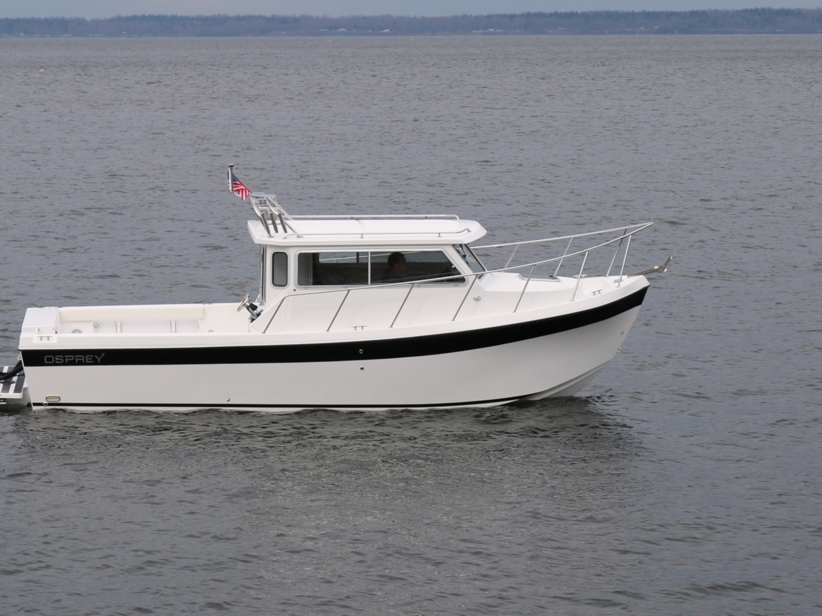 The Osprey 26′ Legend gives greater livability for families while offering the high performance and quality you’ve come to expect from Osprey. Standard features are fabric upholstery, shower, CD player, and full galley with extra deep sink for the chef in the family. Shore power is also standard, as well as a seawater wash-down system, a substantial radar arch, transom door, and swim step. Additional options include a full stand-up head and flip-flop cabin seat that allows you to face forward or turn around to join the party in the spacious dinette. If you have a big family, or just need the extra room, with two layouts to choose from the 26′ Legend is the ideal choice – combining extra comfort with the performance you’d expect from a power fishing cruiser.