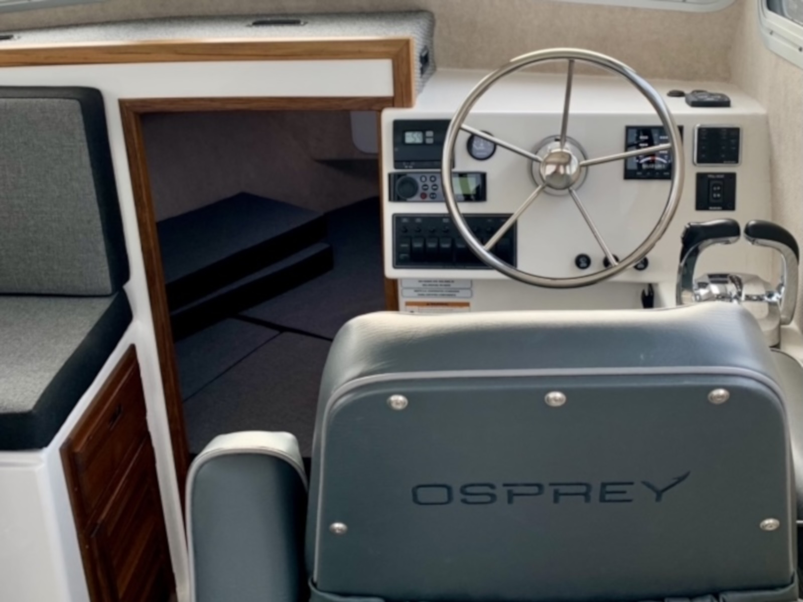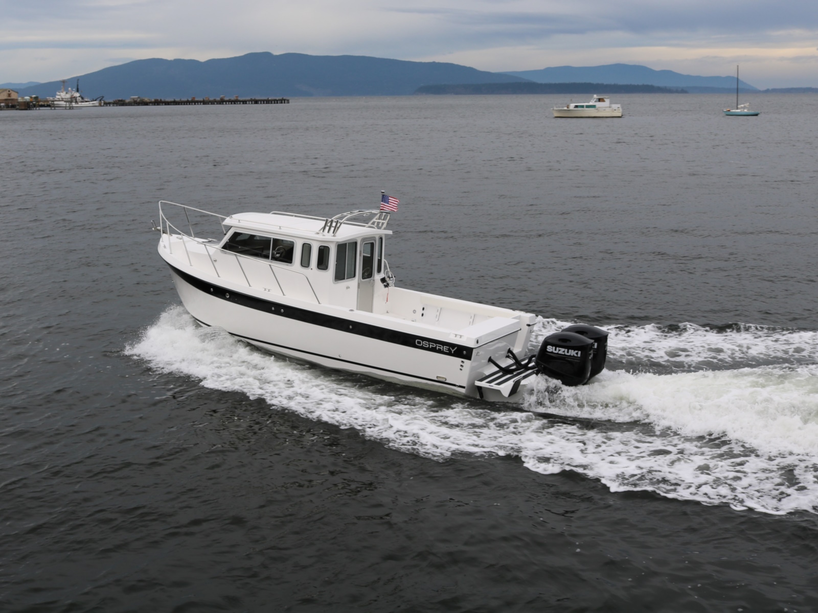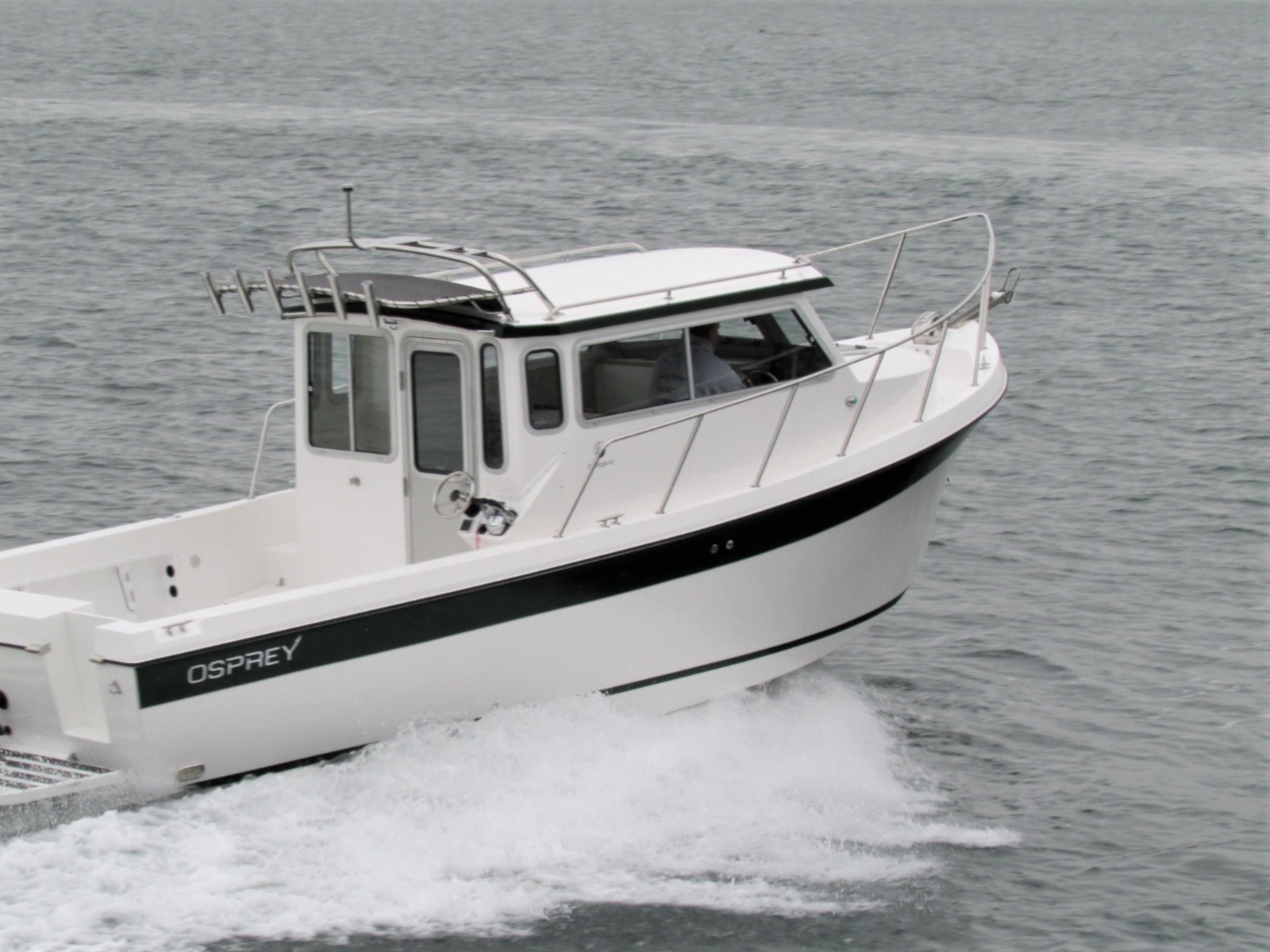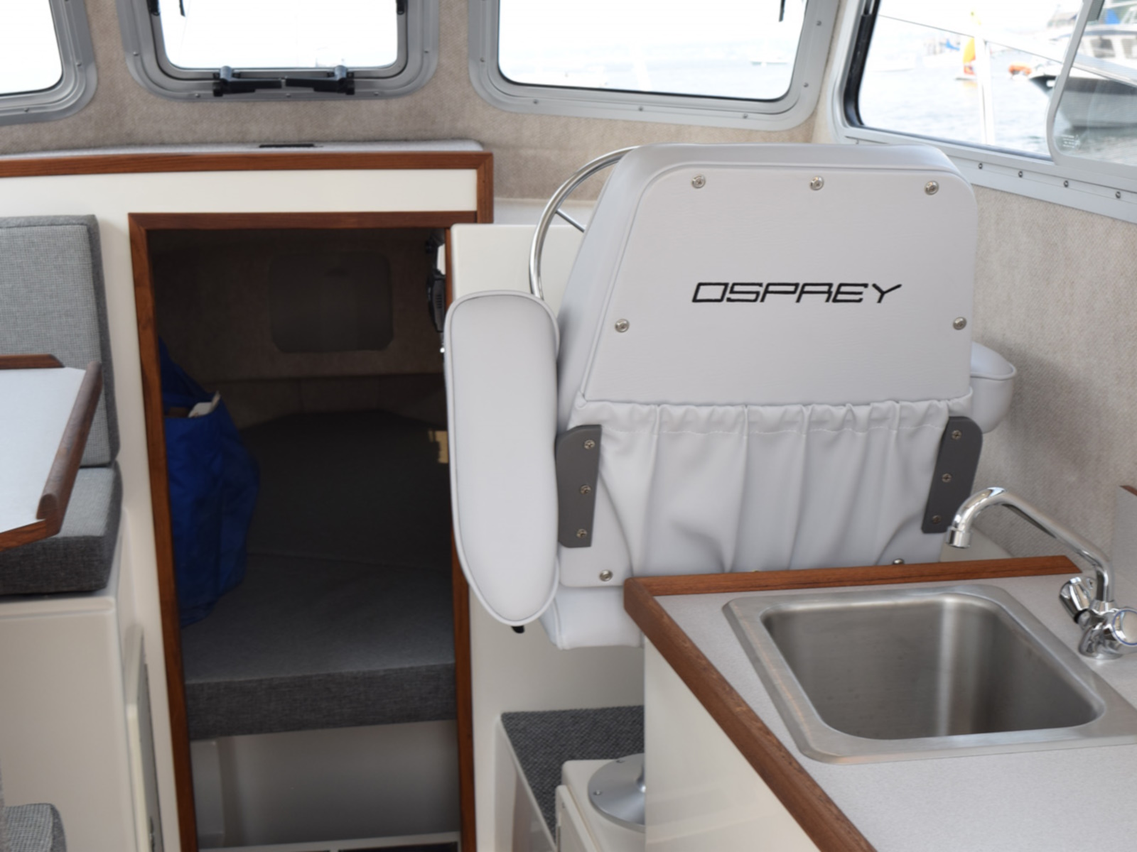 The Osprey 26′ Legend gives greater livability for families while offering the high performance and quality you’ve come to expect from Osprey. Standard features are fabric upholstery, shower, CD player, and full galley with extra deep sink for the chef in the family. Shore power is also standard, as well as a seawater wash-down system, a substantial radar arch, transom door, and swim step. Additional options include a full stand-up head and flip-flop cabin seat that allows you to face forward or turn around to join the party in the spacious dinette. If you have a big family, or just need the extra room, with two layouts to choose from the 26′ Legend is the ideal choice – combining extra comfort with the performance you’d expect from a power fishing cruiser.