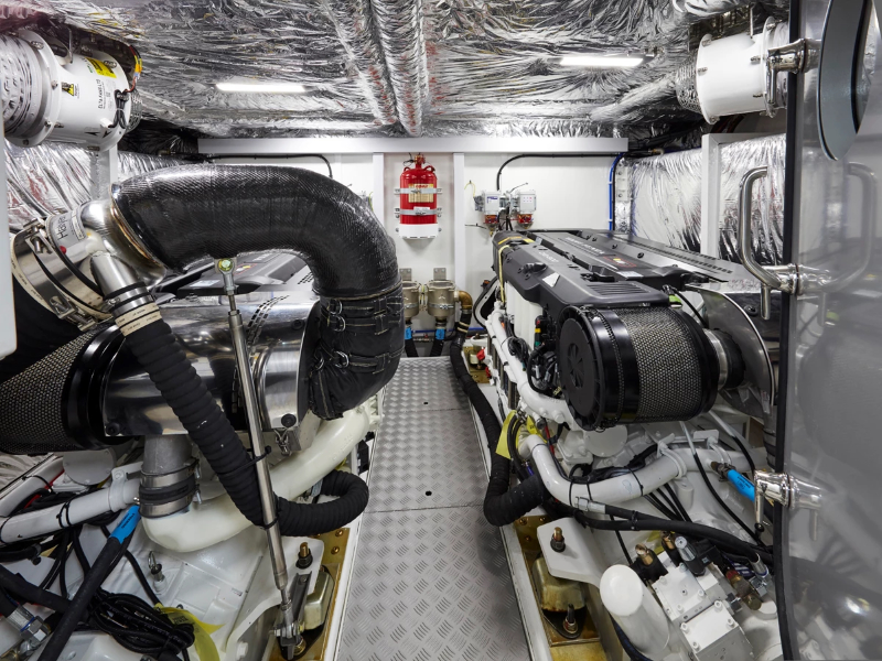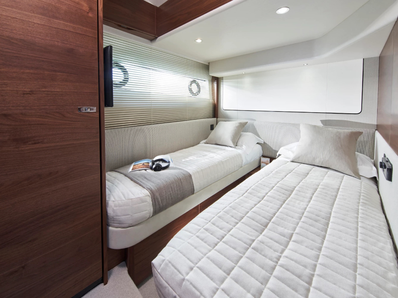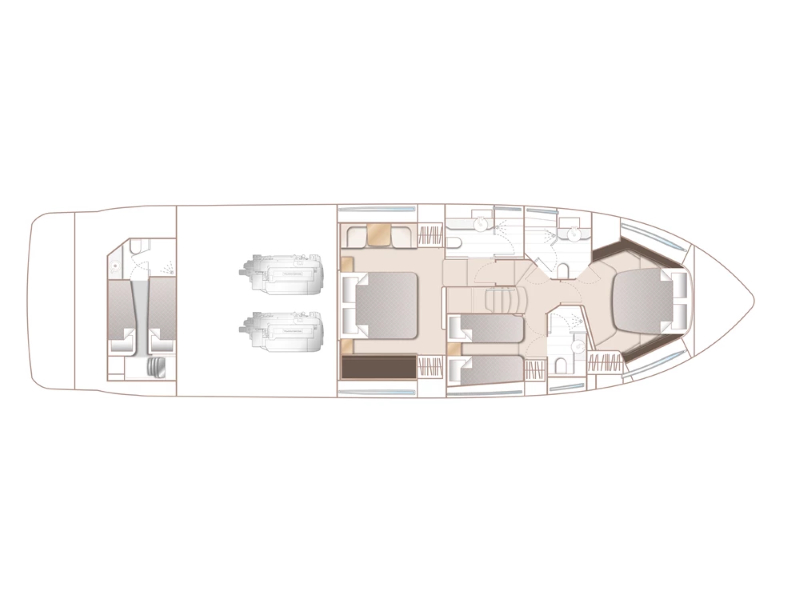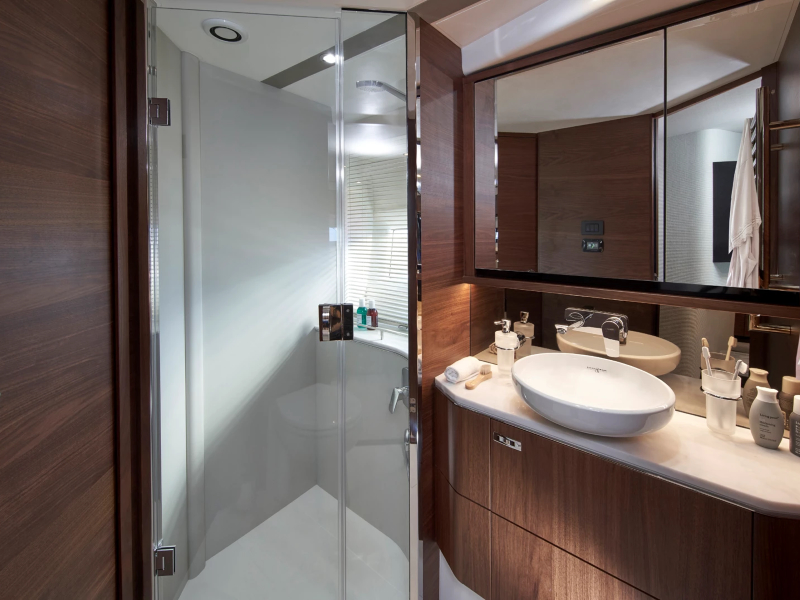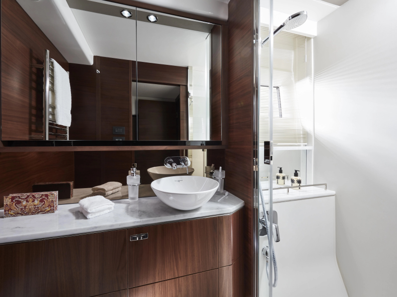 Her cavernous main deck saloon connects to the world outside through full length side windows, while her sociable galley is positioned aft and opens to the cockpit. The helm position is located to starboard with additional forward facing guest seating opposite. Below deck six guests enjoy three beautifully appointed en-suite cabins all bathed in natural light from elegant hull glazing, with the option of a further twin cabin aft for occasional guests or crew.