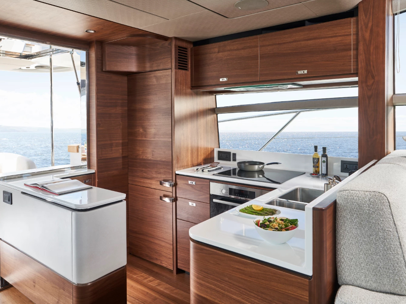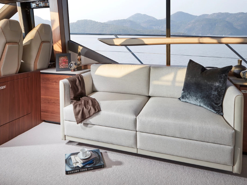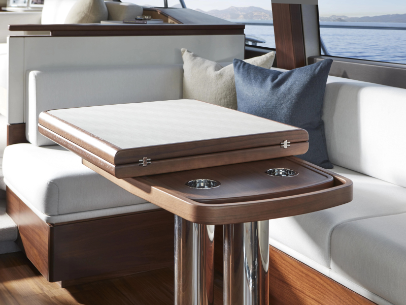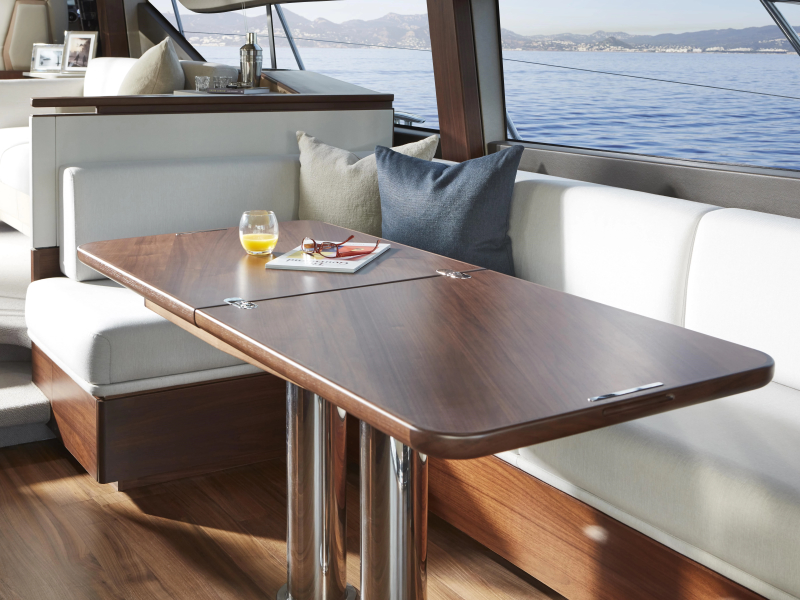 Her flybridge inspires relaxation with a large dining area a sunpad aft and a unique circular forward seating area that can be converted into an additional sunpad.