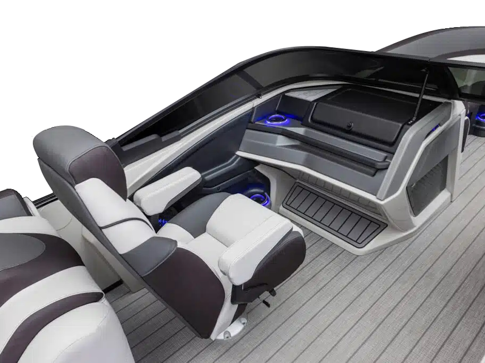 - Rear fishing center with 2 fishing chairs, rod holders & livewell (RF)