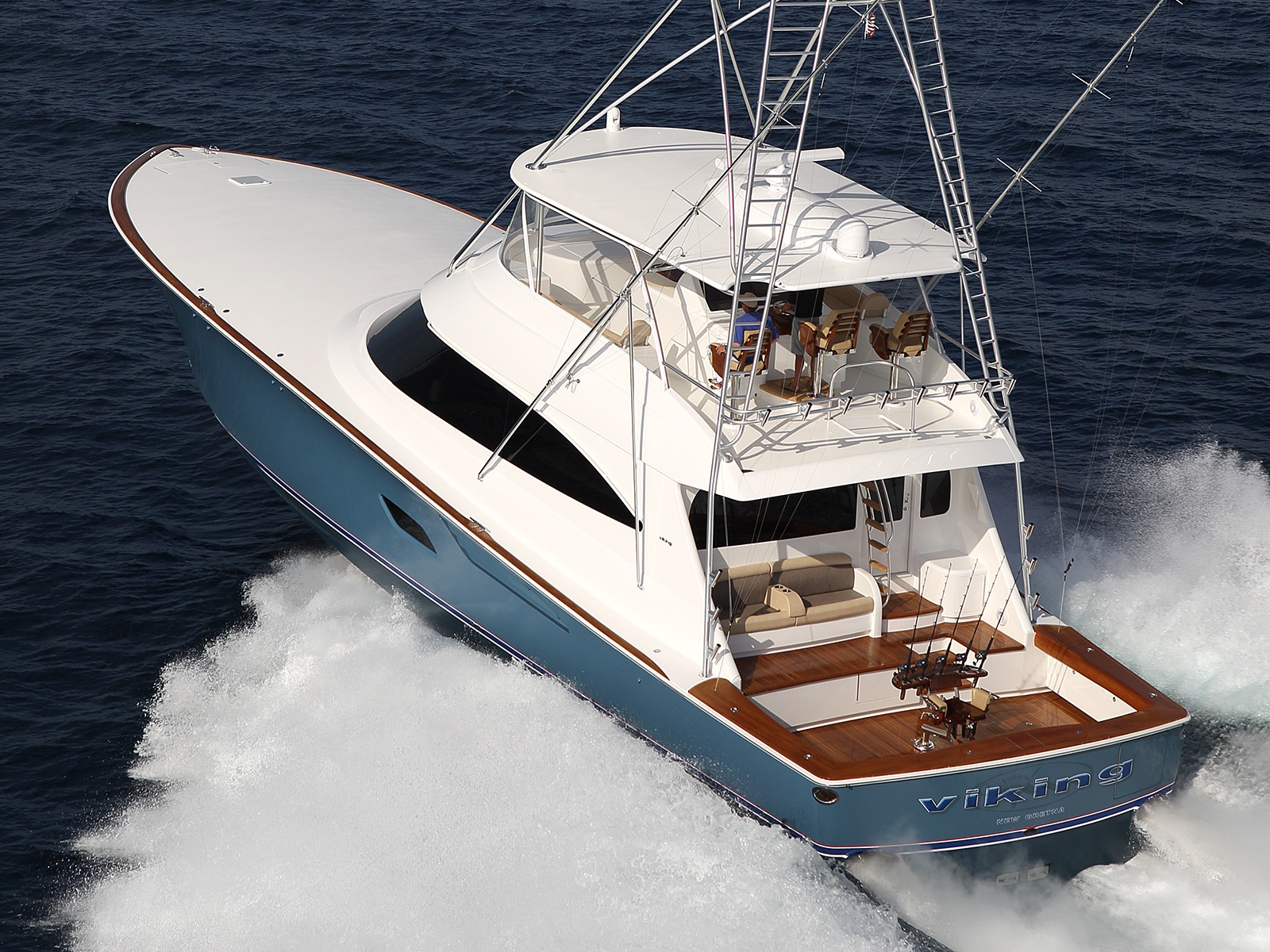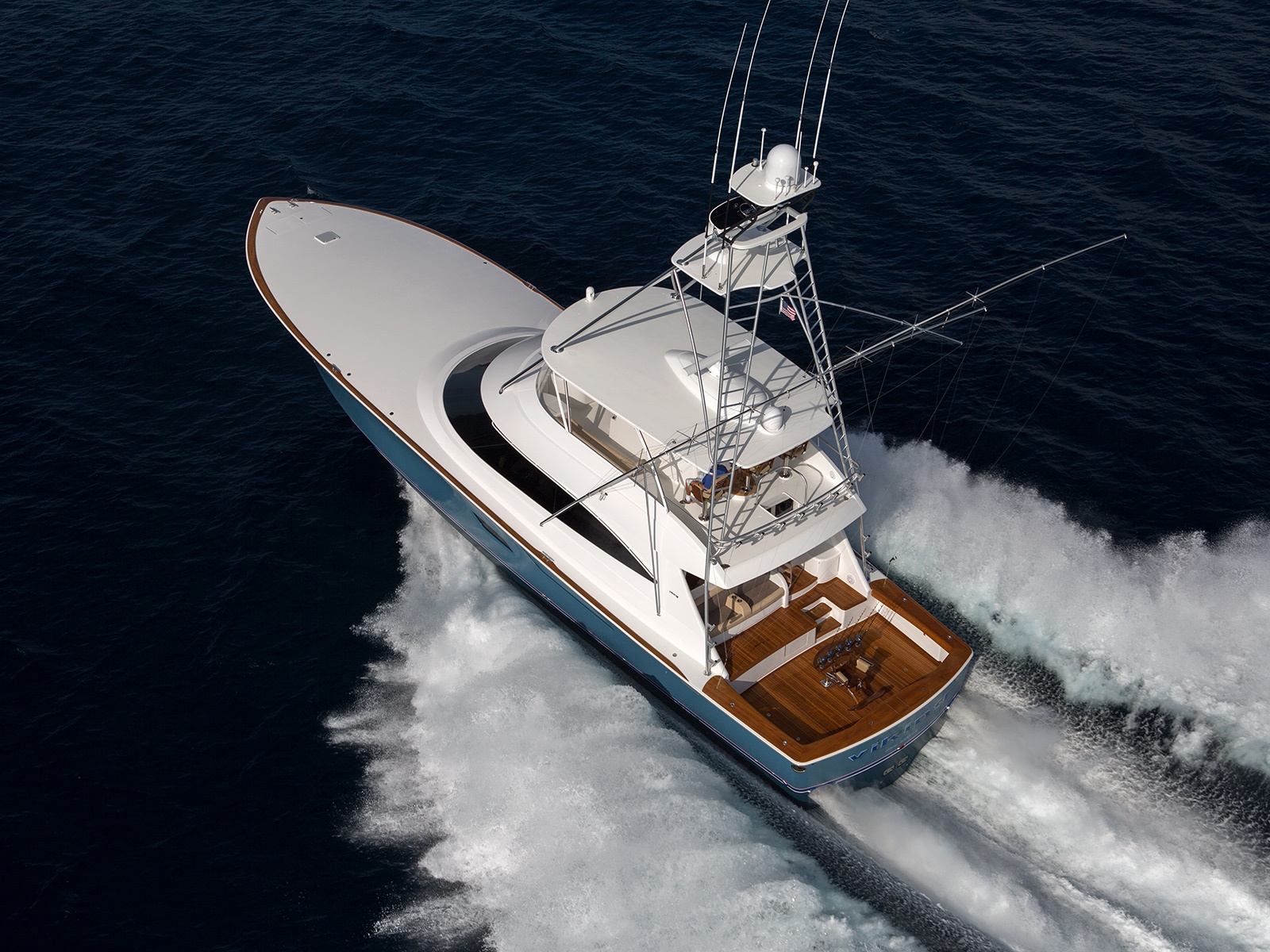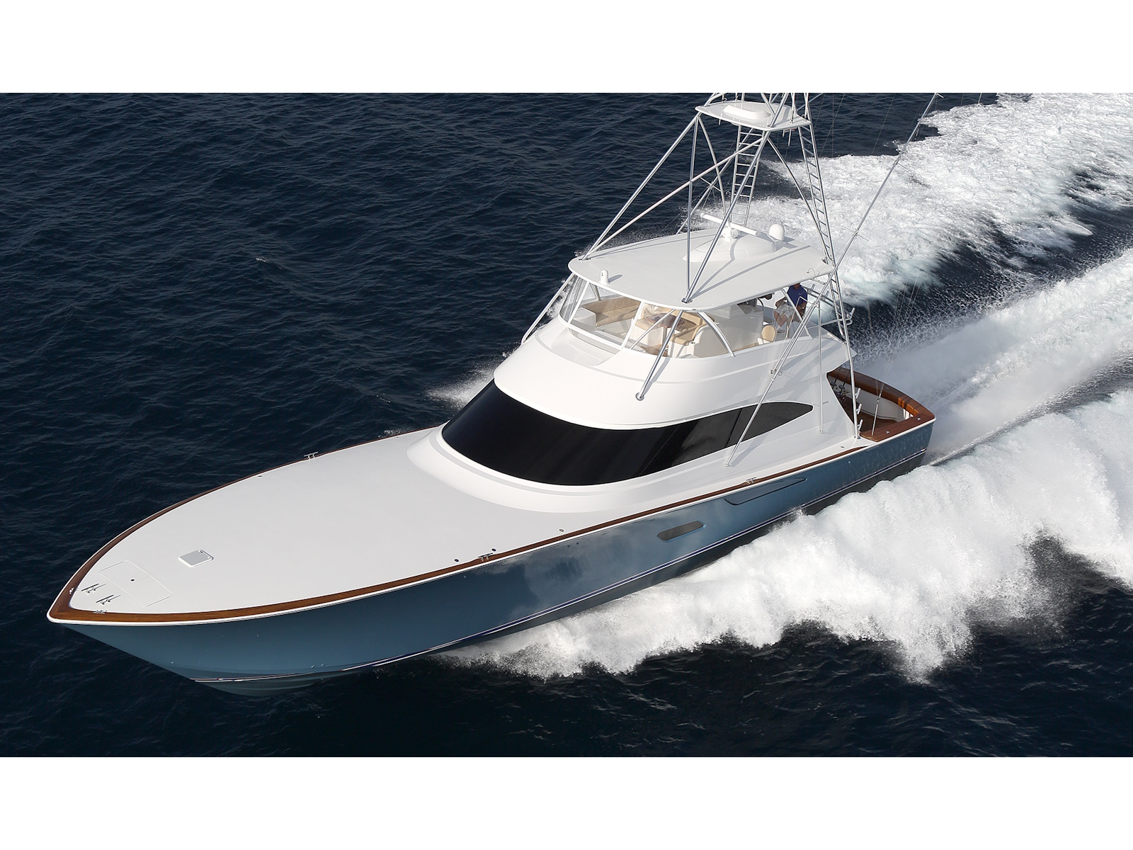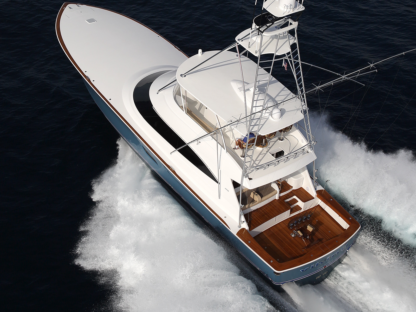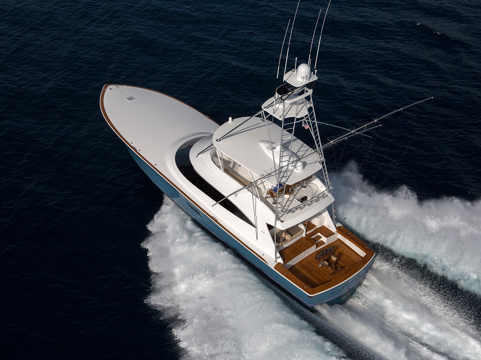 Like all Vikings, the 80 Convertible hones its blue-water DNA from its stable mates. The sleek styling showcases an impeccable sheer line with nine feet of freeboard forward tapering to slightly more than three feet at the stern, a lively reflection of the aggressive profiles of its recent brethren including the 92 and 72 Convertibles. The hull’s sharper entry merges with a higher forward chine designed to divert spray downward when ripping through head seas. Convex hull sections add curvature and form to the refined running surface, while a quad of molded running strakes accentuate lateral tracking and maneuverability. Tumblehome at the corners of the curved transom adds definition and beauty. Deadrise at the transom is 12.5 degrees and the beam is carried well aft providing exceptional volume, buoyancy and balance.