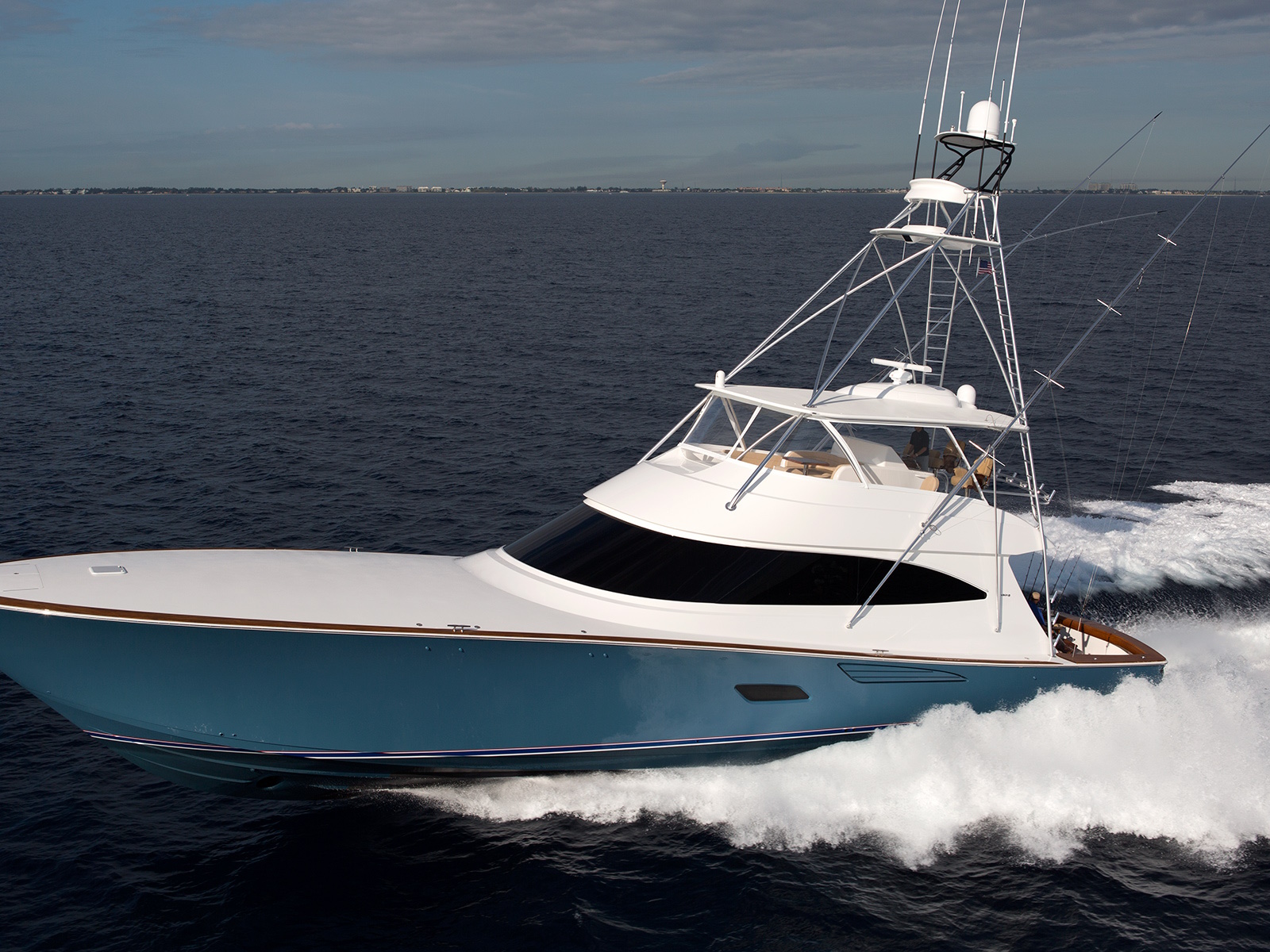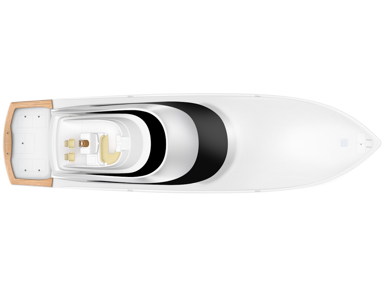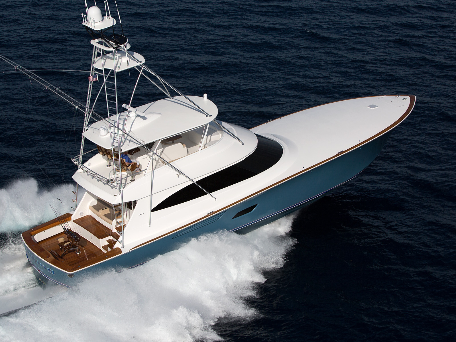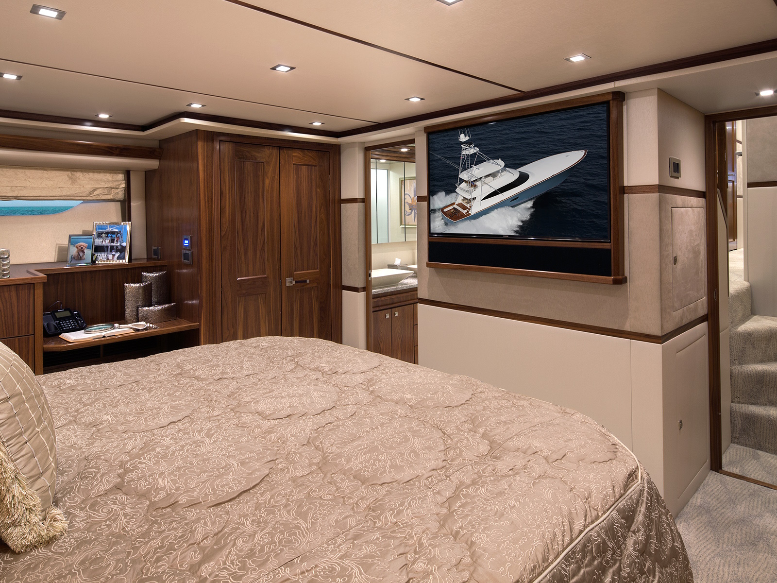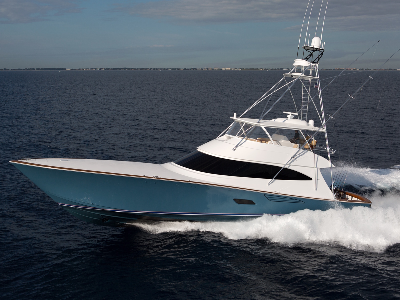 Like all Vikings, the 80 Convertible hones its blue-water DNA from its stable mates. The sleek styling showcases an impeccable sheer line with nine feet of freeboard forward tapering to slightly more than three feet at the stern, a lively reflection of the aggressive profiles of its recent brethren including the 92 and 72 Convertibles. The hull’s sharper entry merges with a higher forward chine designed to divert spray downward when ripping through head seas. Convex hull sections add curvature and form to the refined running surface, while a quad of molded running strakes accentuate lateral tracking and maneuverability. Tumblehome at the corners of the curved transom adds definition and beauty. Deadrise at the transom is 12.5 degrees and the beam is carried well aft providing exceptional volume, buoyancy and balance.