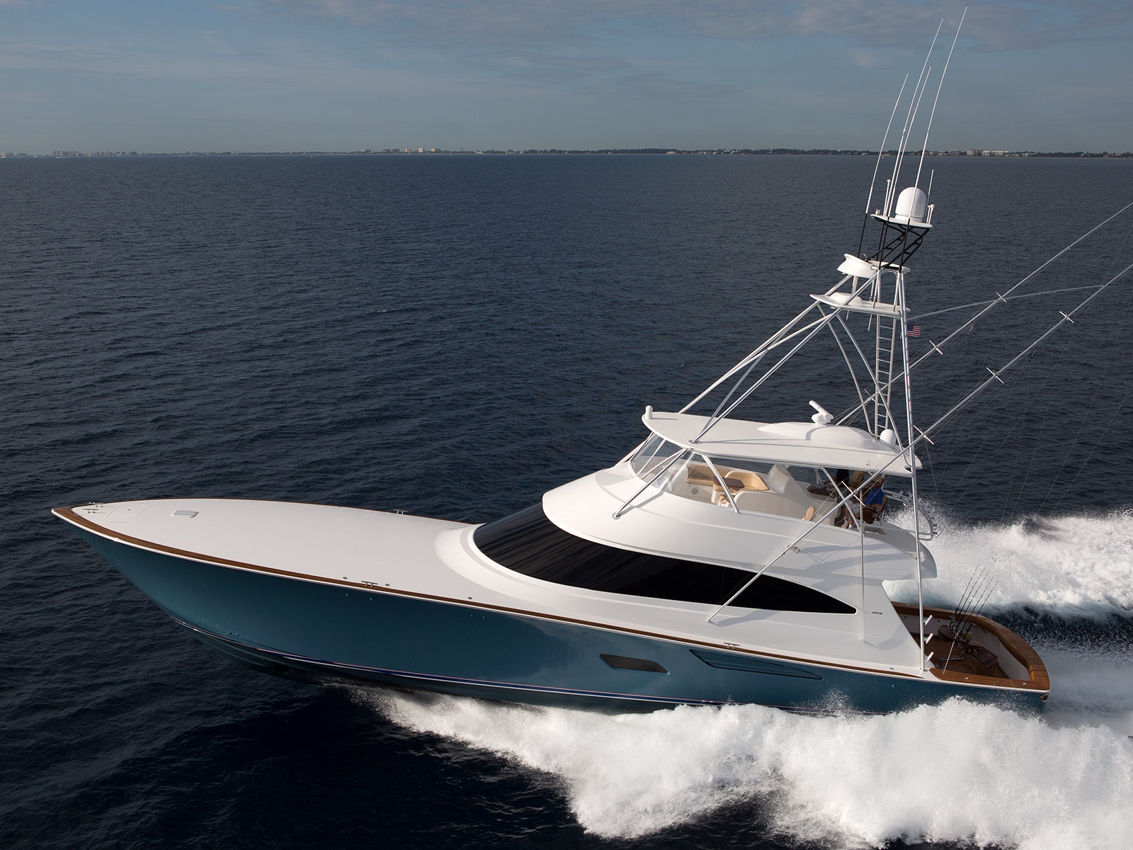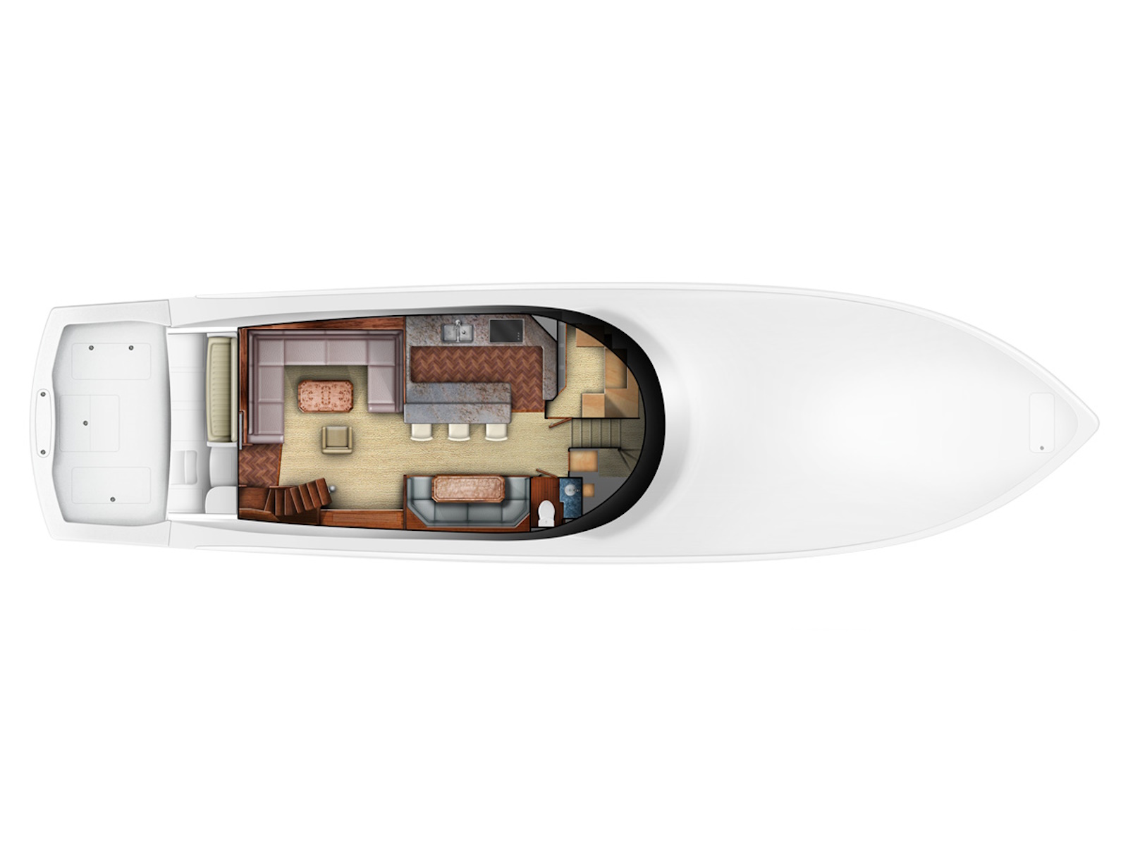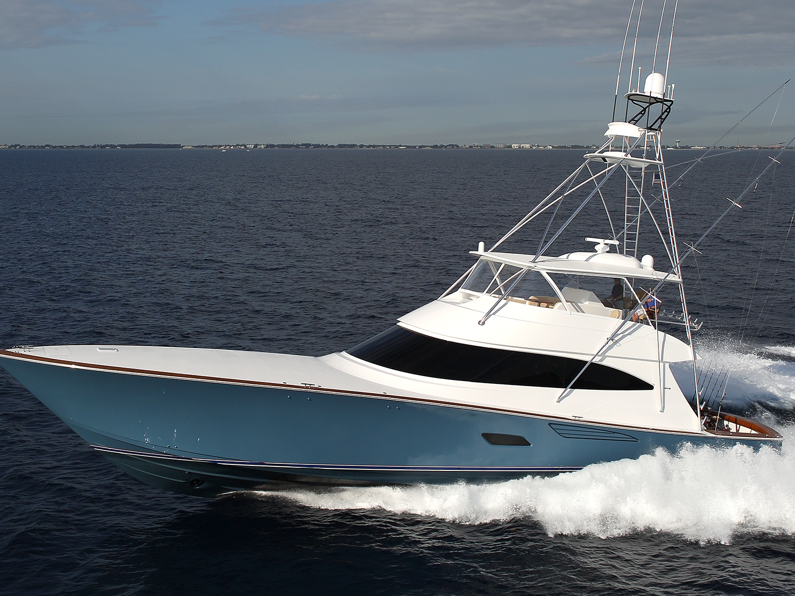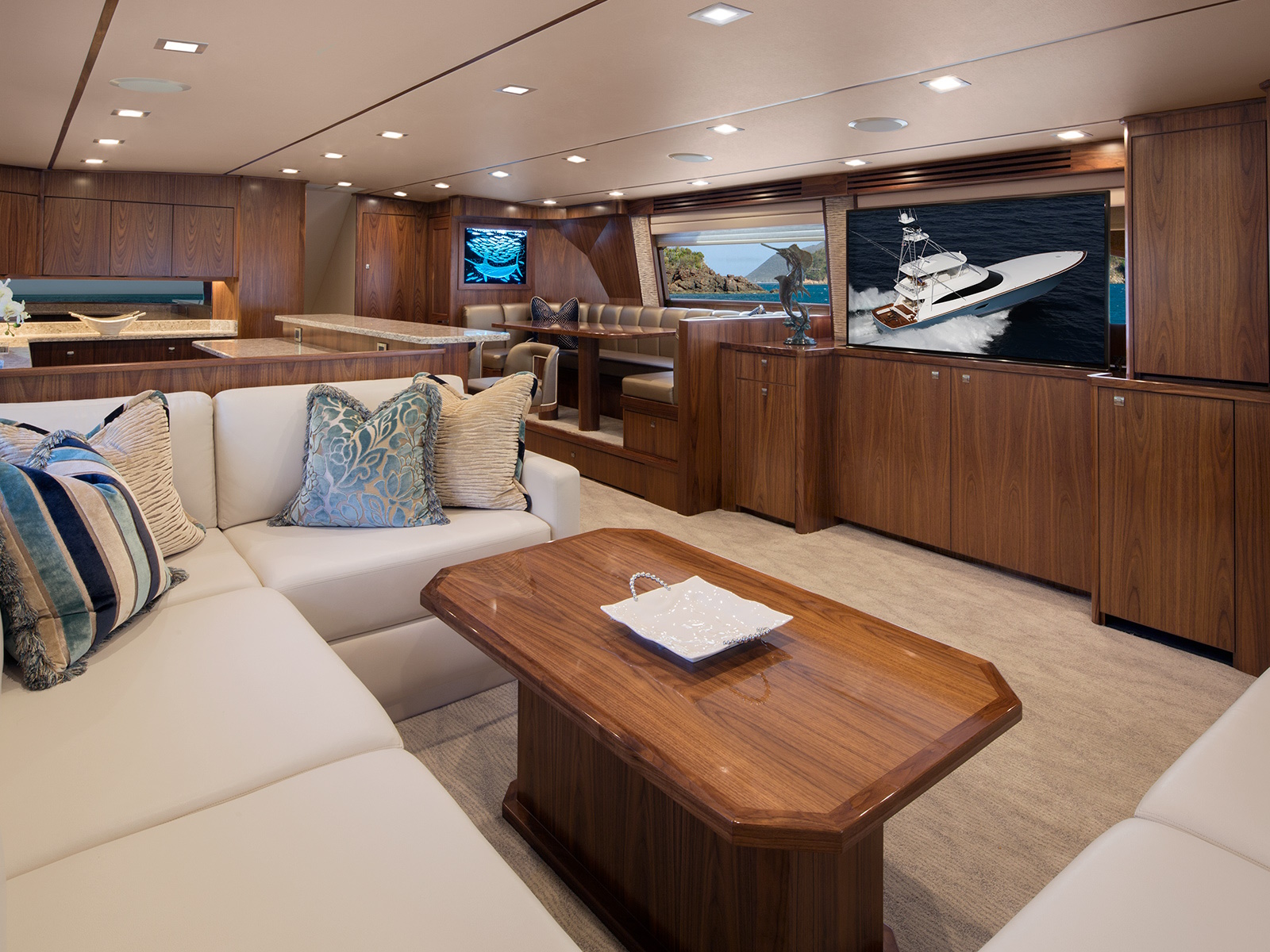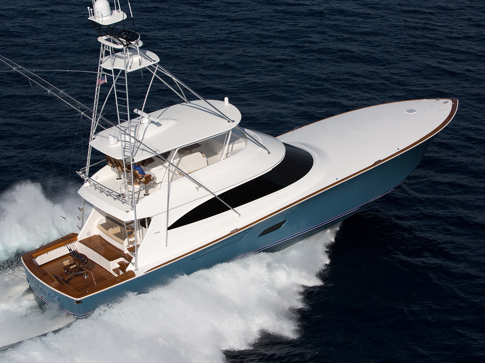Like all Vikings, the 80 Convertible hones its blue-water DNA from its stable mates. The sleek styling showcases an impeccable sheer line with nine feet of freeboard forward tapering to slightly more than three feet at the stern, a lively reflection of the aggressive profiles of its recent brethren including the 92 and 72 Convertibles. The hull’s sharper entry merges with a higher forward chine designed to divert spray downward when ripping through head seas. Convex hull sections add curvature and form to the refined running surface, while a quad of molded running strakes accentuate lateral tracking and maneuverability. Tumblehome at the corners of the curved transom adds definition and beauty. Deadrise at the transom is 12.5 degrees and the beam is carried well aft providing exceptional volume, buoyancy and balance.