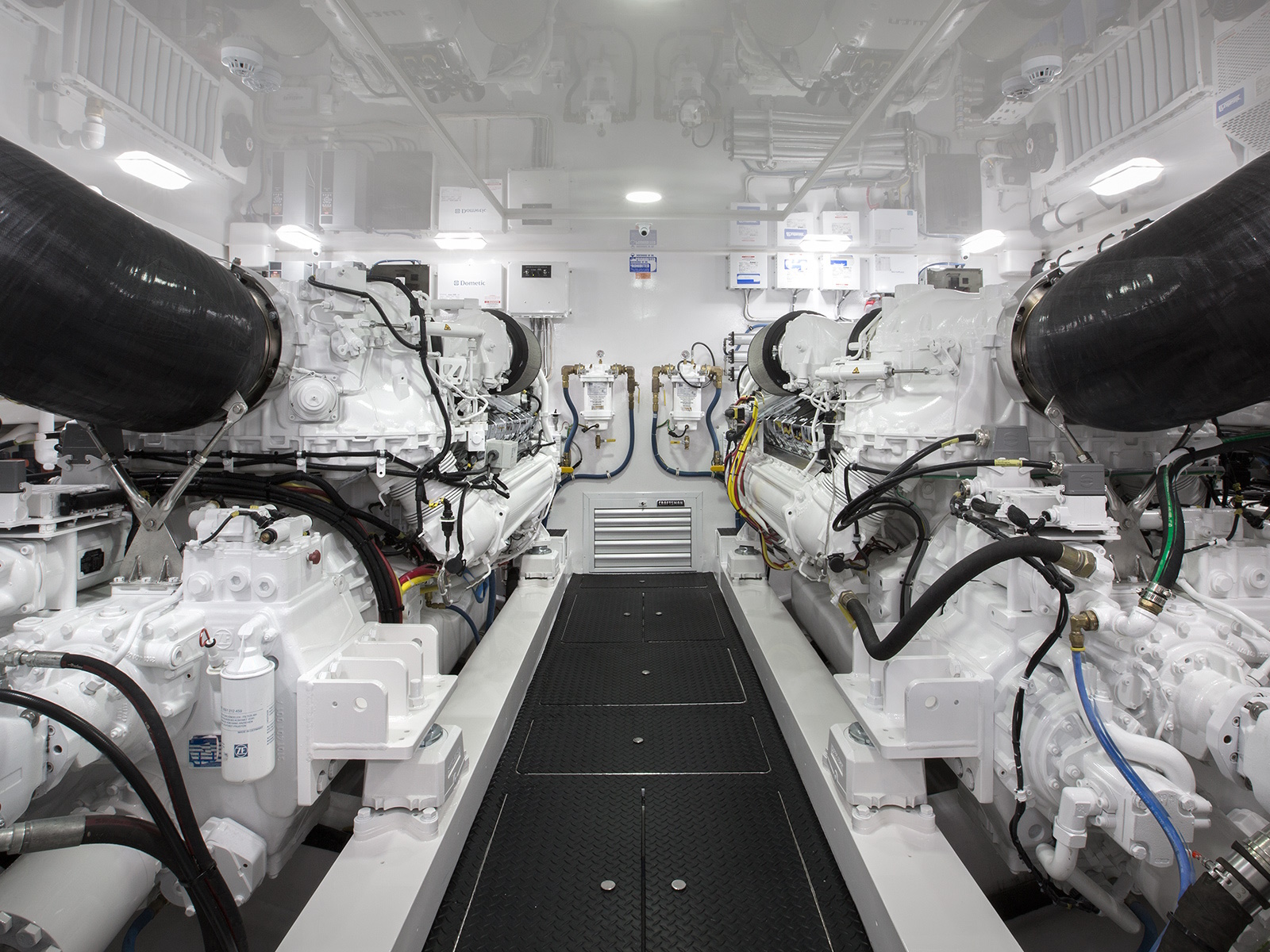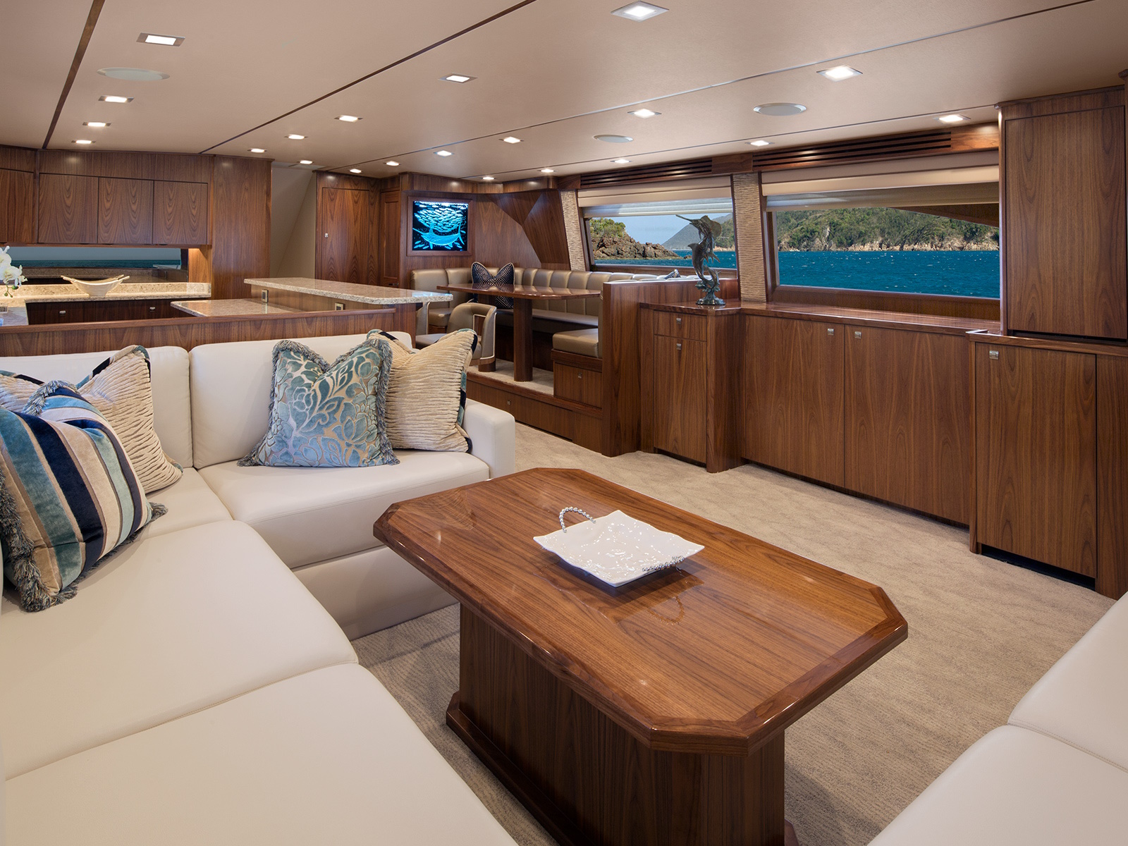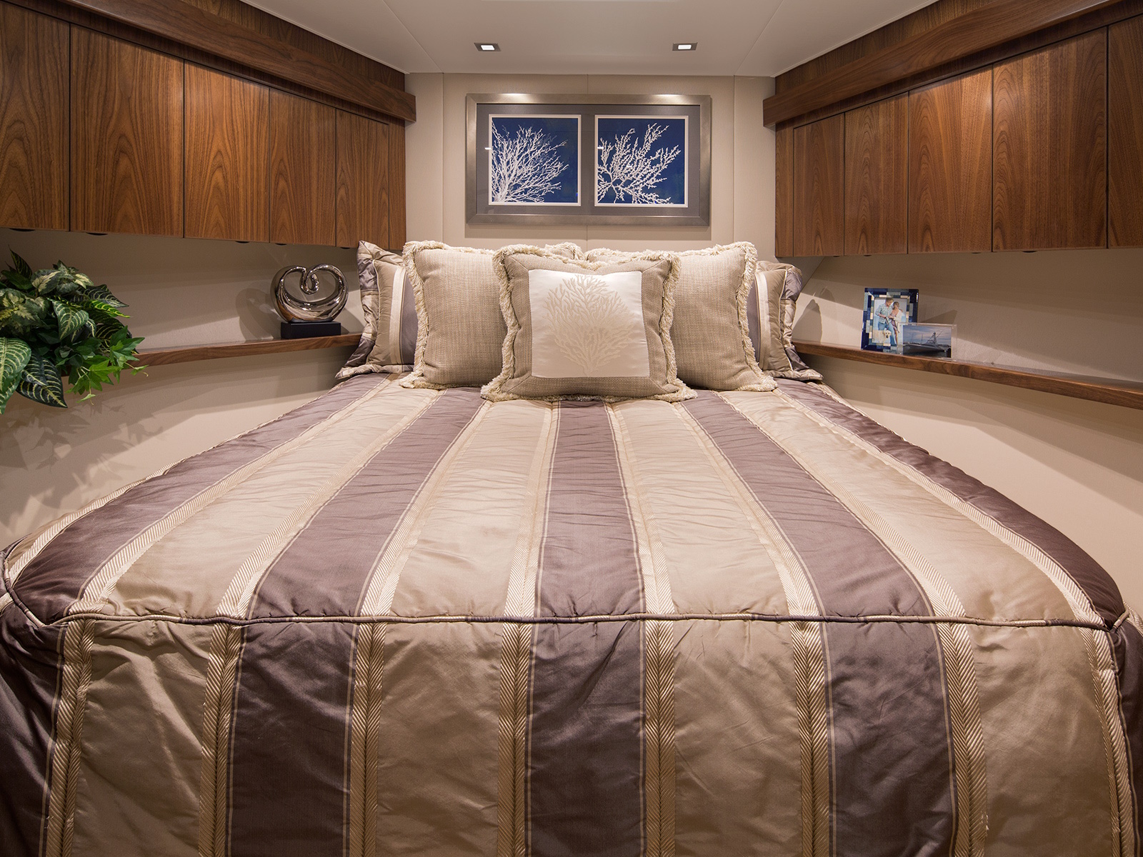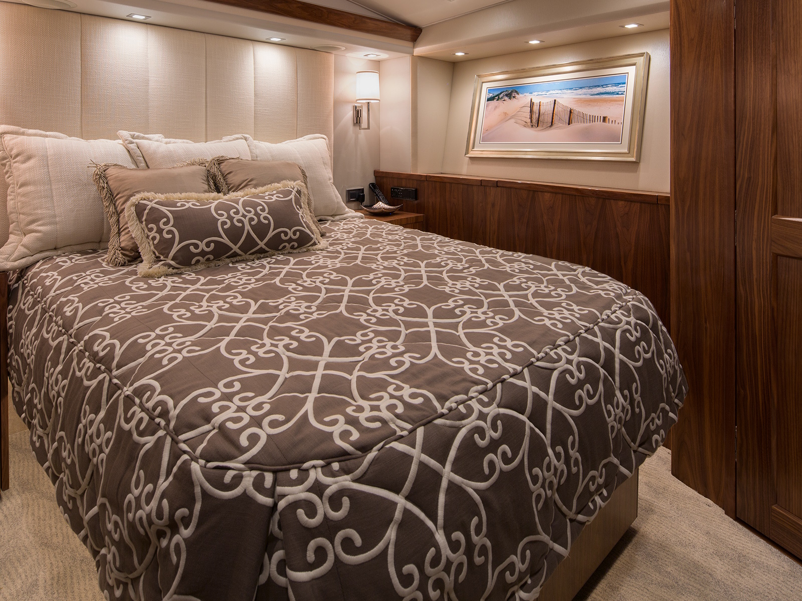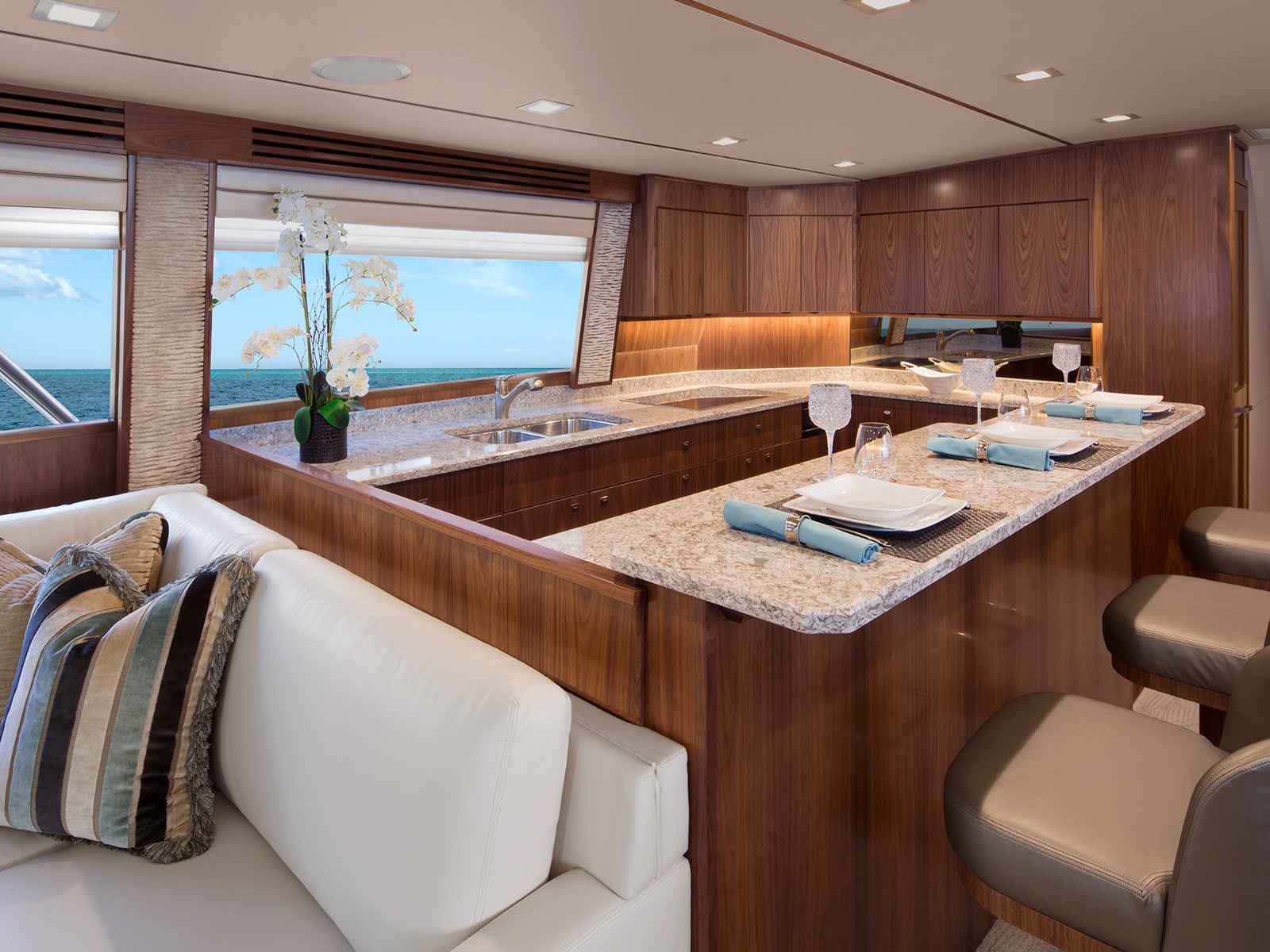 Like all Vikings, the 80 Convertible hones its blue-water DNA from its stable mates. The sleek styling showcases an impeccable sheer line with nine feet of freeboard forward tapering to slightly more than three feet at the stern, a lively reflection of the aggressive profiles of its recent brethren including the 92 and 72 Convertibles. The hull’s sharper entry merges with a higher forward chine designed to divert spray downward when ripping through head seas. Convex hull sections add curvature and form to the refined running surface, while a quad of molded running strakes accentuate lateral tracking and maneuverability. Tumblehome at the corners of the curved transom adds definition and beauty. Deadrise at the transom is 12.5 degrees and the beam is carried well aft providing exceptional volume, buoyancy and balance.