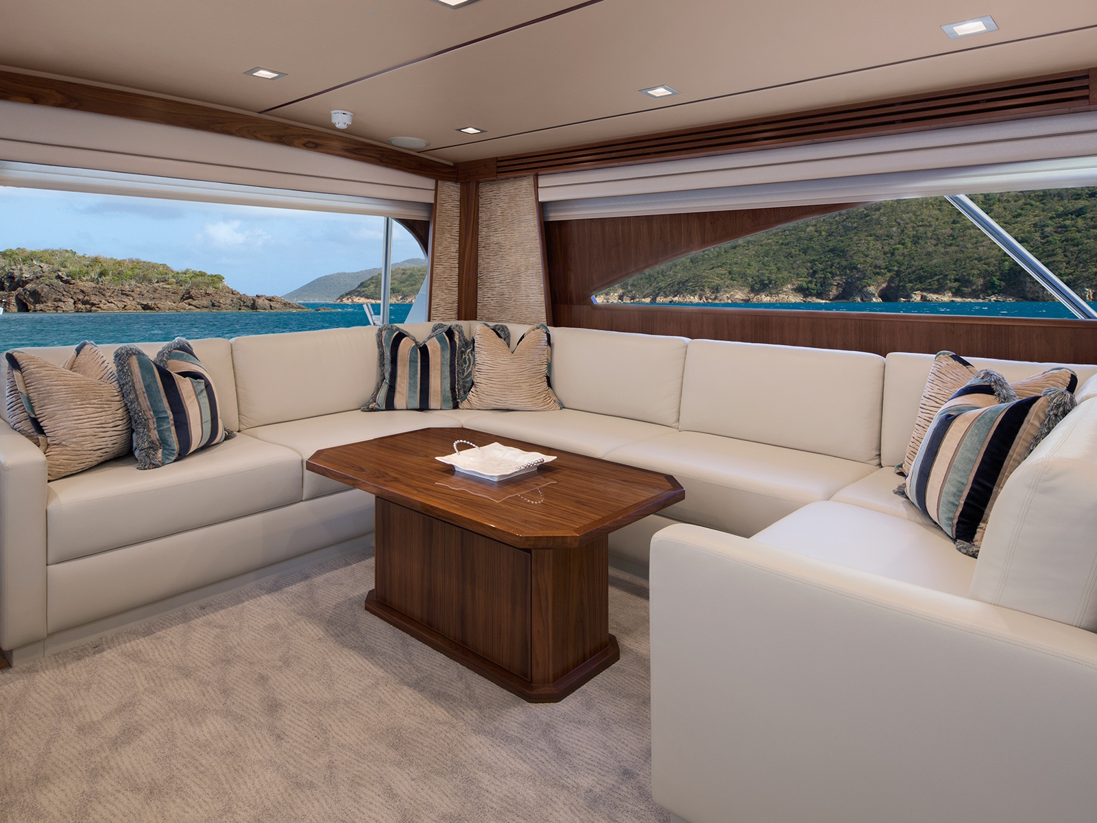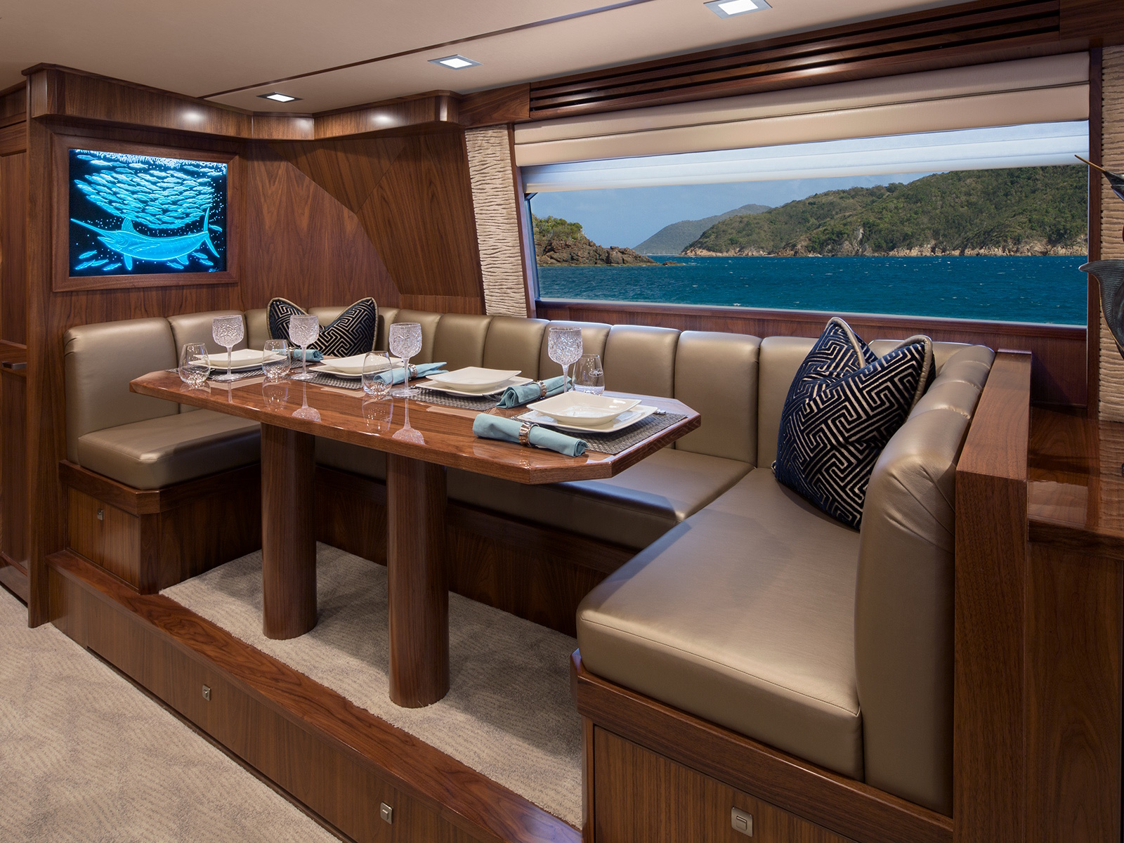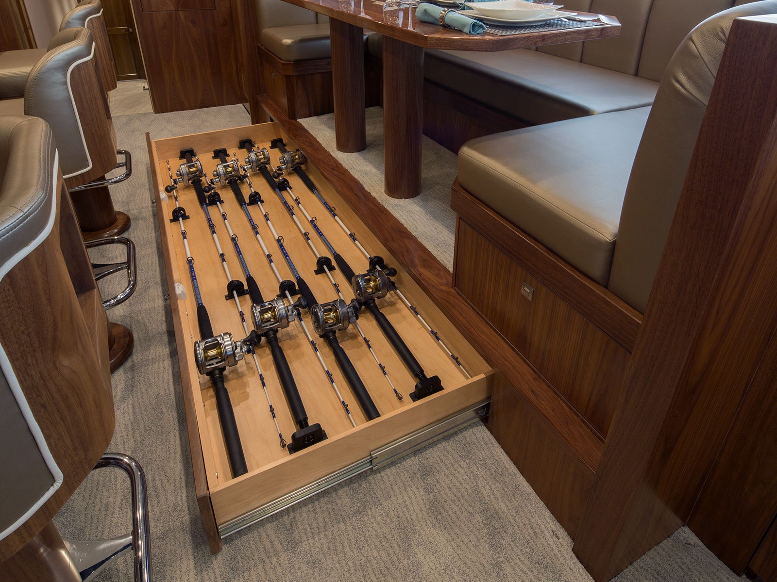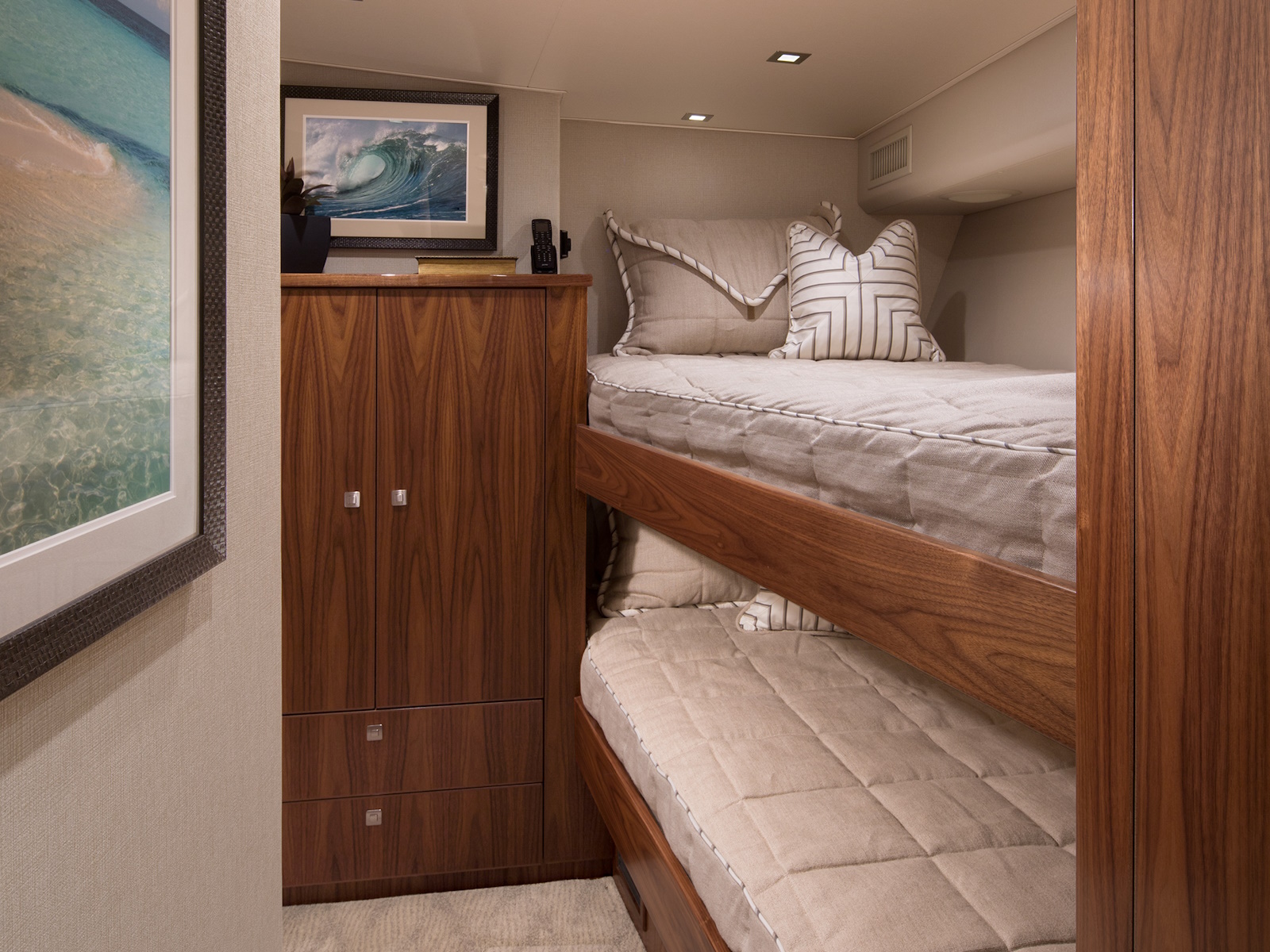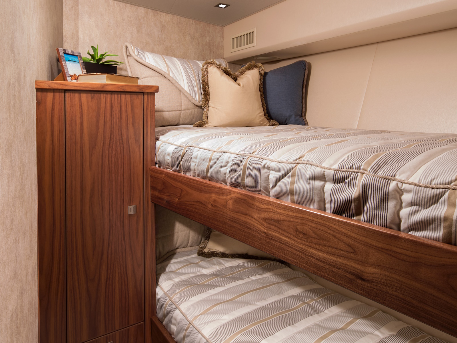 Like all Vikings, the 80 Convertible hones its blue-water DNA from its stable mates. The sleek styling showcases an impeccable sheer line with nine feet of freeboard forward tapering to slightly more than three feet at the stern, a lively reflection of the aggressive profiles of its recent brethren including the 92 and 72 Convertibles. The hull’s sharper entry merges with a higher forward chine designed to divert spray downward when ripping through head seas. Convex hull sections add curvature and form to the refined running surface, while a quad of molded running strakes accentuate lateral tracking and maneuverability. Tumblehome at the corners of the curved transom adds definition and beauty. Deadrise at the transom is 12.5 degrees and the beam is carried well aft providing exceptional volume, buoyancy and balance.