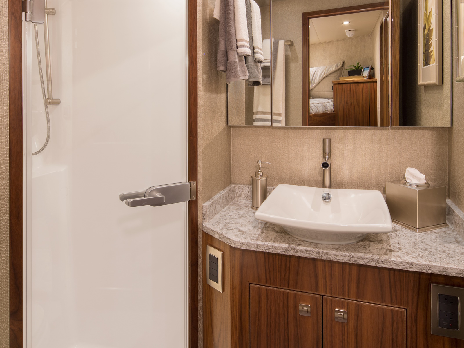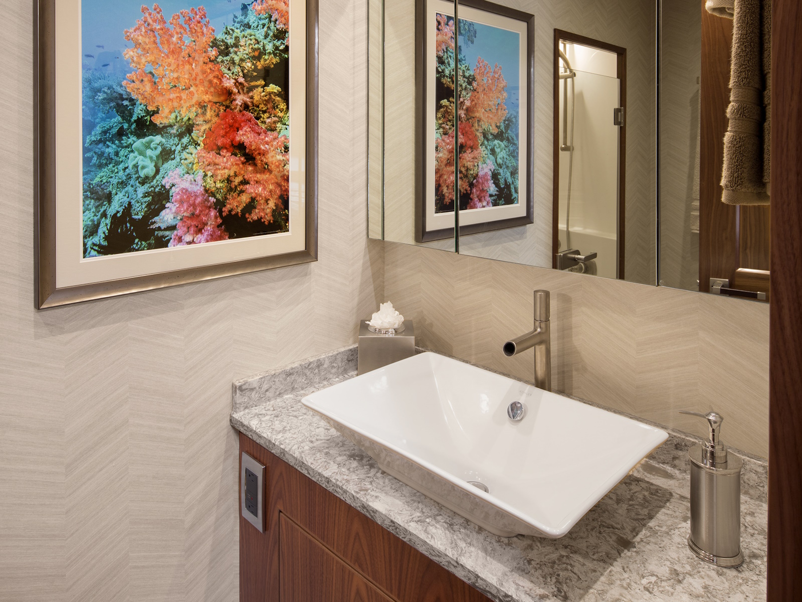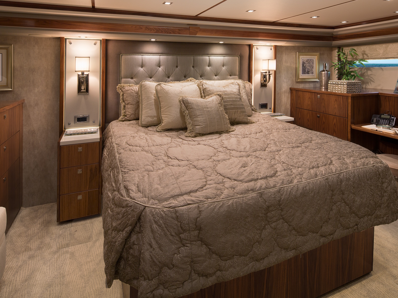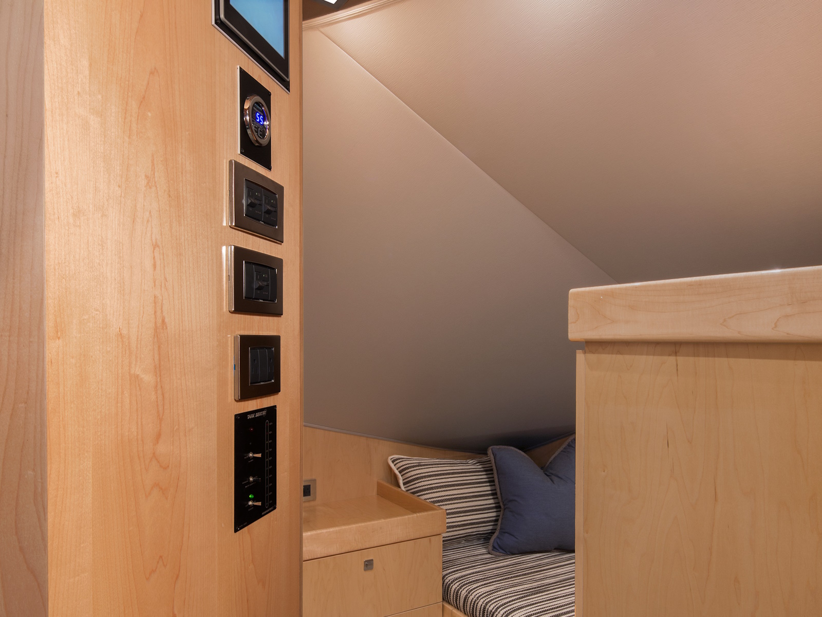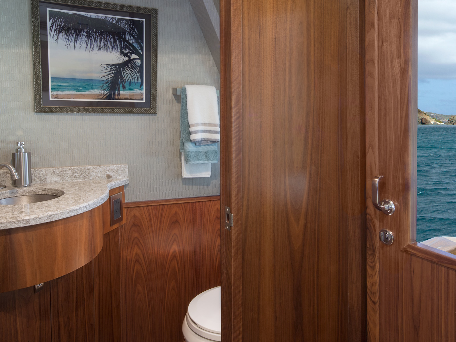 Like all Vikings, the 80 Convertible hones its blue-water DNA from its stable mates. The sleek styling showcases an impeccable sheer line with nine feet of freeboard forward tapering to slightly more than three feet at the stern, a lively reflection of the aggressive profiles of its recent brethren including the 92 and 72 Convertibles. The hull’s sharper entry merges with a higher forward chine designed to divert spray downward when ripping through head seas. Convex hull sections add curvature and form to the refined running surface, while a quad of molded running strakes accentuate lateral tracking and maneuverability. Tumblehome at the corners of the curved transom adds definition and beauty. Deadrise at the transom is 12.5 degrees and the beam is carried well aft providing exceptional volume, buoyancy and balance.