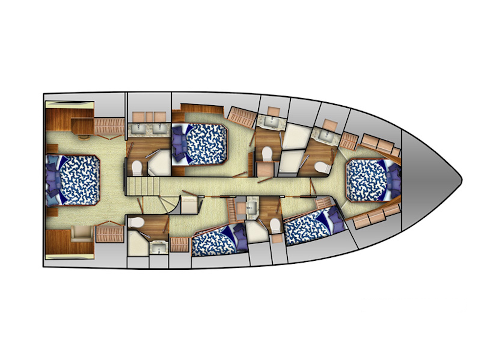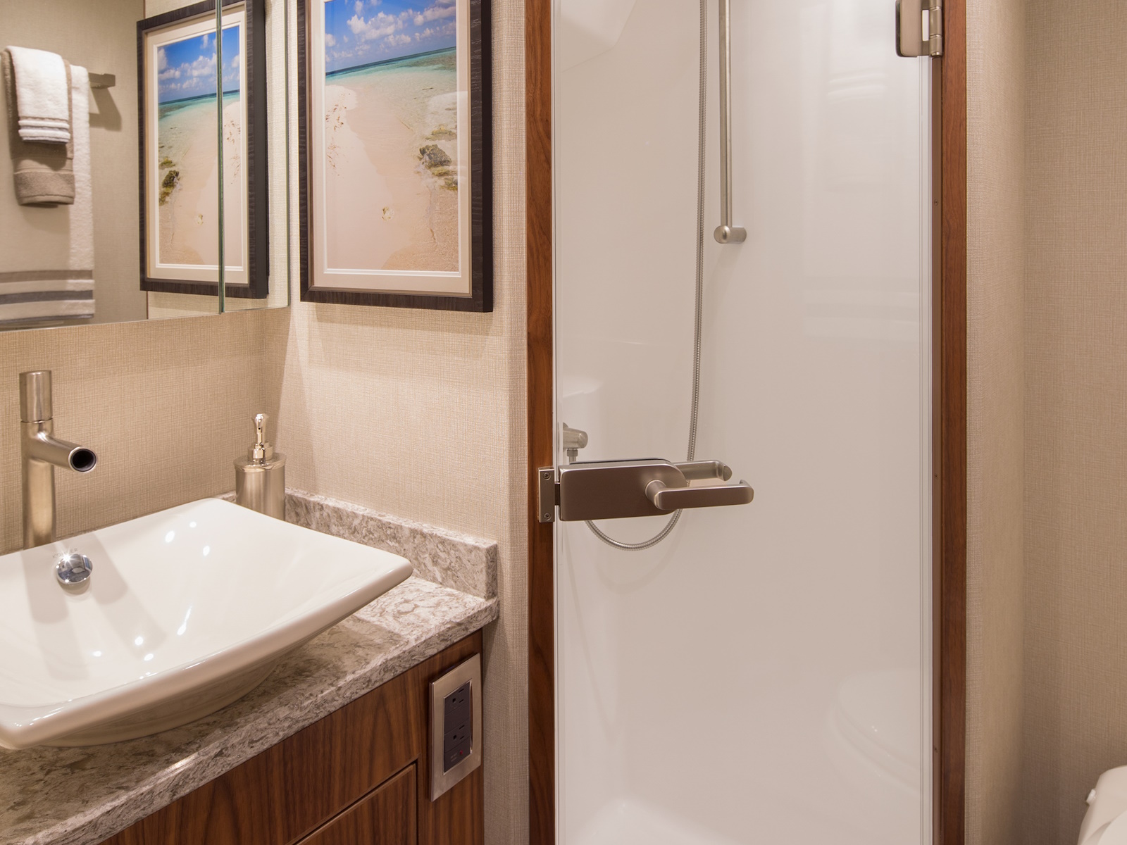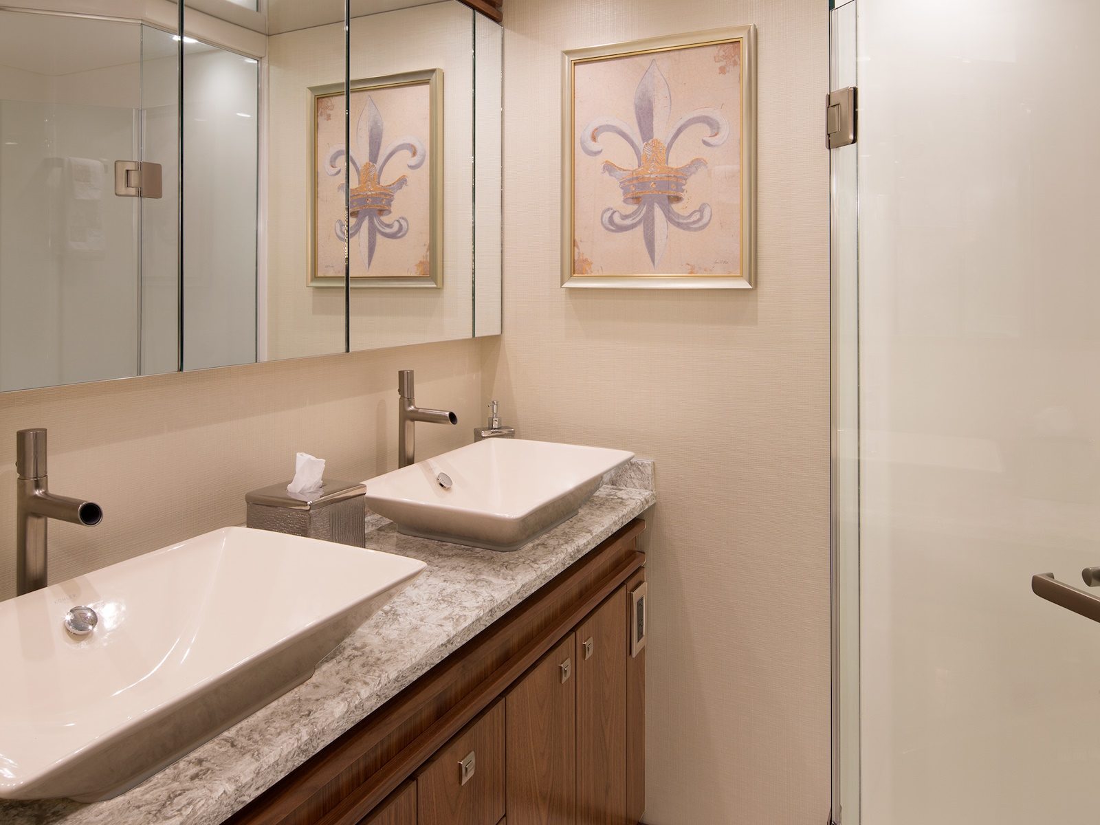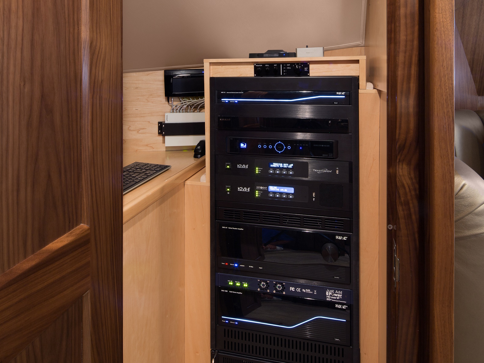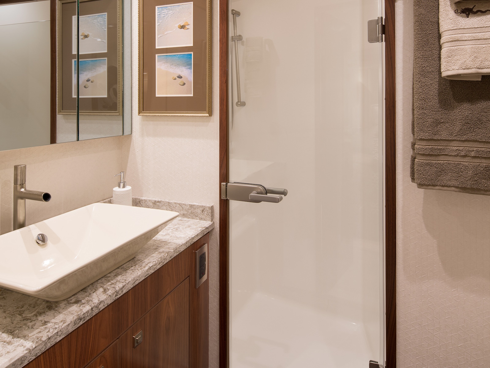 Like all Vikings, the 80 Convertible hones its blue-water DNA from its stable mates. The sleek styling showcases an impeccable sheer line with nine feet of freeboard forward tapering to slightly more than three feet at the stern, a lively reflection of the aggressive profiles of its recent brethren including the 92 and 72 Convertibles. The hull’s sharper entry merges with a higher forward chine designed to divert spray downward when ripping through head seas. Convex hull sections add curvature and form to the refined running surface, while a quad of molded running strakes accentuate lateral tracking and maneuverability. Tumblehome at the corners of the curved transom adds definition and beauty. Deadrise at the transom is 12.5 degrees and the beam is carried well aft providing exceptional volume, buoyancy and balance.