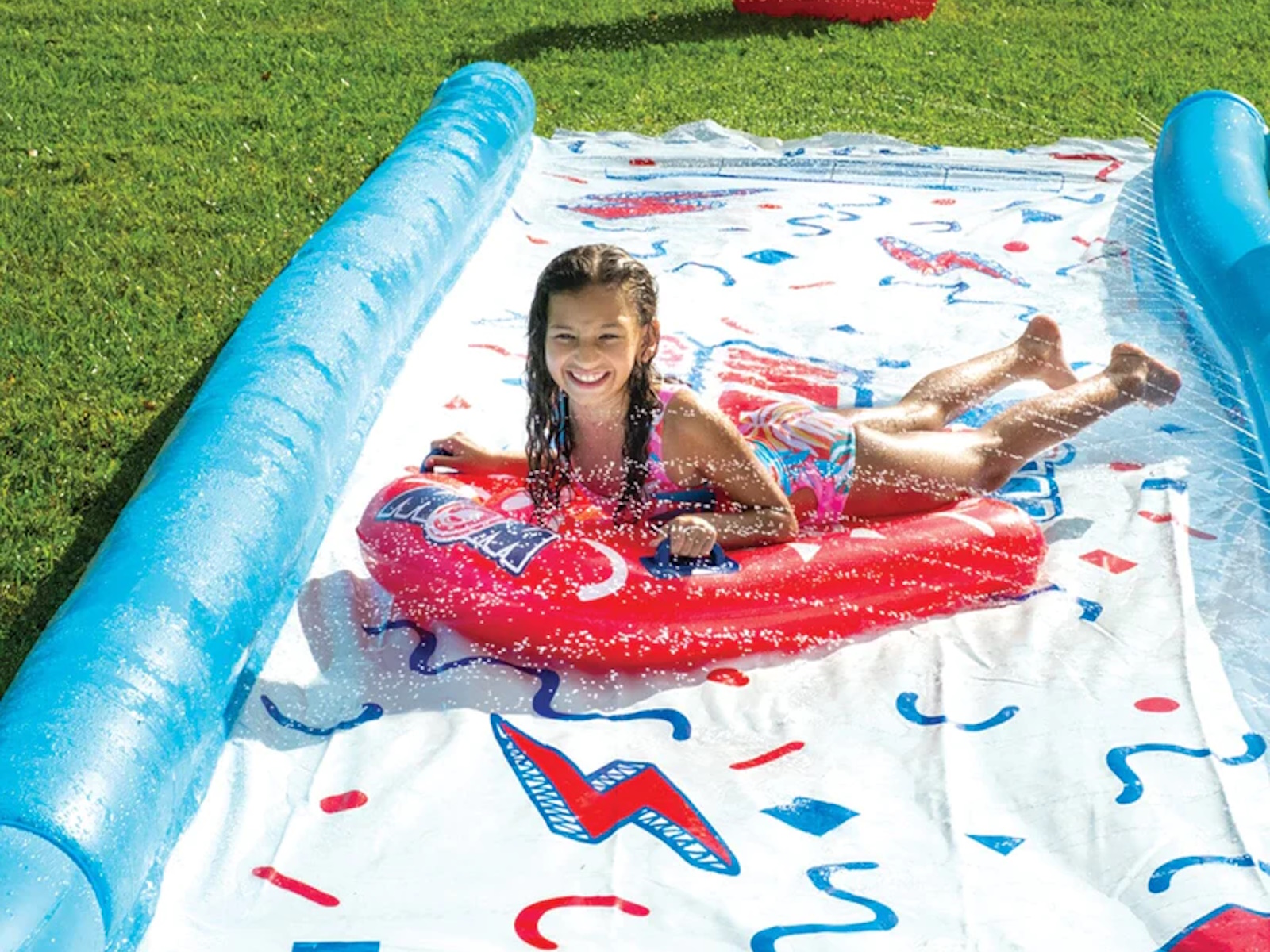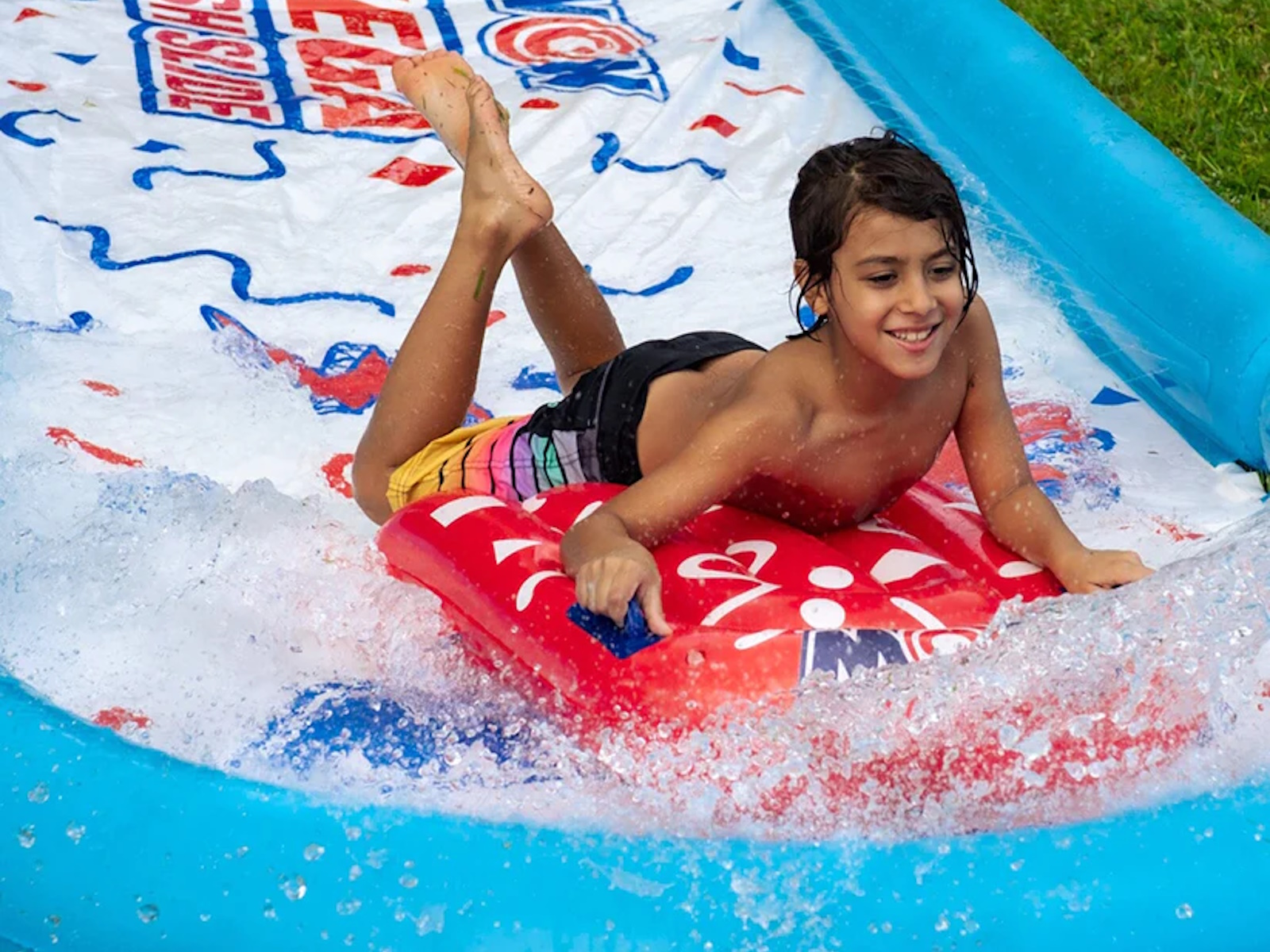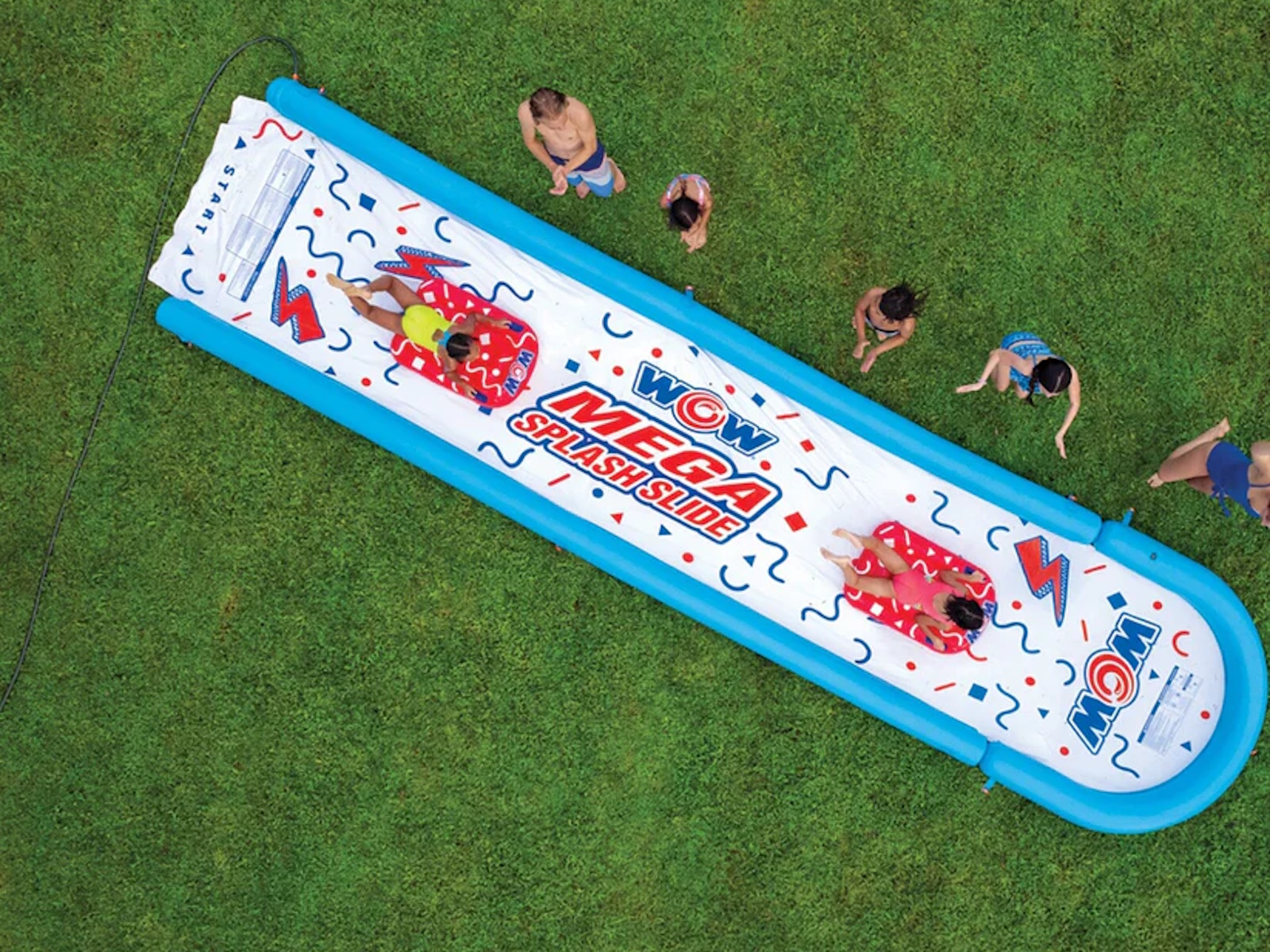 Looking for something special for your kid’s next backyard birthday party? We think we have the perfect party favor for you. The WOW Mega Splash Slide is a giant 25 FT x 6 FT water slide with splash pool for the lawn that will keep the kids entertained all afternoon long. We got tired of all the cheap lawn water slides out there that were lucky to last a whole day, so we decided to build our own and back it by our WOW 1-year warranty. The WOW Mega Splash Slide is made from extra thick, heavy-duty, super-slick embossed PVC, so no need to add dish soap to keep this slide slippery. Our zig zag patterned, full length embedded sprinkler system, connects to the standard backyard hose, runs the length of the slide and has 100% water coverage so no dry spots. We also installed side wall pontoons to keep the water on the slide as well as your kids! Our favorite feature is the large splash pool at the end of the slide to keep you wet and soaked all summer long! Each slide comes with 2 Mega Sleds to cushion the fall and make the slide even more slippery. You have everything you need to put on a great summer backyard party for your kids.