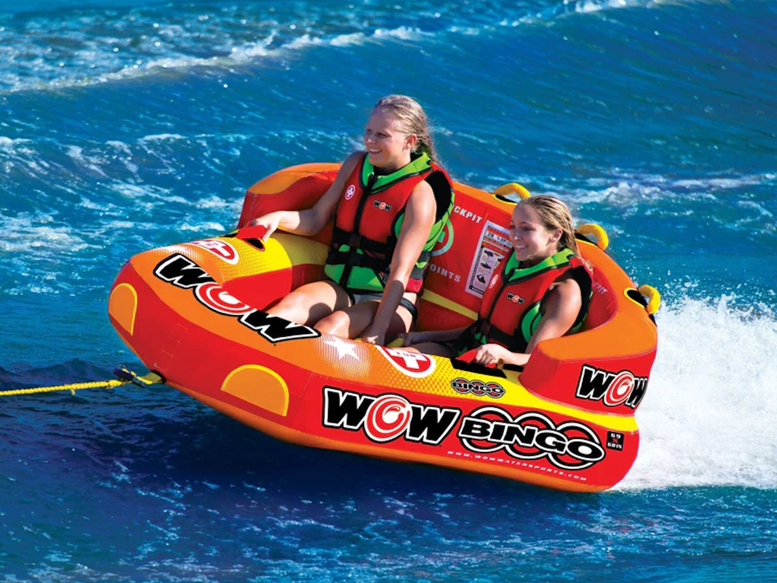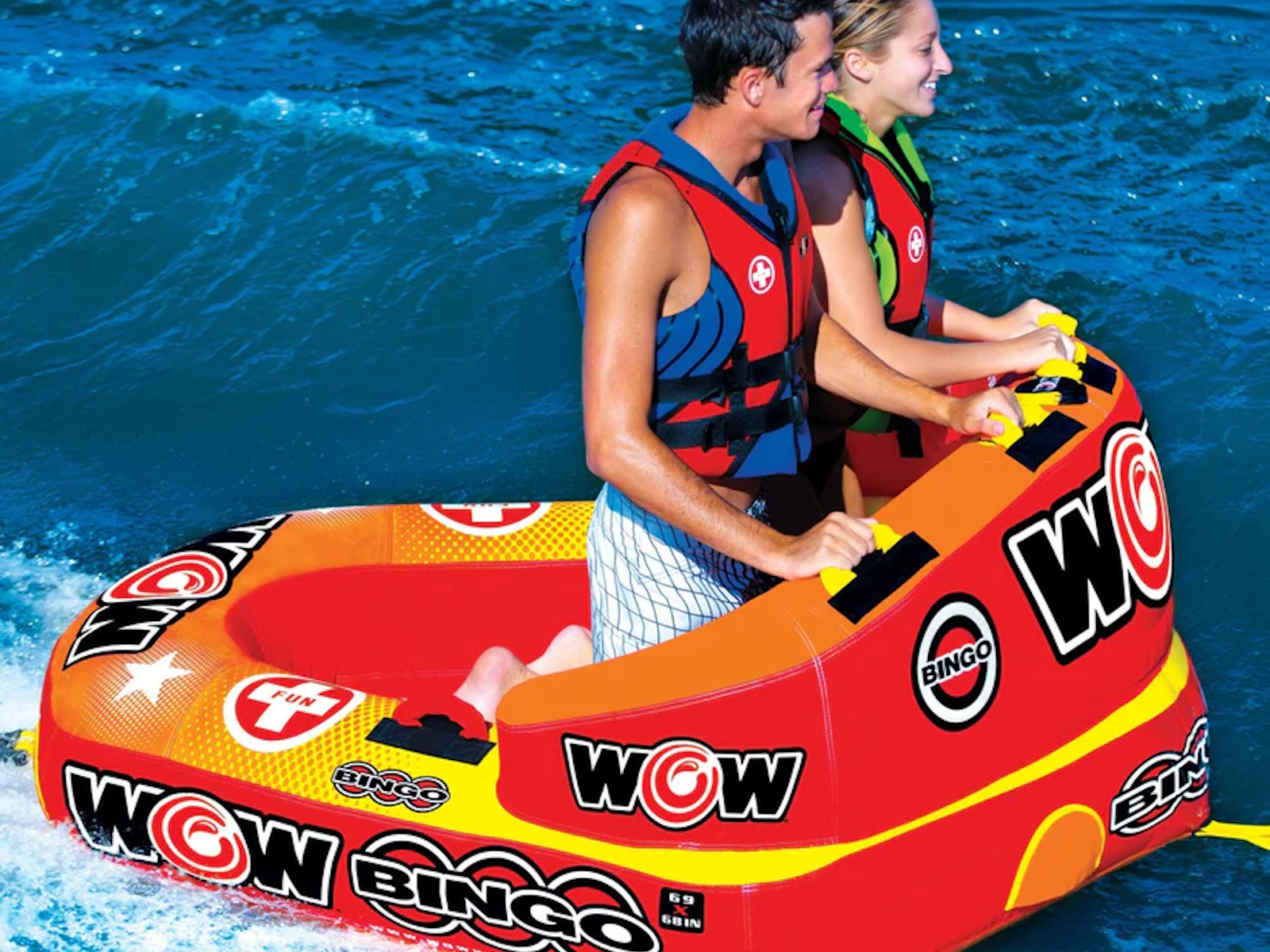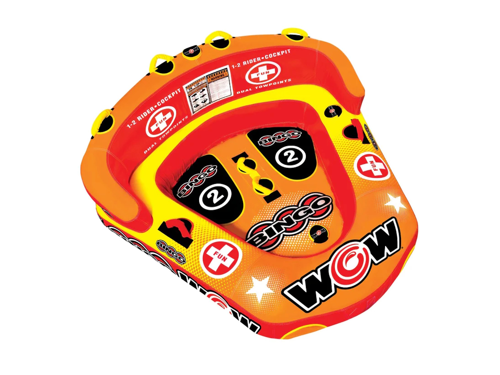 The Bingo 2 was specifically designed with family fun in mind. Another original design from WOW, this action packed towable gives your family 2 rides for the price of 1. The Bingo tubes are the only cockpit tubes on the market with front and back tow points. Ride in the seated position from the front tow point or connect the rope to the back tow point and ride chariot style. The Bingo comes with a free 11" 4K EZ tow connector which makes it simple to switch tow points even while on the water. The deep cockpit seating with high backrest makes the riders feel more secure while the new drop speed bottom glides smoothly over the water creating less drag on the boat and therefore better gas mileage. The Bingo 2 will be loved by everyone in the family; from those that like a nice and easy ride to those that want something more extreme.