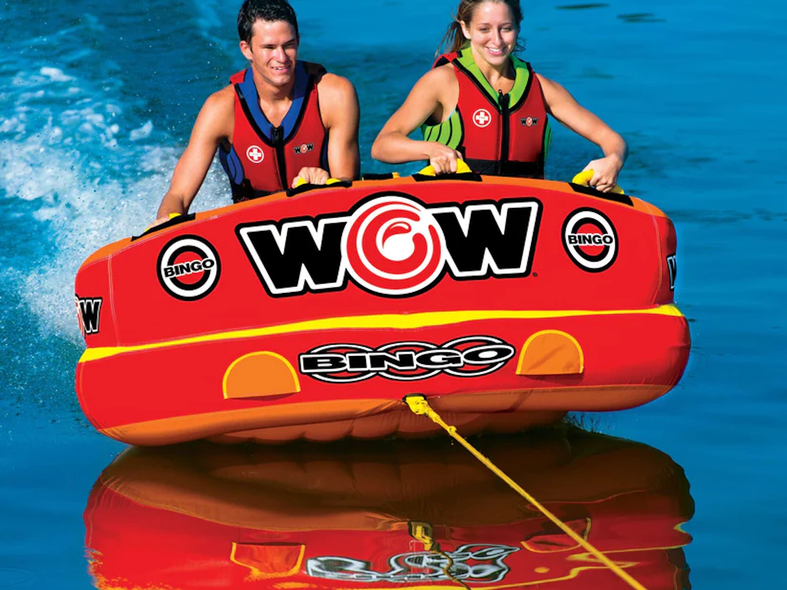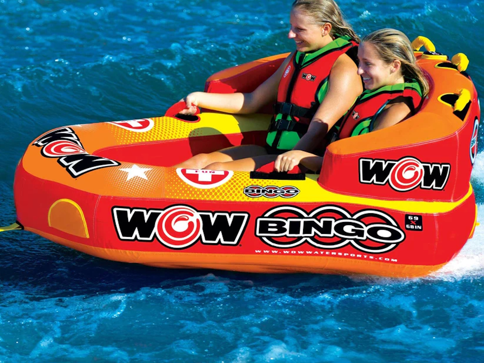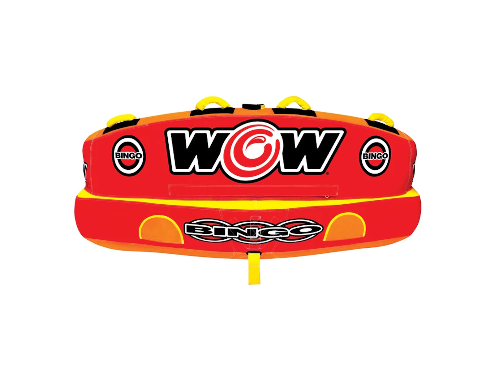 The Bingo 2 was specifically designed with family fun in mind. Another original design from WOW, this action packed towable gives your family 2 rides for the price of 1. The Bingo tubes are the only cockpit tubes on the market with front and back tow points. Ride in the seated position from the front tow point or connect the rope to the back tow point and ride chariot style. The Bingo comes with a free 11" 4K EZ tow connector which makes it simple to switch tow points even while on the water. The deep cockpit seating with high backrest makes the riders feel more secure while the new drop speed bottom glides smoothly over the water creating less drag on the boat and therefore better gas mileage. The Bingo 2 will be loved by everyone in the family; from those that like a nice and easy ride to those that want something more extreme.