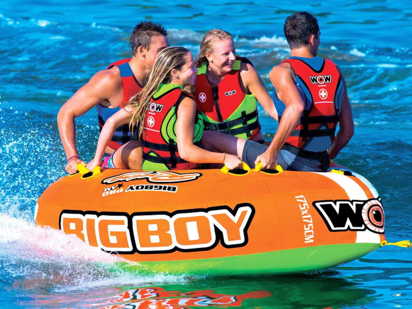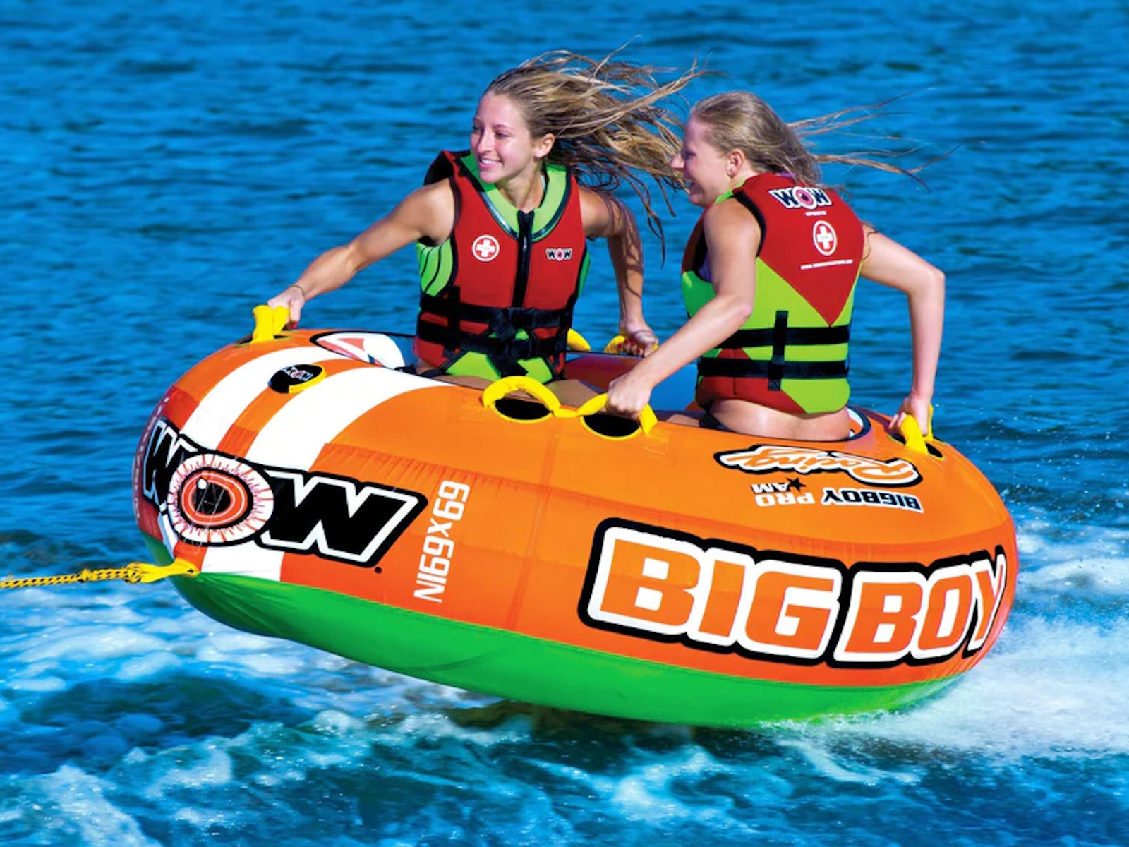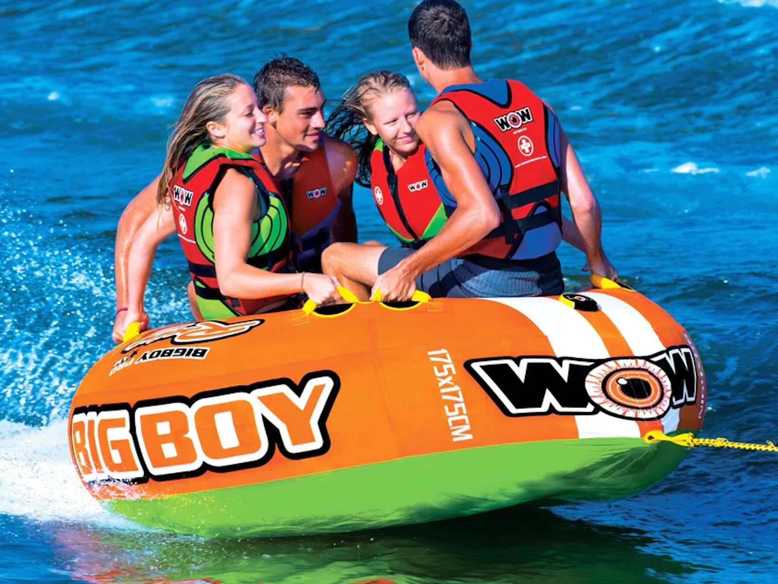 A big boat tube for big guys and girls or for several young kids. This inflatable towable can be ridden by 1-4 people. The large center hole also allows for two young kids or a parent and their child to ride together or ride sitting on the edge with your feet in the middle. A traditional concept that provides a fun yet stable ride. The arrowed shaped design allows for more stability and control than a round towable tube.