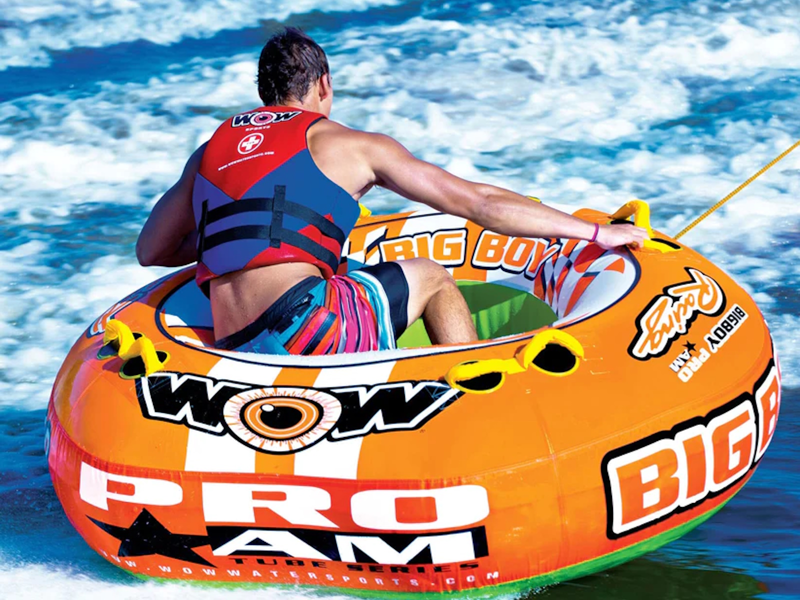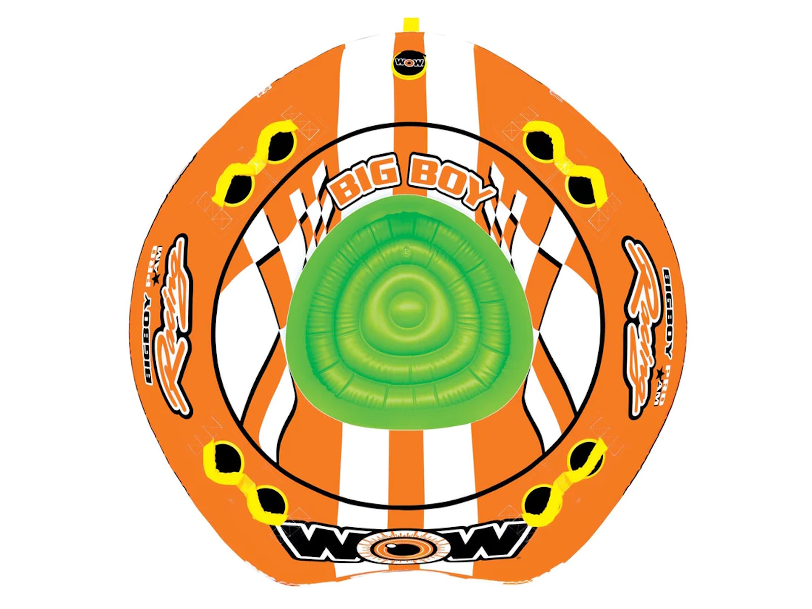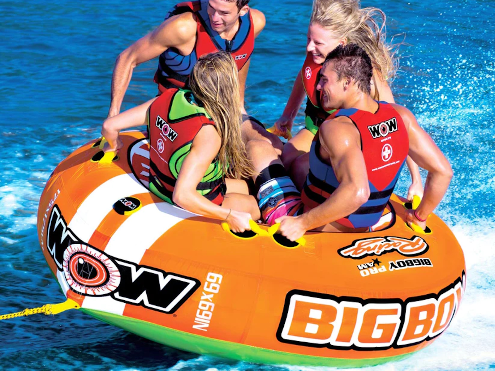 A big boat tube for big guys and girls or for several young kids. This inflatable towable can be ridden by 1-4 people. The large center hole also allows for two young kids or a parent and their child to ride together or ride sitting on the edge with your feet in the middle. A traditional concept that provides a fun yet stable ride. The arrowed shaped design allows for more stability and control than a round towable tube.