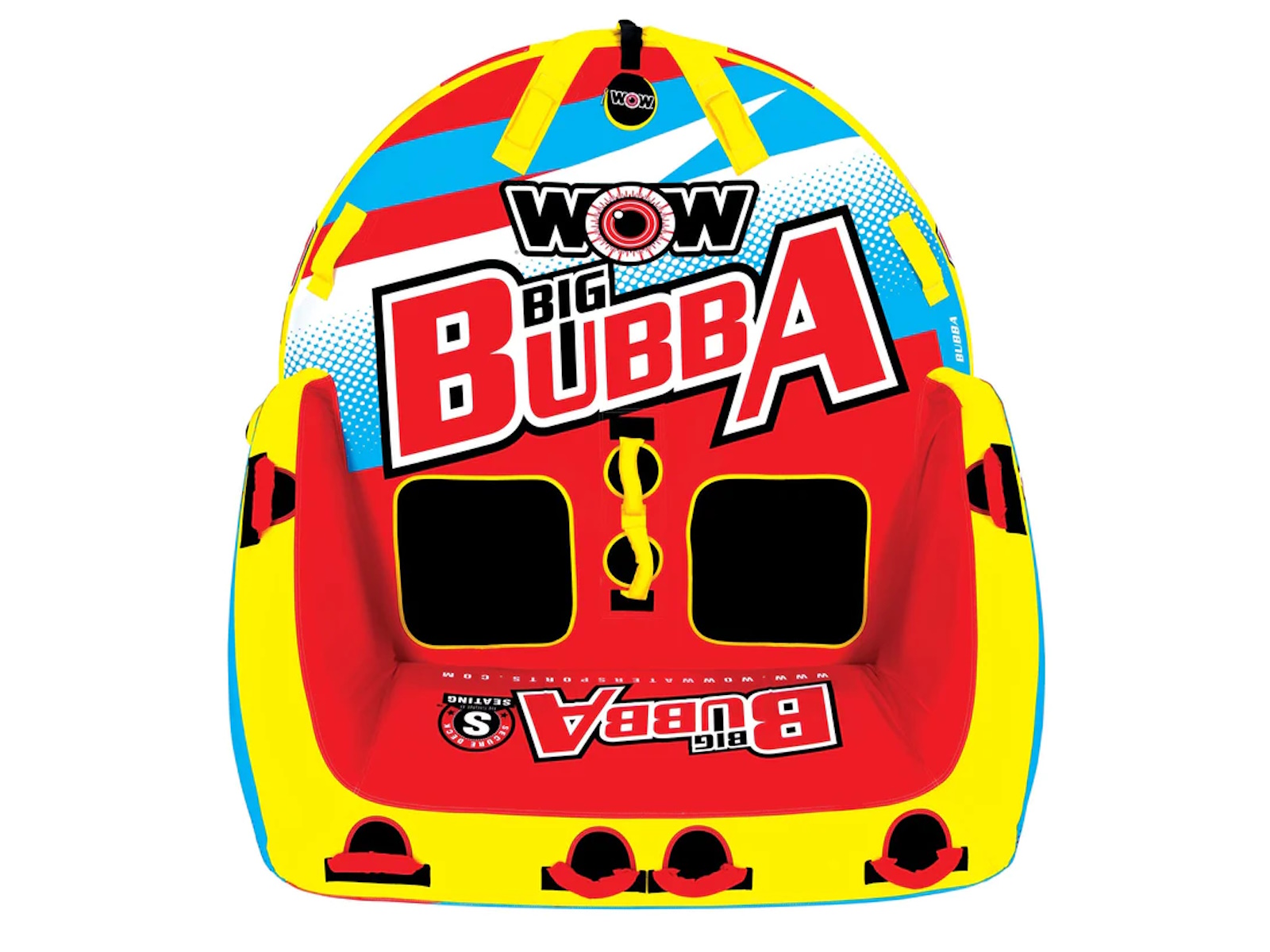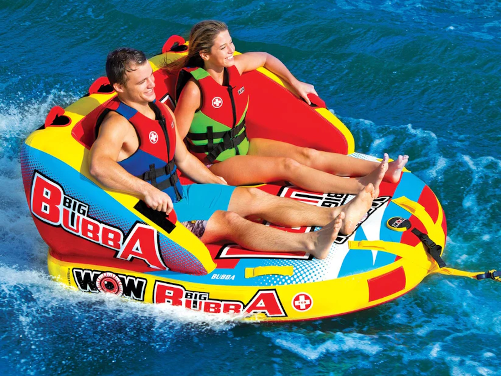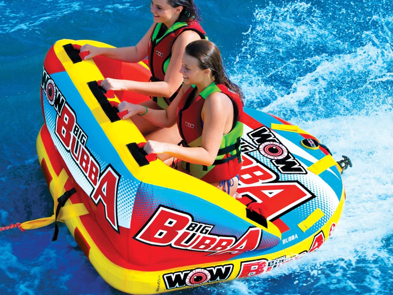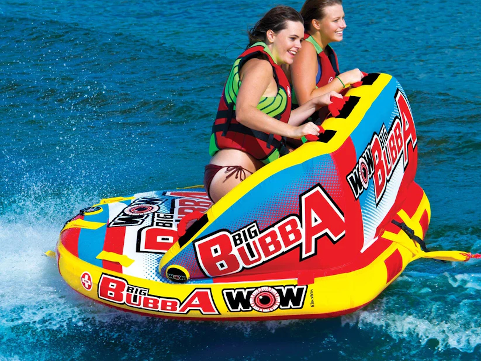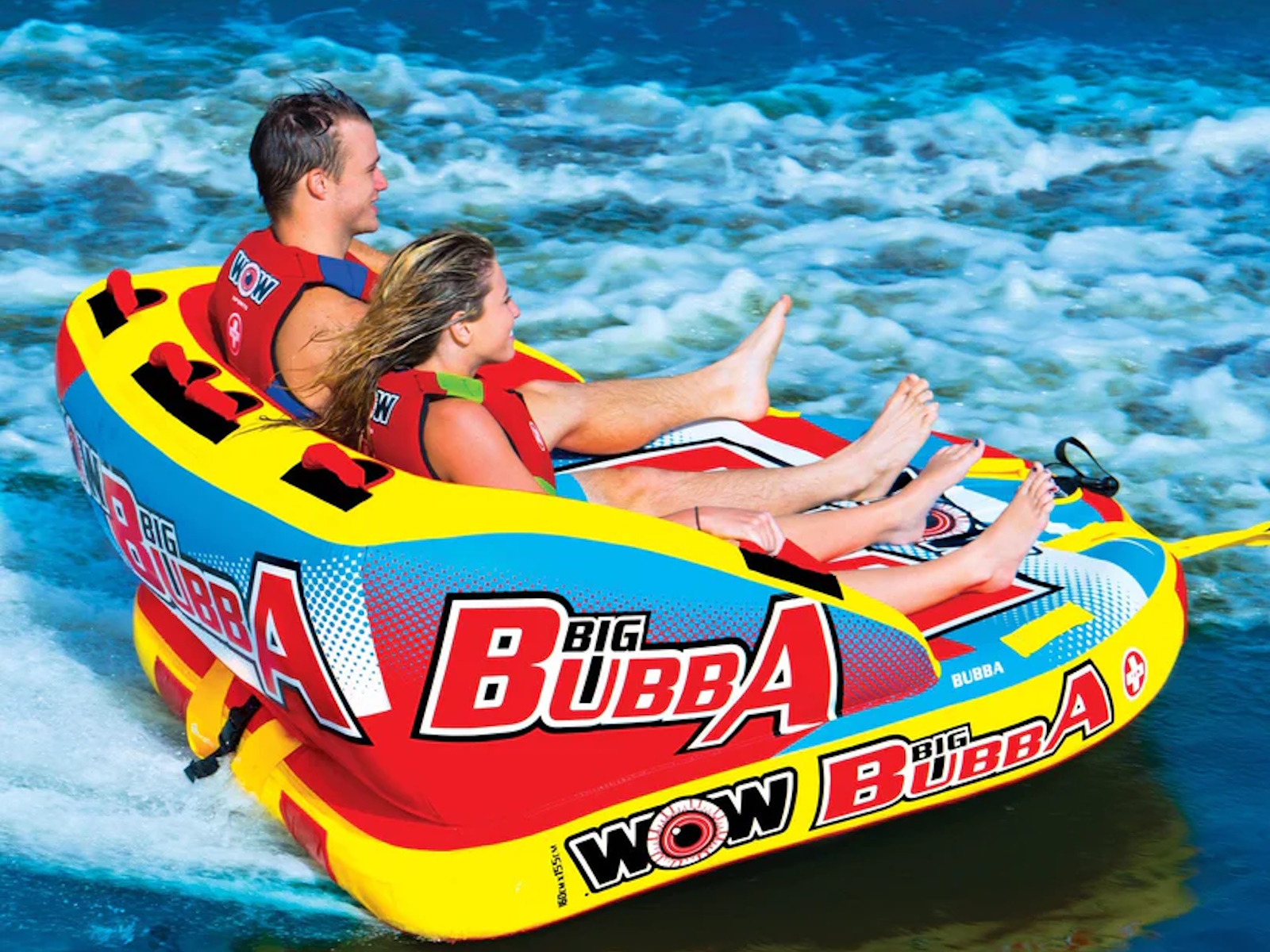 The Bubba couch style towables are some of the most popular tubes on the market. They make for a perfect starter tube for the family just getting into towables but also they are a tube that just about anybody can have fun on. The Bubbas come with a flat base for a smooth ride over the water and minimal drag on the boat. The SECURE DECK SEATING on the Bubbas come with a super high backrest with sidewalls which is great for keeping young kids safe and for giving them a secure feeling if they are just getting started on towables. But don’t get us wrong, these aren’t just for little kids. The high backrest just means it’s more difficult to fly off on the more wild rides. The smooth, flat base will get this baby going fast on the water if that’s what you’re in to. The Bubbas also come with front and back tow points so you can ride sitting, laying down, or kneeling chariot style. And after your ride is over the Bubbas make a perfect floating couch on the water. Great for relaxing with your friends at your favorite body of water.