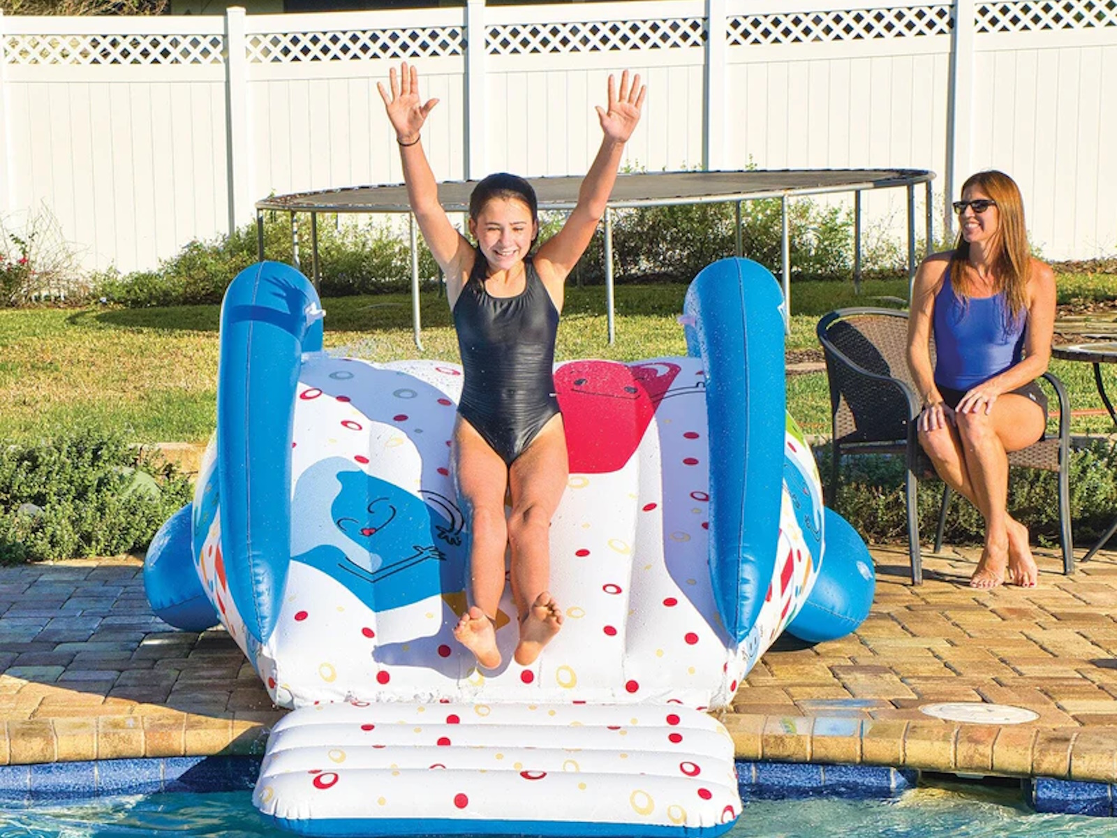 Make any pool a COOL POOL with WOW's Soaker Sprinkler Pool Slide. This easy to set-up inflatable has WOW water ballast pontoons for secure stable sliding. Built in soaker sprinkler creates a wet fast sliding surface that connects easily to any standard garden hose. EZ boarding step design with moulded handles. At the bottom of the slide, there is a WOW slide bumper for easy entry into the water.
