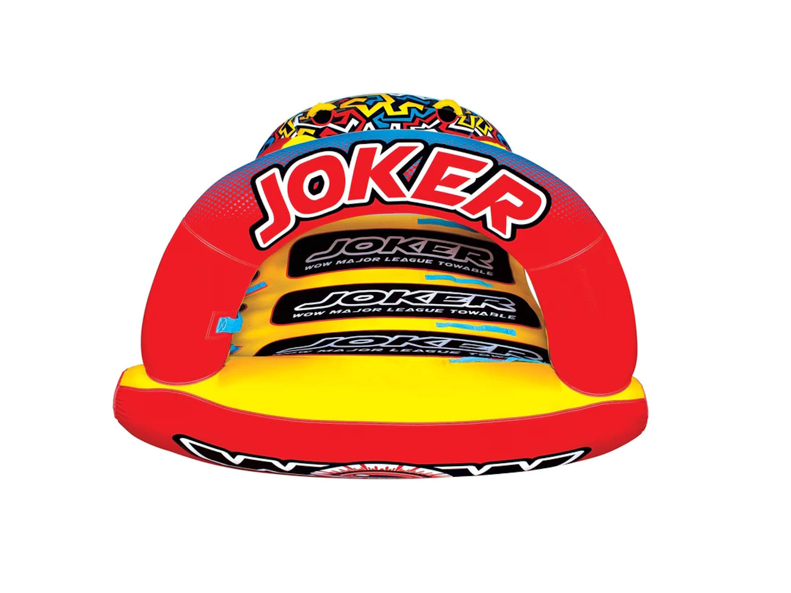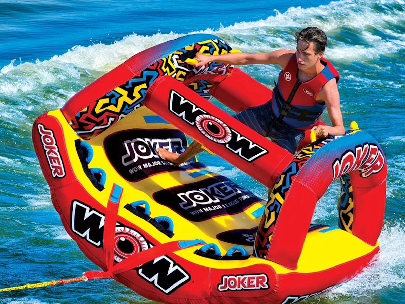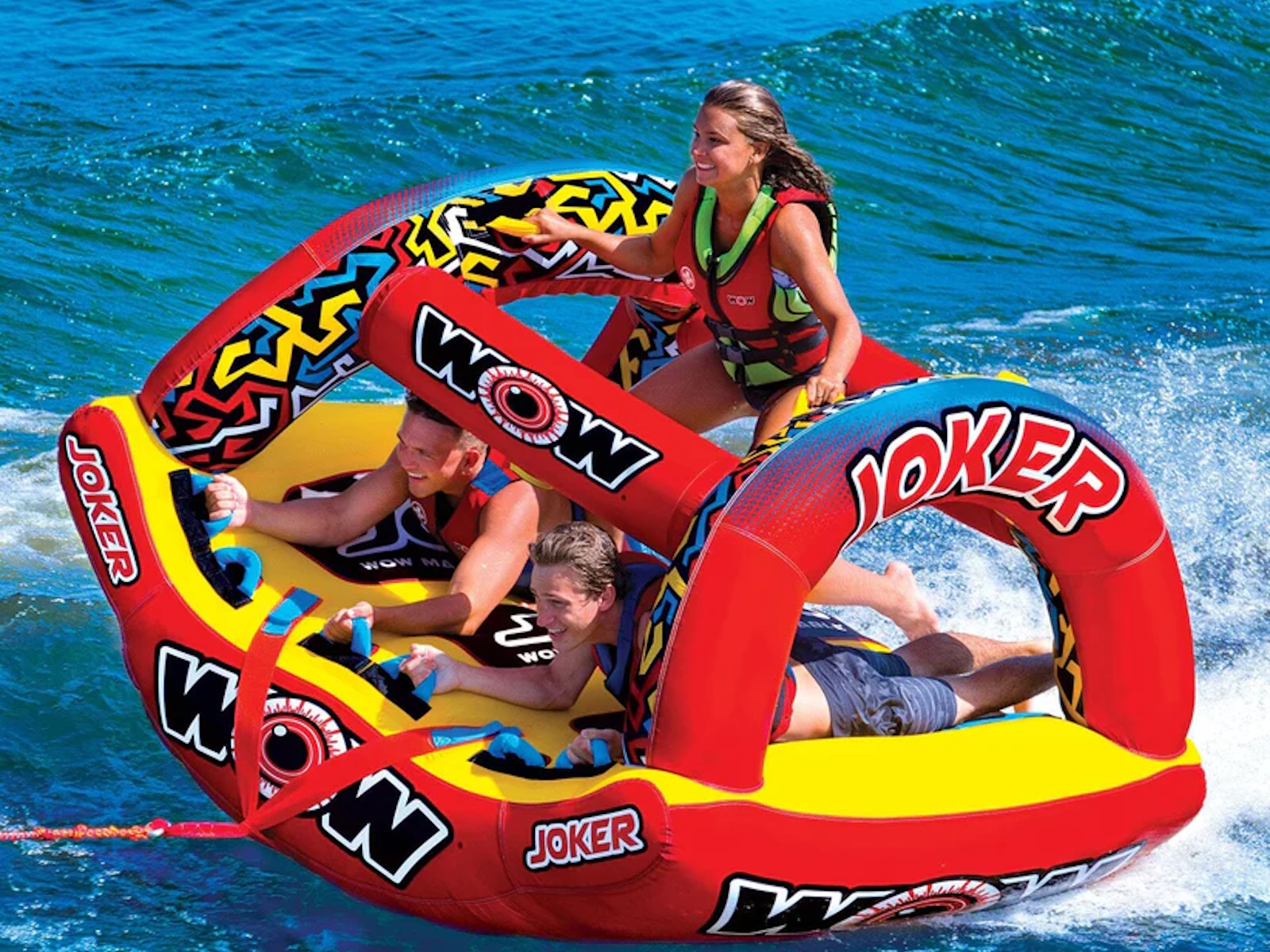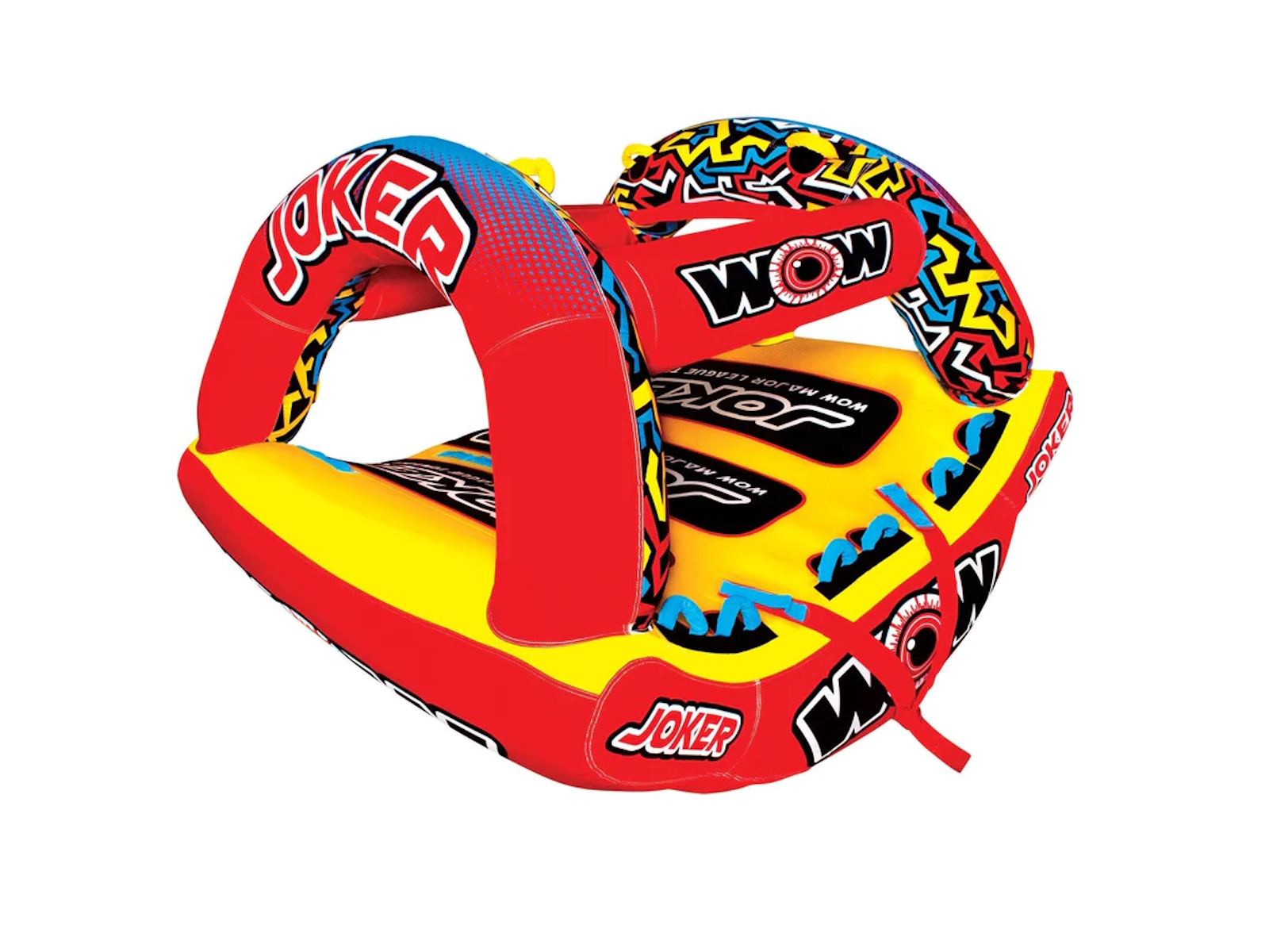 WOW isn't joking around when it comes to making Major League Towables. The JOKER is the latest and greatest on the water. DonÕt be a fool at the lake and BE SEEN, this HIGH-PROFILE design will sure draw some attention and entertain the ones brave enough to ride AND the bystanders alike. Built with a state-of-the-art design, introducing the exclusive WOW POWER TOWER. The Power Tower System gives riders countless options when it comes to how they ride. Stand, Kneel, Sit, Lay or even Handstand, if you're a jokester like that. The winged bottom minimizes the drag and hugs the riders so they can feel secure -- even when it gets out of hand! Riding solo? Guide your ride using the Power Tower as leverage to steer and glide across the waves.