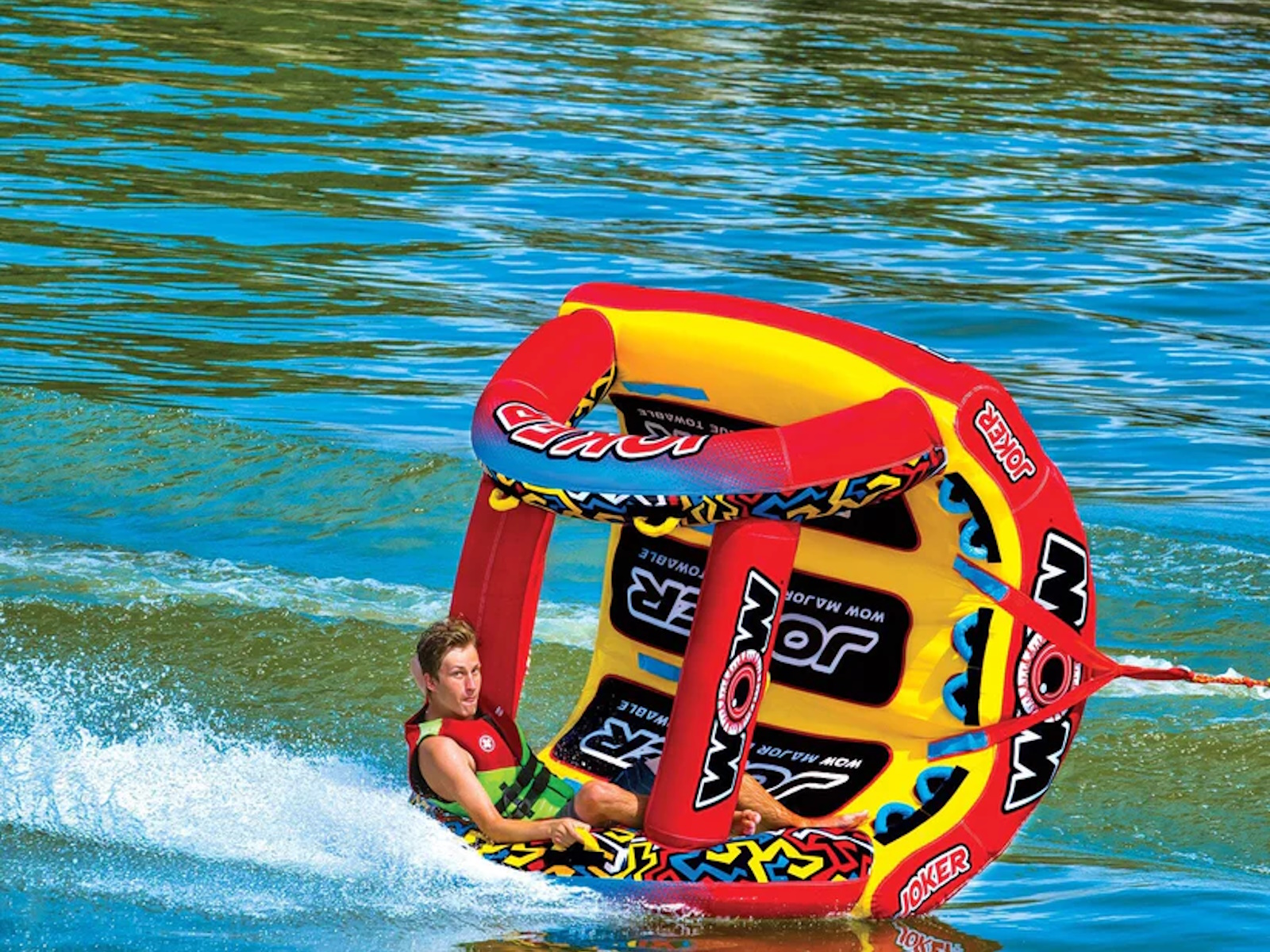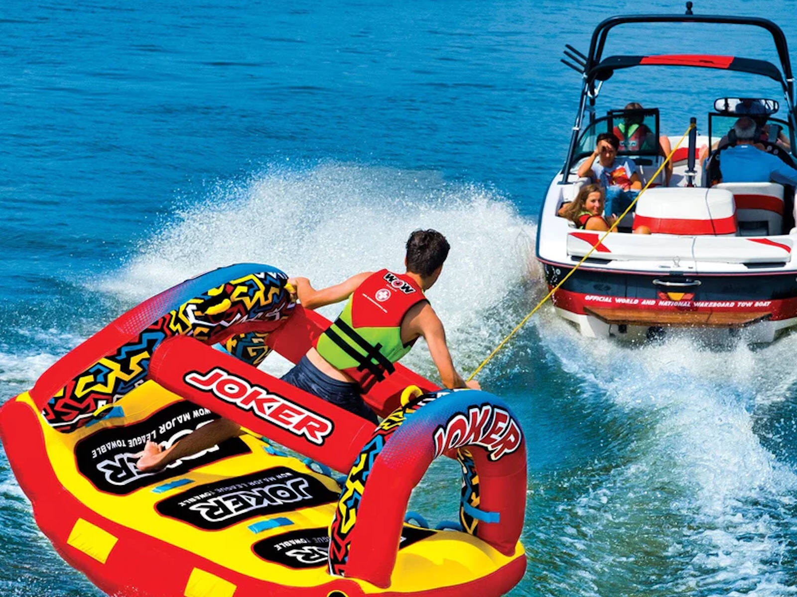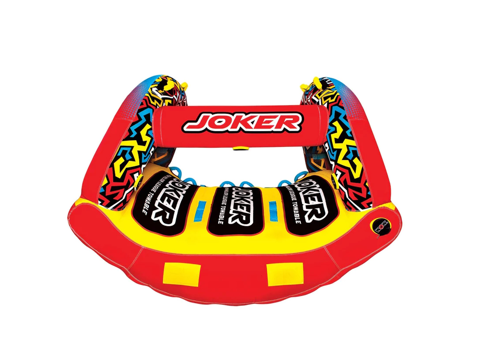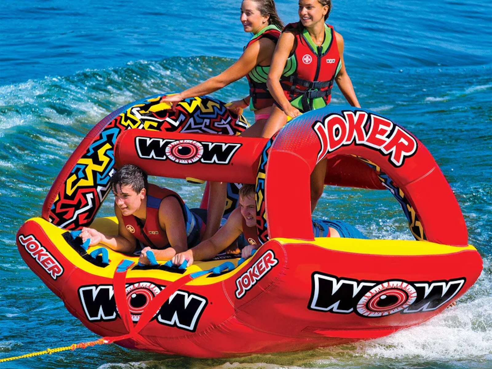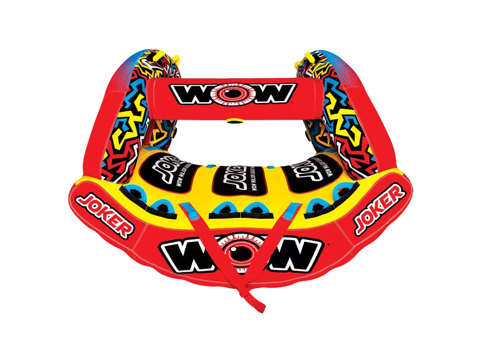 WOW isn't joking around when it comes to making Major League Towables. The JOKER is the latest and greatest on the water. DonÕt be a fool at the lake and BE SEEN, this HIGH-PROFILE design will sure draw some attention and entertain the ones brave enough to ride AND the bystanders alike. Built with a state-of-the-art design, introducing the exclusive WOW POWER TOWER. The Power Tower System gives riders countless options when it comes to how they ride. Stand, Kneel, Sit, Lay or even Handstand, if you're a jokester like that. The winged bottom minimizes the drag and hugs the riders so they can feel secure -- even when it gets out of hand! Riding solo? Guide your ride using the Power Tower as leverage to steer and glide across the waves.