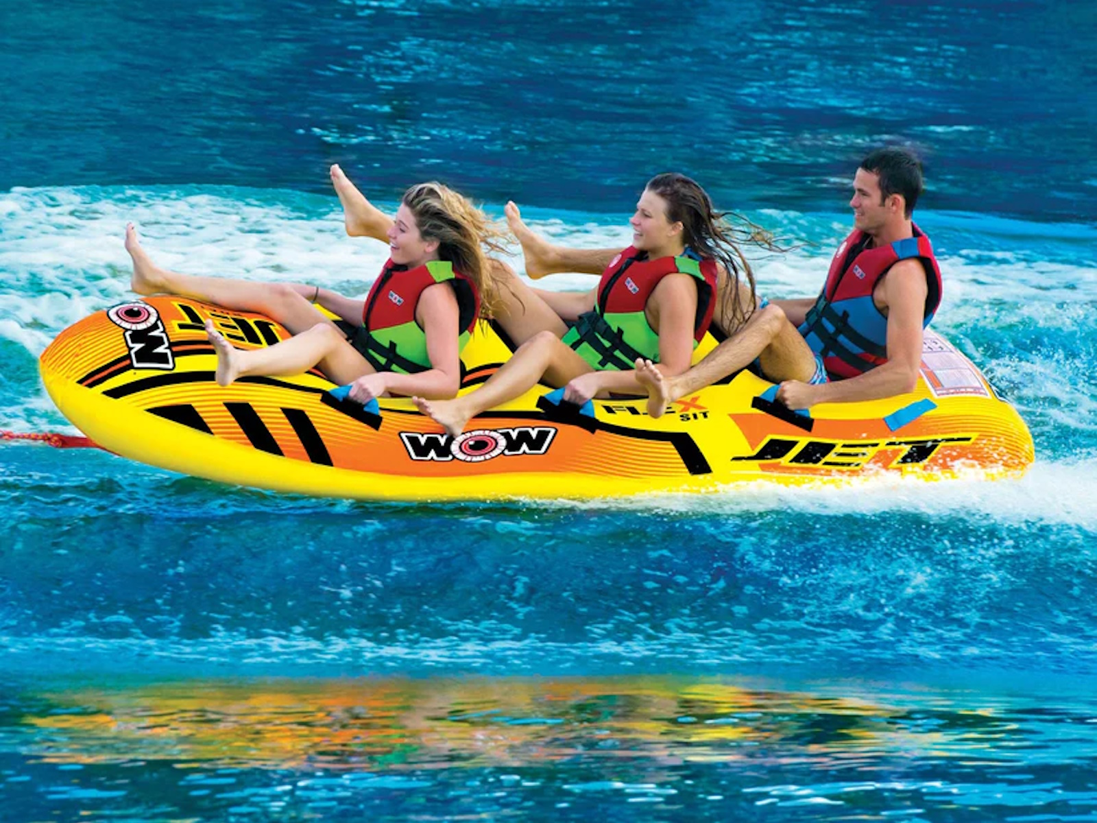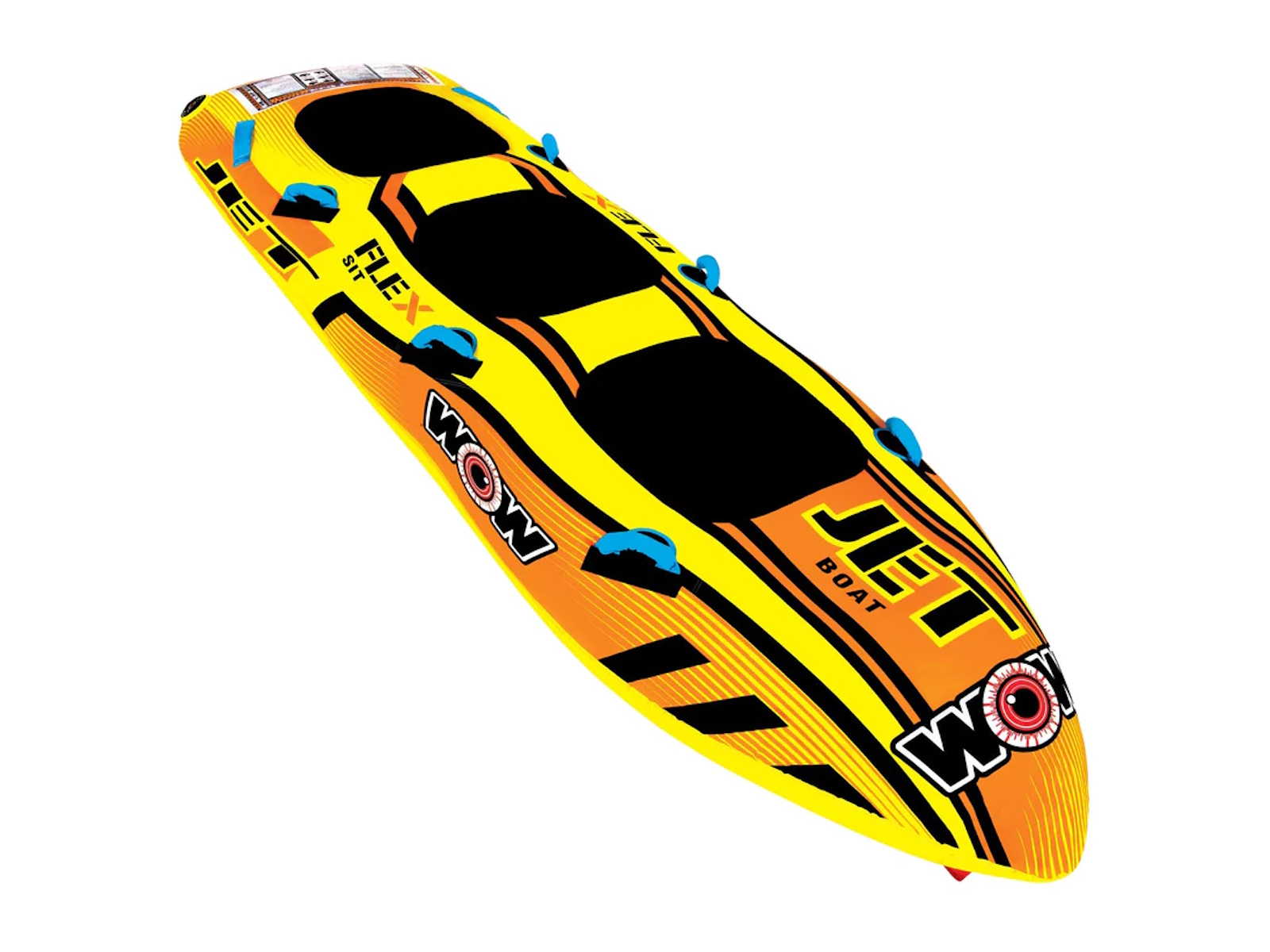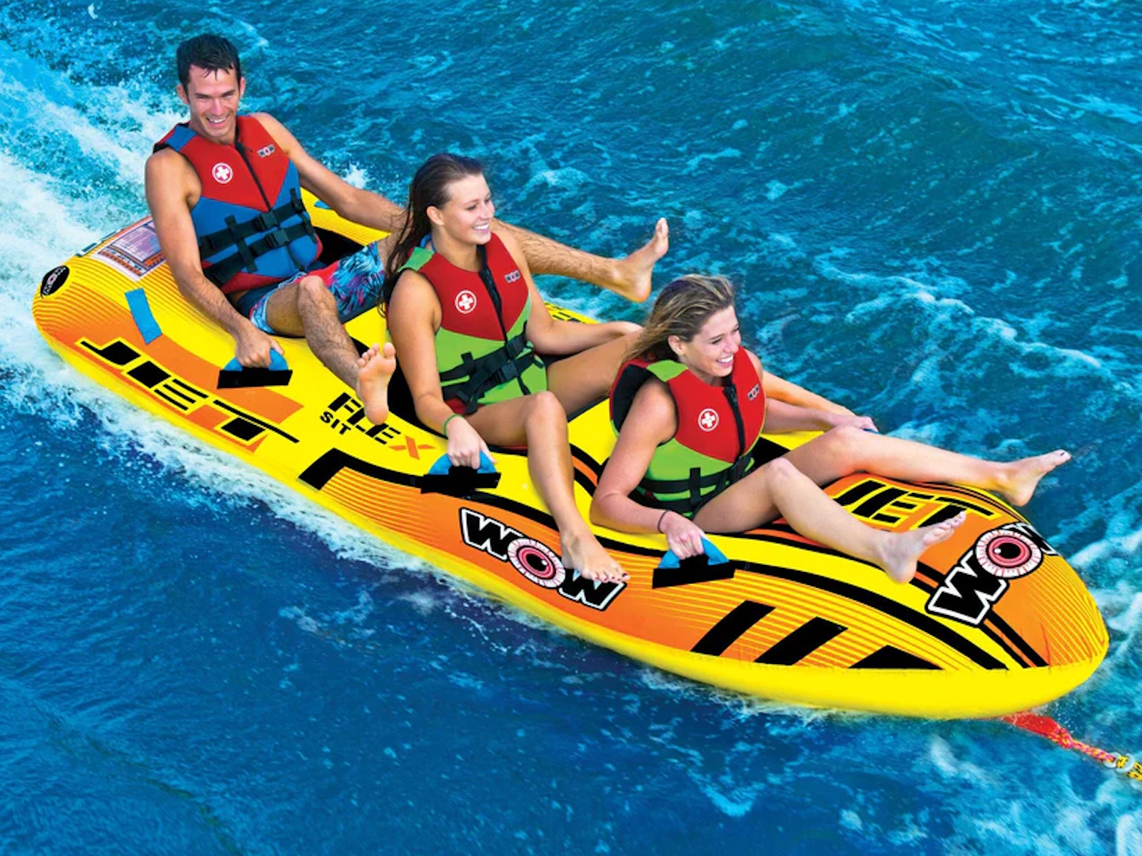 The Jet Boat series from WOW is a serious upgrade on an old design. The torpedo or hot dog in-line towable has been around for years but the problem with these items has always been that they couldn’t get outside the wake very easy and on the turns they would tip over because of their high center of gravity. WOW has fixed these problems with their new patent-pending Flex-Form seating system. Flex-Form seating allows the riders to sit down inside of the tube instead of on top. This lowers the center of gravity of the item and keeps it fast and upright on the whips and turns. This added stability is great for those that want to go fast but also for those that want a safer, less eventful ride. The Flex-Form seating is constructed of a nylon harness to keep the rider’s bottoms from hitting the water as well as a layer of 4-way stretch, UV resistant material for added comfort.