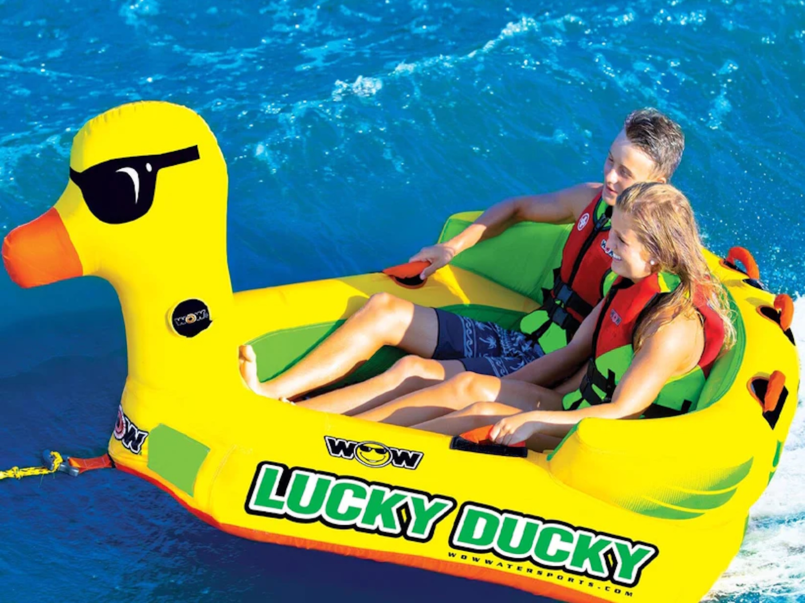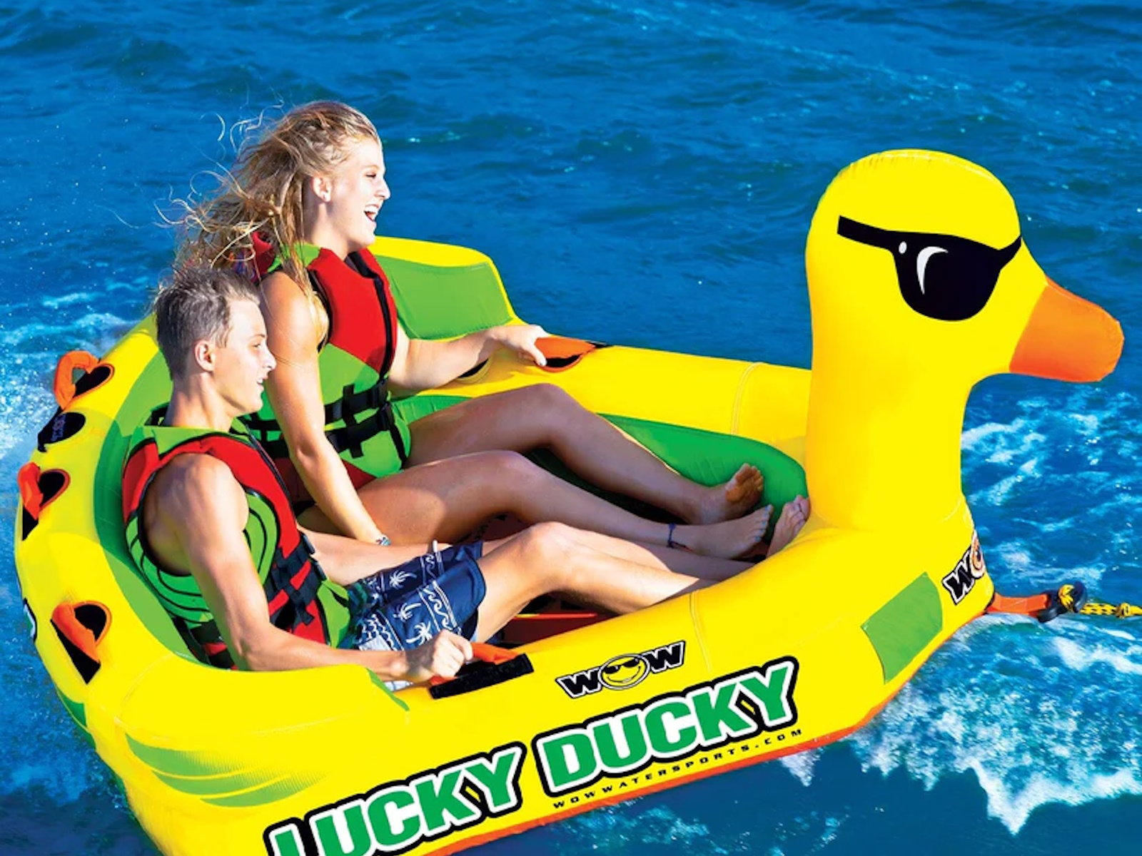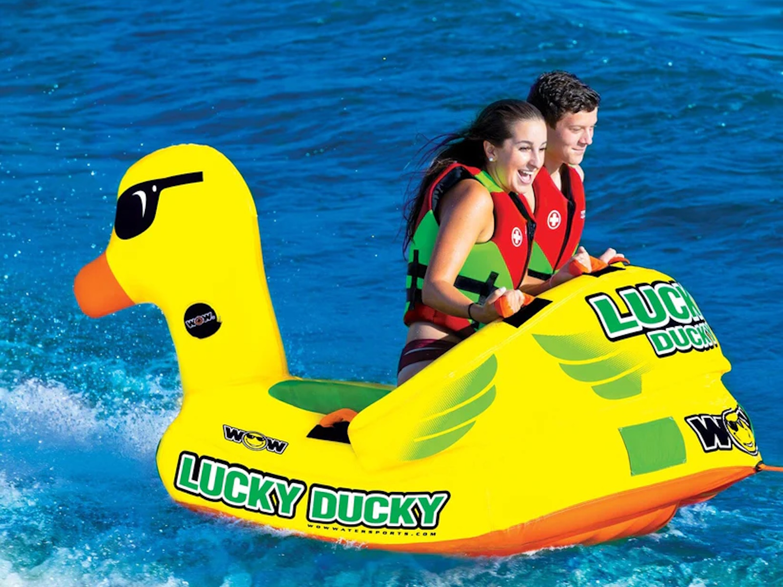 The Lucky Ducky was specifically designed to be the lucky new friend to join in on the family fun! Another member of the Ducky family at WOW, this action packed towable is bound to spread some smiles and -of course, good times. The deep cockpit seating with high backrest makes the riders feel more secure while the new drop speed bottom glides smoothly over the water creating less drag on the boat. With the Luck of the Duck, you will be able to enjoy this 2-in-1 towable. Front and back tow points allow for a variety of rides and is sure to be loved by the whole family. Features - 1-2 Rider Cockpit Towable 340lbs. 154kg. Maximum Capacity - Unique and fun DUCKY design - SECURE COCKPIT SEATING is great for young kids who want a secure ride - The SECURE COCKPIT SEATING will also keep riders in the tube on the more extreme rides - Reinforced front and back tow points, 2 rides in 1 towable - Front tow point with built in Molded EZ TOW CONNECTOR for EZ tow point hook ups - Deep cockpit construction with high backrest riser for secure and extreme riding - Drop speed bottom allows for EZ fuel efficient towing with less drag on the boat - Full nylon cover with Heavy-Duty zippers - Heavy-Duty PVC bladders - Double webbing foam handles with knuckle guards - EVA foam pads for comfortable seating - High profile and high visibility on the water - Zippered padded valve covers - Speed valves for fast inflation and deflation - Dimensions Inflated 78 x 68 x 34 in; 198 x 173 x 86 cm - Dimensions Deflated 75 x 74 in; 190 x 187 cm - 1 year warranty