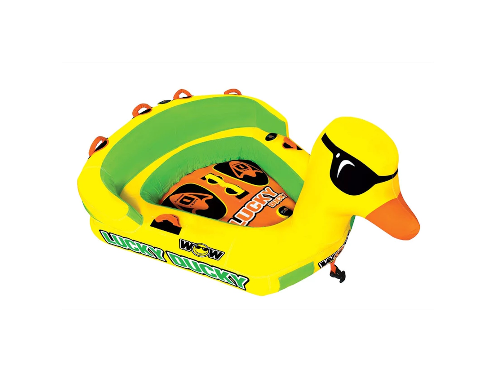 The Lucky Ducky was specifically designed to be the lucky new friend to join in on the family fun! Another member of the Ducky family at WOW, this action packed towable is bound to spread some smiles and -of course, good times. The deep cockpit seating with high backrest makes the riders feel more secure while the new drop speed bottom glides smoothly over the water creating less drag on the boat. With the Luck of the Duck, you will be able to enjoy this 2-in-1 towable. Front and back tow points allow for a variety of rides and is sure to be loved by the whole family. Features - 1-2 Rider Cockpit Towable 340lbs. 154kg. Maximum Capacity - Unique and fun DUCKY design - SECURE COCKPIT SEATING is great for young kids who want a secure ride - The SECURE COCKPIT SEATING will also keep riders in the tube on the more extreme rides - Reinforced front and back tow points, 2 rides in 1 towable - Front tow point with built in Molded EZ TOW CONNECTOR for EZ tow point hook ups - Deep cockpit construction with high backrest riser for secure and extreme riding - Drop speed bottom allows for EZ fuel efficient towing with less drag on the boat - Full nylon cover with Heavy-Duty zippers - Heavy-Duty PVC bladders - Double webbing foam handles with knuckle guards - EVA foam pads for comfortable seating - High profile and high visibility on the water - Zippered padded valve covers - Speed valves for fast inflation and deflation - Dimensions Inflated 78 x 68 x 34 in; 198 x 173 x 86 cm - Dimensions Deflated 75 x 74 in; 190 x 187 cm - 1 year warranty