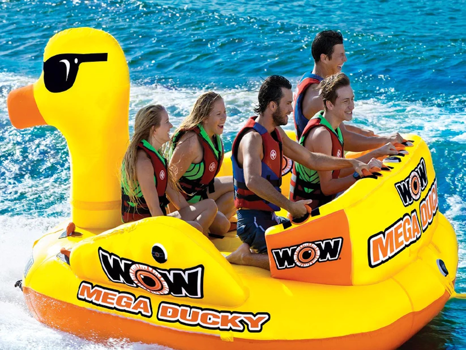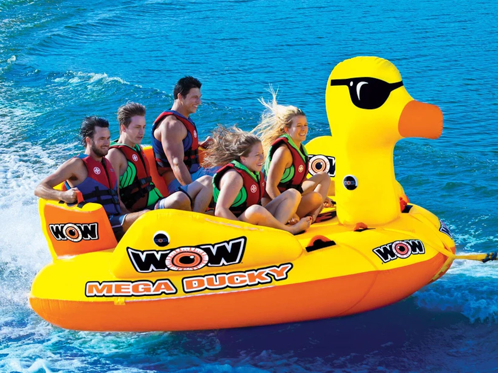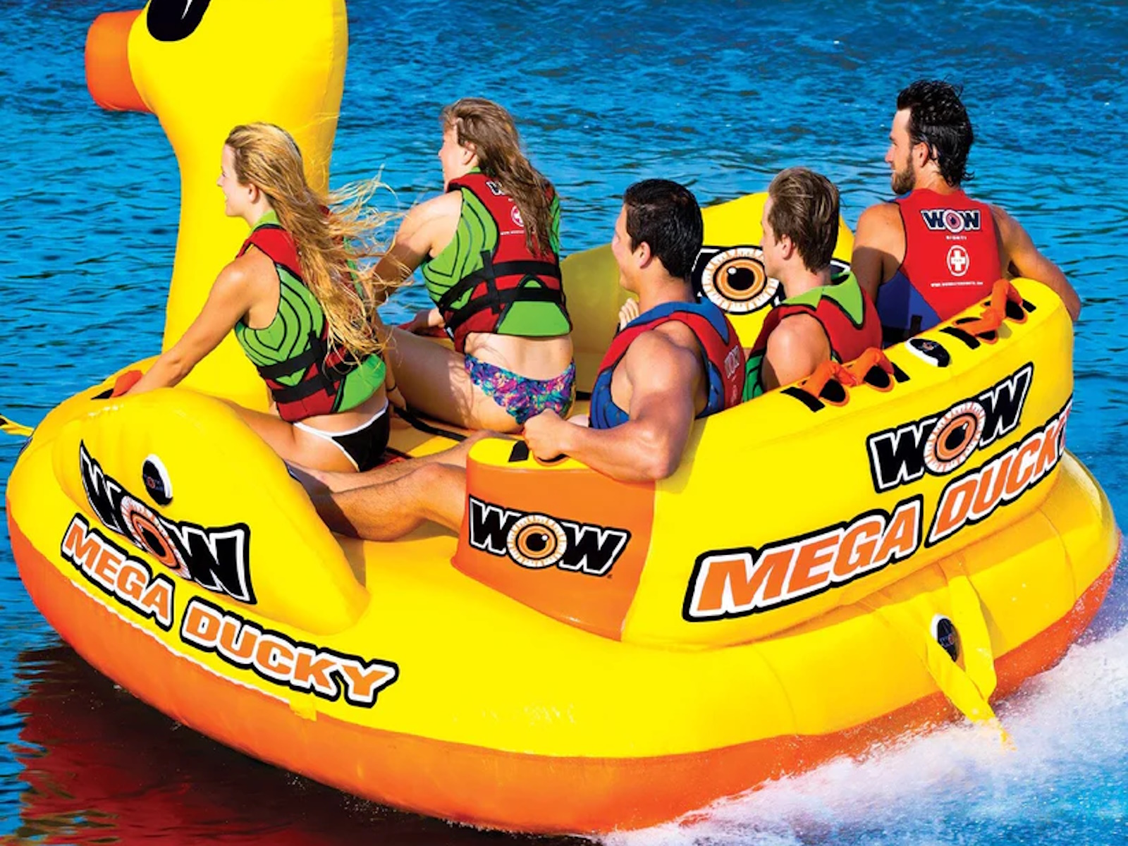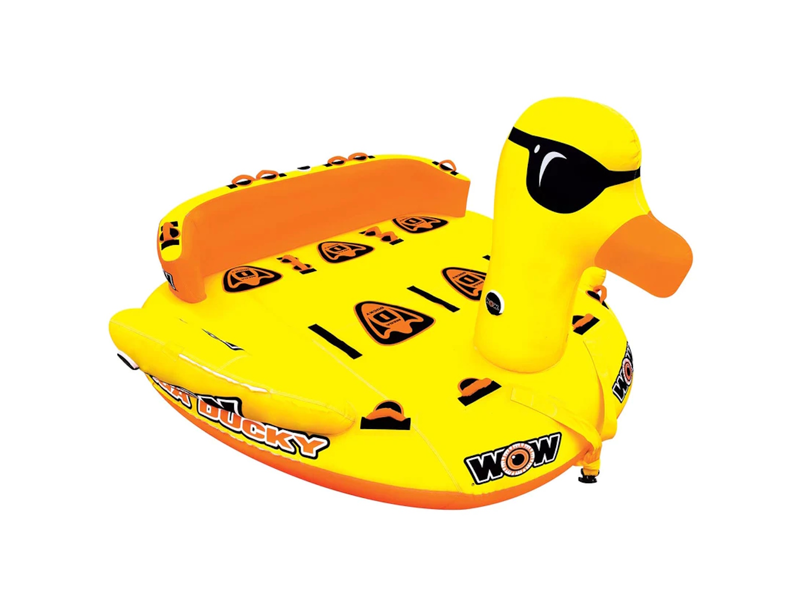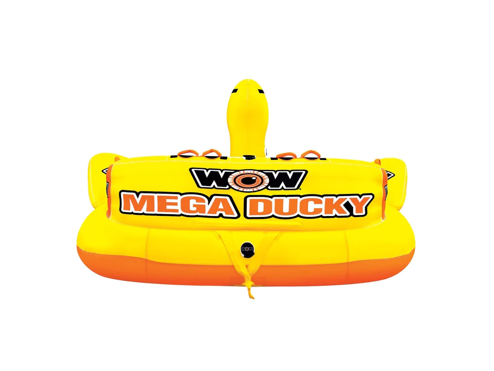 Taking the WOW Ducky to the next level! This massive MEGA DUCKY is ready to take the whole gang for a ride. The MEGA DUCKY makes the ultimate statement on the water and features front and back tow points so riders get 2 ride options in 1 tube. This giant lake cruiser is a classic couch style towable with a HUGE deck area that will hold up to 5 PEOPLE. The side wings are designed to help contain the riders on the deck. Each seat is equipped with foam pads and handles for a SECURE ride. And after your ride is over the Mega Ducky makes a perfect floating island on the water. Anchor it down or tie it to the dock for a fun floating playground or comfy relaxation spot on the water. Features - 1-5 Rider Towable 850Ibs. 385kg. maximum capacity - SECURE DECK SEATING comes with extra high backrest and sidewalls. Great for helping young kids feel secure on the water - The extra high backrest keeps the ride going on the extra fast and bouncy rides - Reinforced Front And Back Tow Points, 2 Rides In 1 Towable - Free 11 inch 5K aluminum EZ tow connector included - EVA foam seat and knee pad - Great floating island for relaxing after your ride - Heavy-duty PVC bladder and nylon cover - Speed valve for fast inflation and deflation - Zippered valve cover - Inflated dimensions: 115 x 115 x 65 in; 292 x 292 x 165 cm - Deflated dimensions; 115 x 118 in; 292 x 300 cm - 1 year warranty