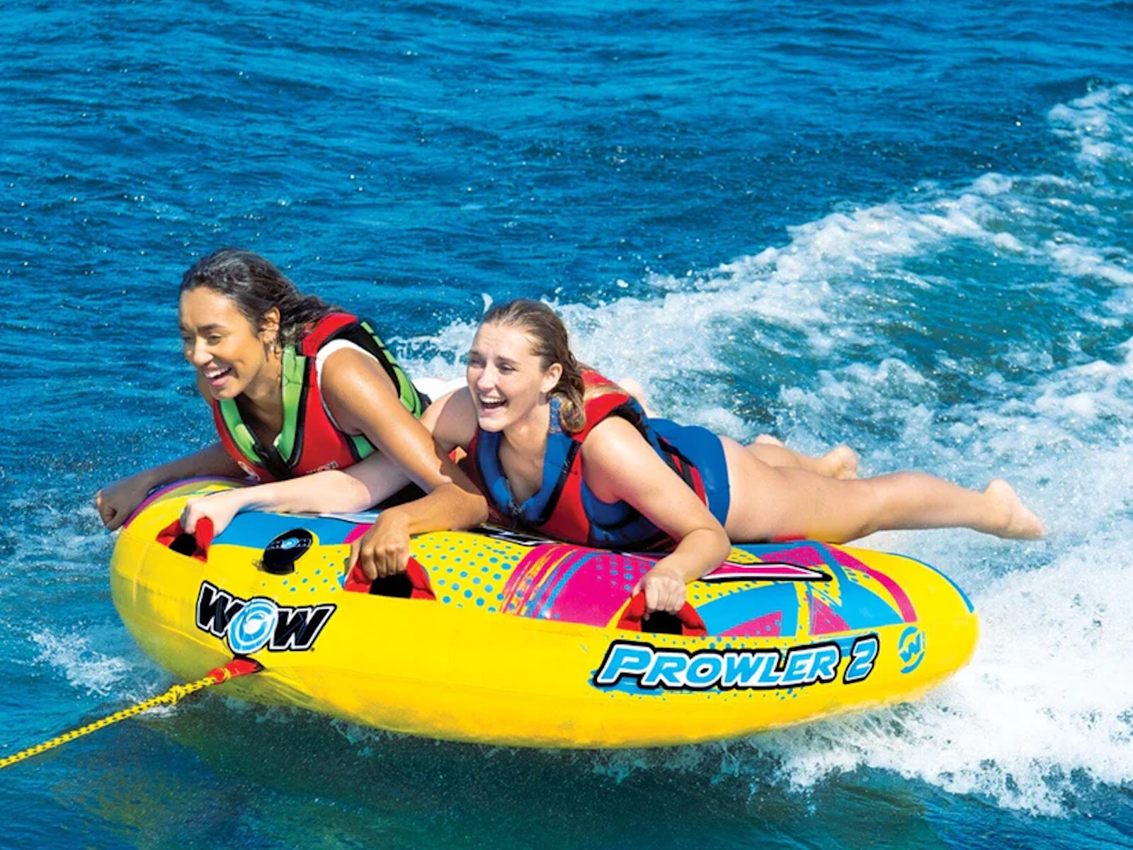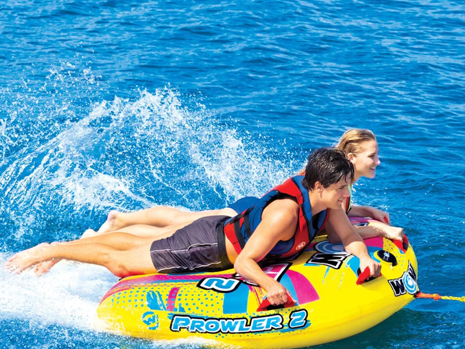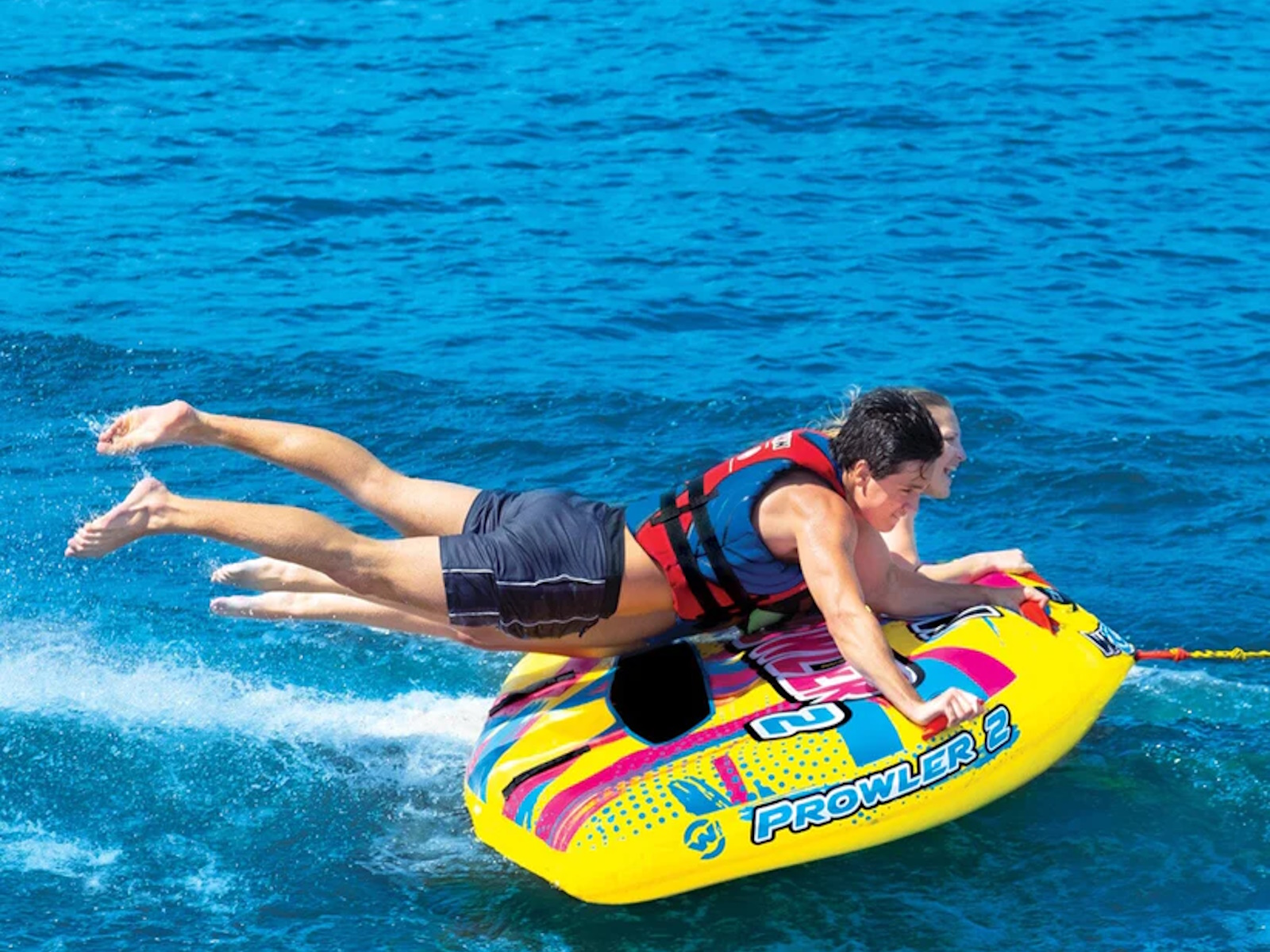 Not even the coolest cats and kittens will land on their feet when thrown from the Prowler 2. Hitch it up for a wild ride, take a waterside cat-nap or bring it on your next floating excursion. This kitty has everything you need for the prowl: the D-shaped towable, 12v pump for inflation, and 1 rope. The Prowler also inflates in no time, so you can get on the water sooner. It also deflates fast when you're ready to call it a day and head home.