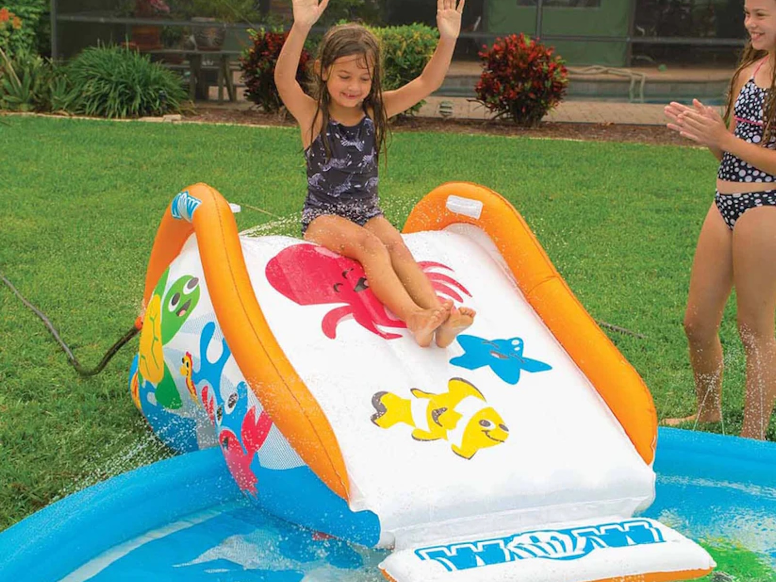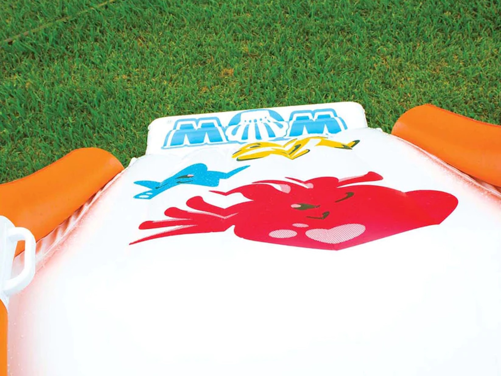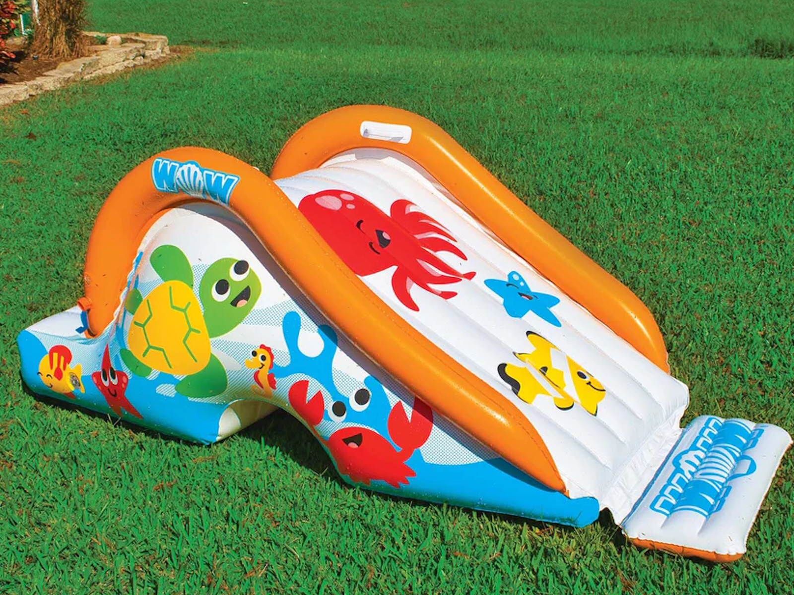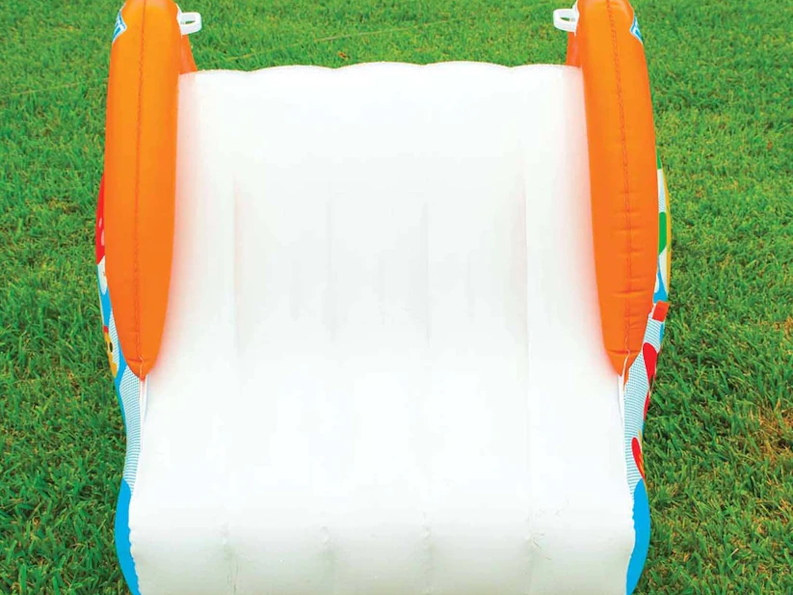 ADD to your PAD with WOW's Swirl Splash Pad Slide. This easy to set-up inflatable has a tunnel that fits over the pontoons of our WOW Splash Pads for secure stable sliding. Built in soaker sprinkler creates a wet fast sliding surface that connects easily to any standard garden hose. EZ boarding step design with moulded handles. At the bottom of the slide, there is a WOW slide bumper for easy entry into the water.