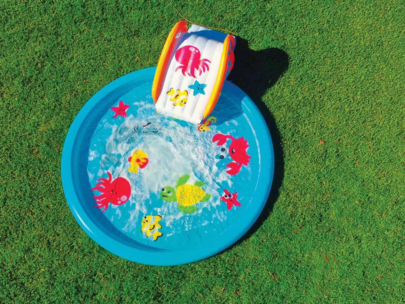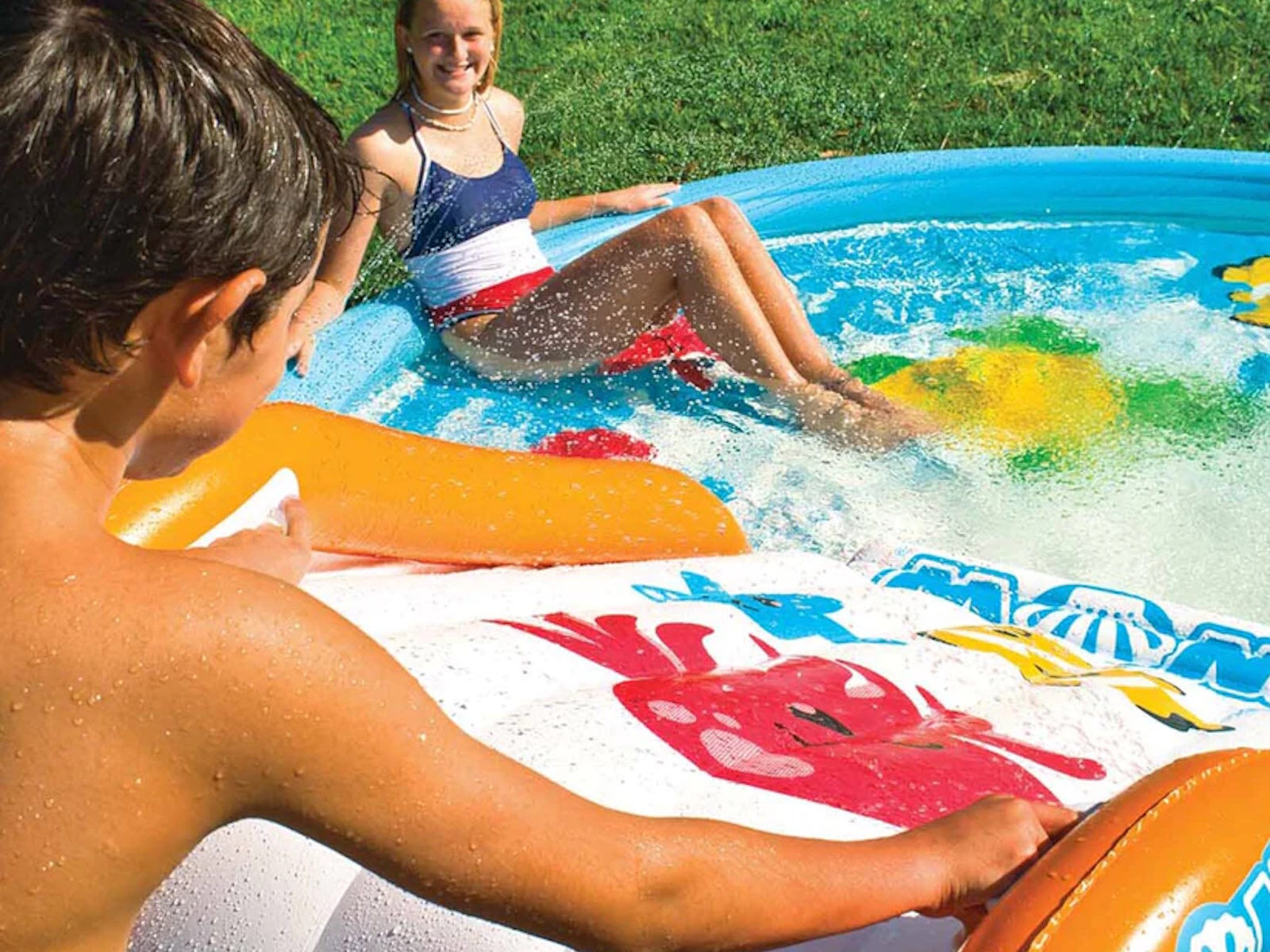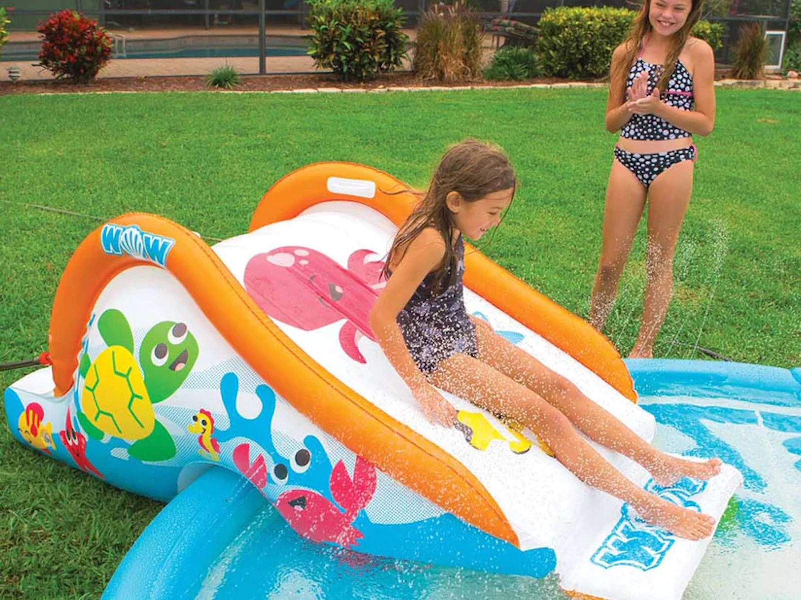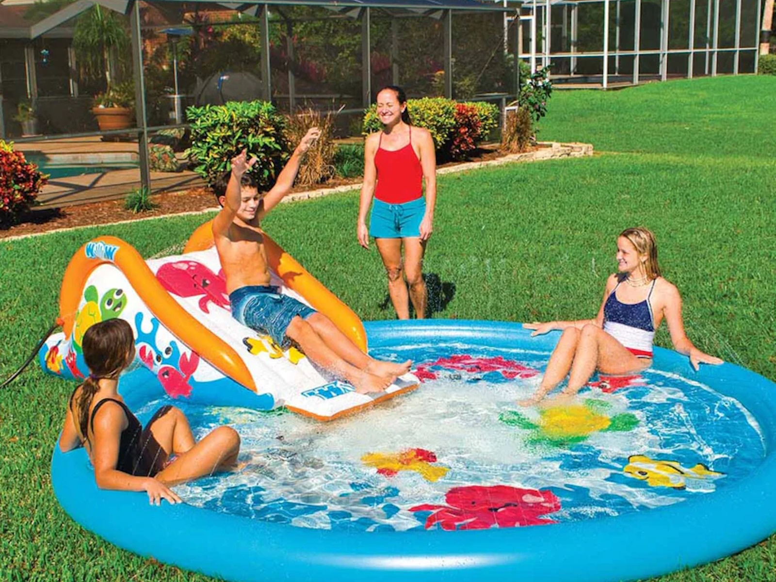 ADD to your PAD with WOW's Swirl Splash Pad Slide. This easy to set-up inflatable has a tunnel that fits over the pontoons of our WOW Splash Pads for secure stable sliding. Built in soaker sprinkler creates a wet fast sliding surface that connects easily to any standard garden hose. EZ boarding step design with moulded handles. At the bottom of the slide, there is a WOW slide bumper for easy entry into the water.