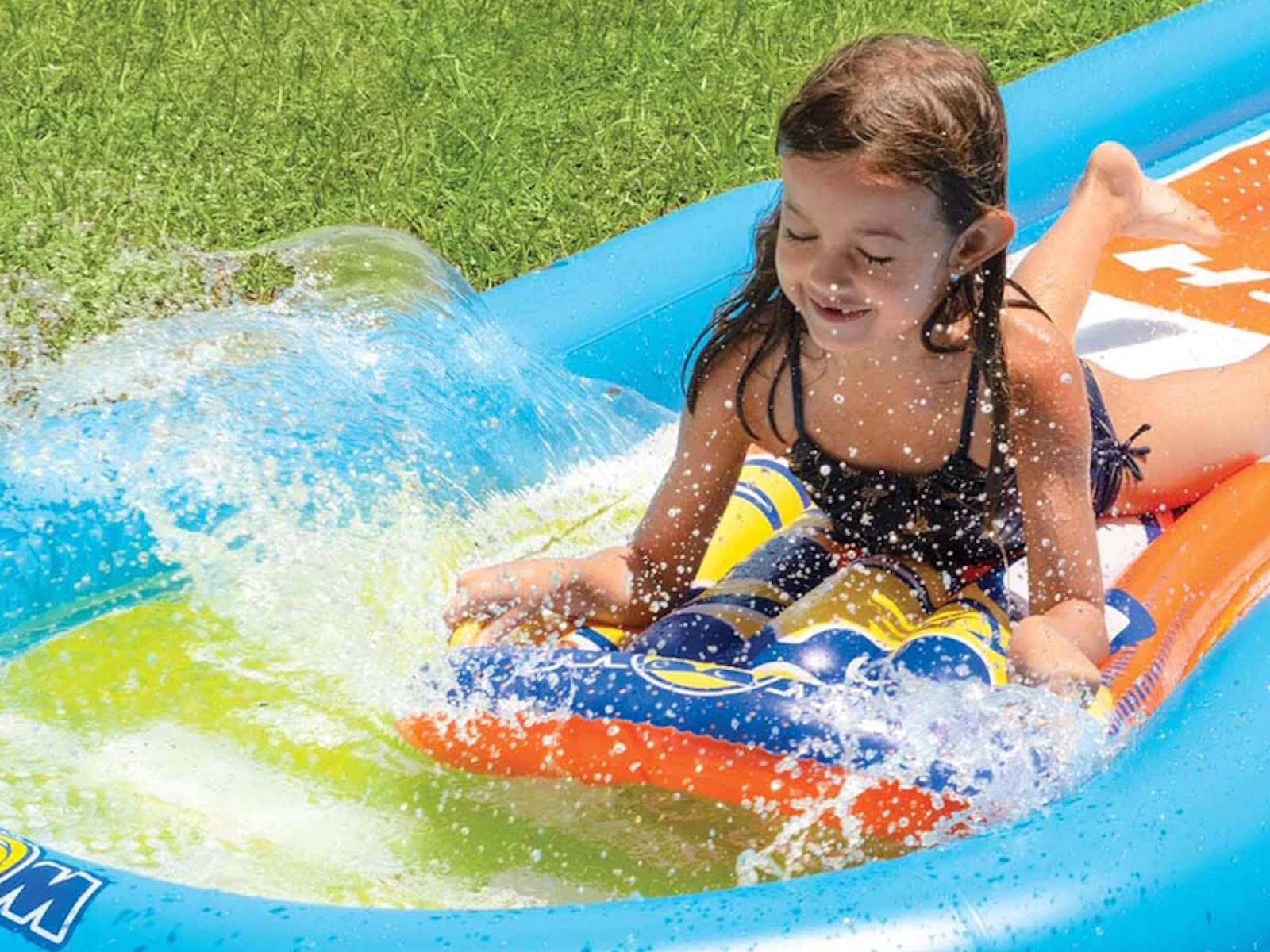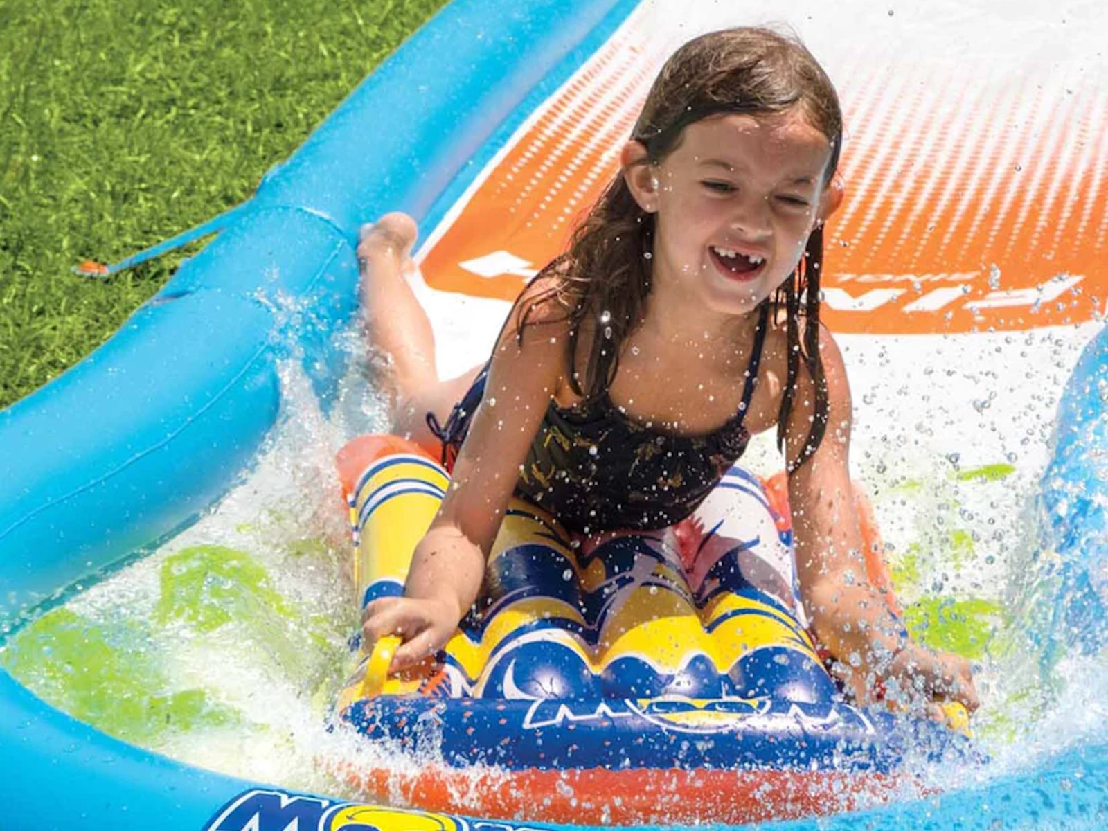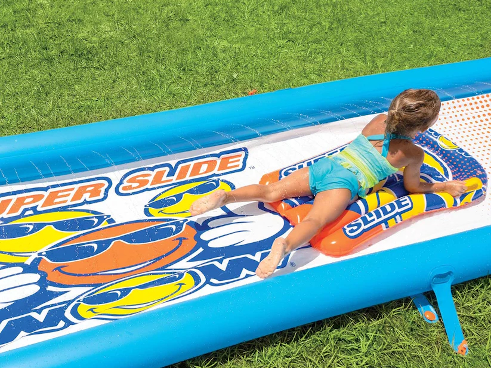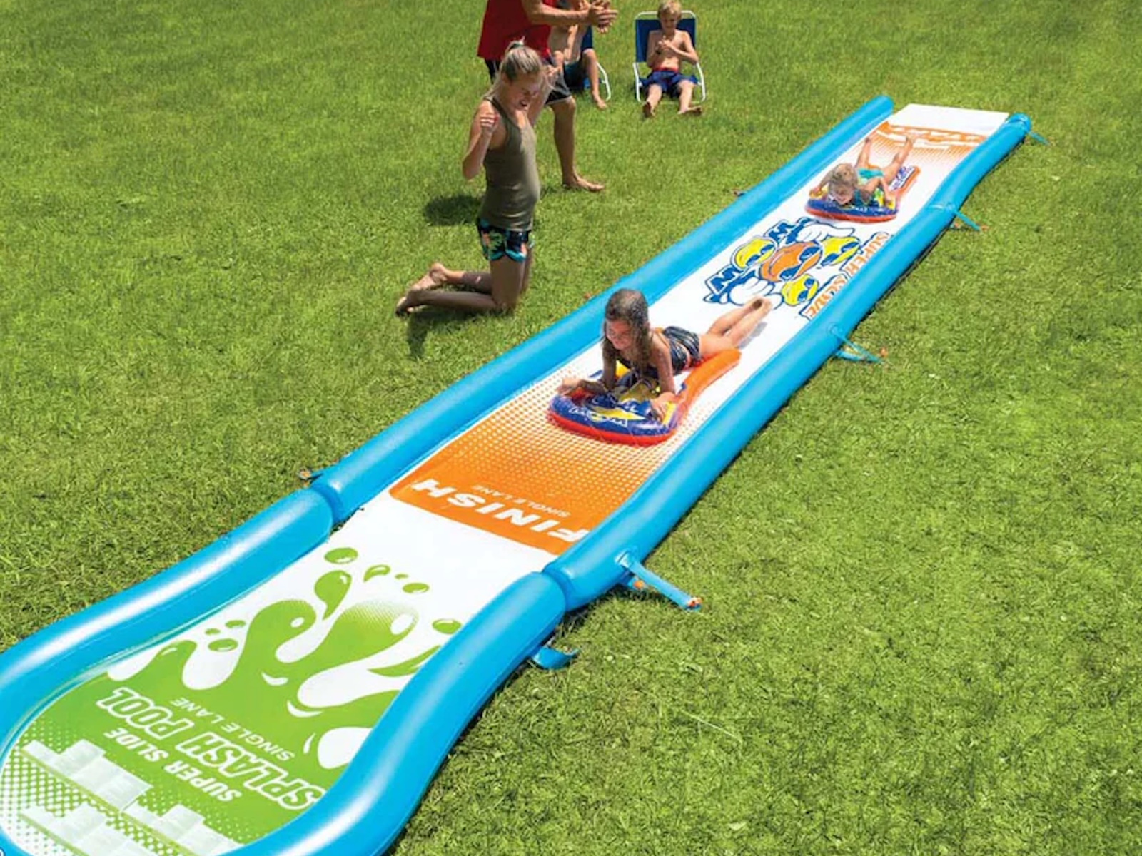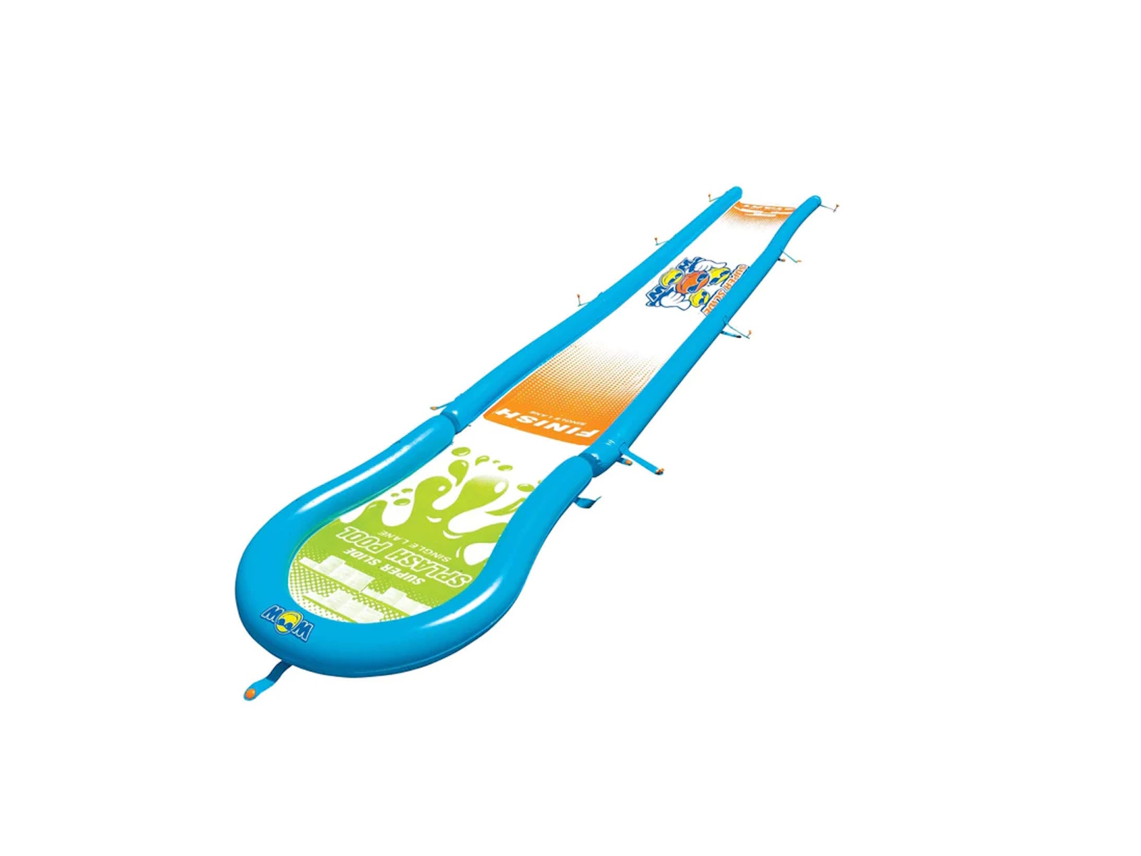 Perfect fun: This Single-Lane WOW Water Slide for the lawn that will keep the kids entertained all day long. The slide is made from extra thick, heavy-duty, super-slick smooth PVC. In fact, it is more than twice as thick as most of the slides you will find in the market AND its backed by WOW’s 1-year warranty. Our zig-zag patterned, 25′ embedded sprinkler system, connects to the standard backyard hose, runs the length of the slide and has 100% water coverage so no dry spots. That’s not even the best part – this slide comes with an attached pool at the end for more SPLASH action. Each slide comes with 2 inflatable sleds to cushion the fall and make the slide even more slippery.
