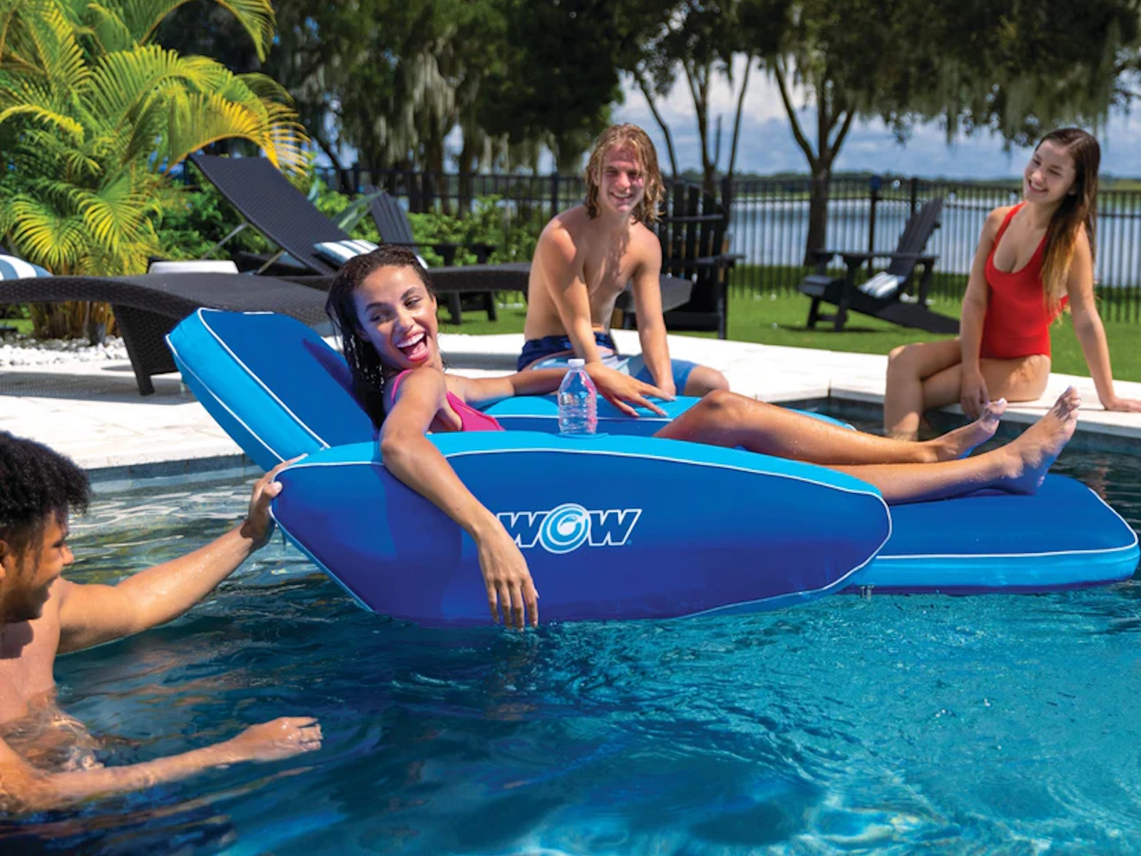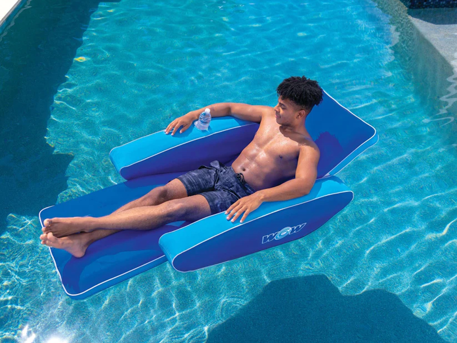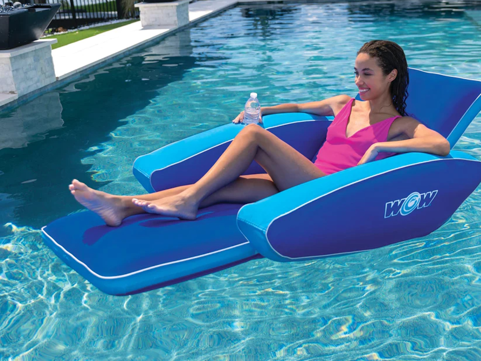 Experience ultimate relaxation with Modern Lounger, the pool lounge chair designed for easy, breezy summer days. This pool float lounger is at a reclined angle, just like your favorite living room armchair. There's a footrest so your legs can stretch out while enjoying the cool water. The wide arm rests of this inflatable lounge allow you to rest your arms, and the comfortable backrest soothes as you close your eyes and soak up the sun. There's also a heavy duty full nylon cover, ensuring this inflatable lasts years to come. If you're looking for the perfect pool float, Modern Lounger just might be it.