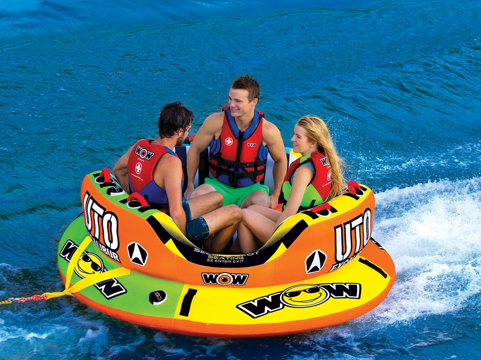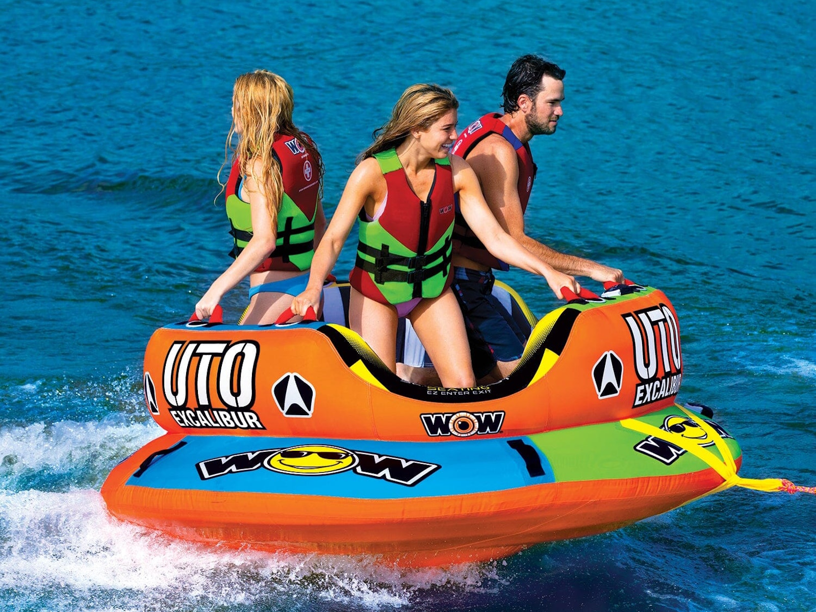 The UTO Series is a hit from out of this world! The UTO Excalibur is the newest one to land in the World of Watersports. This Unidentified Towable Object is a BIG towable with a large, deep secure seating cockpit for up to 3 riders. The UTO Excalibur is designed with a slot system for secure seating and or EZ entry and exit from the cockpit. The secure seating cockpit is deep enough to stand in, if you wish! The floor of the central cockpit is a HOVER BOTTOM which is what this tube mainly rides on. The HOVER BOTTOM allows the tube to float, glide, and jump through the water. The UTO rides like something from out of this world. Features: - 1-3 rider towable tube 680lbs. 308kg. Maximum Capacity - Out of this world UTO shape design with a floating gliding HOVER BOTTOM for EZ towing and extreme riding - EZ slot system for secure sitting or easy exit/entry into the cockpit - Deep center Secure Cockpit Seating for a crew up to 1-3 riders - HI-Performance Secure Standing Cockpit design. One of the - only tubes on the market where riding chariot style while standing. - Riders can ride sitting, kneeling, or standing in the secure slotted cockpit while utilizing the new HOVER BOTTOM design which allows the tube to float, glide, and jump through the water. - Heavy duty wide webbed reinforced tow system - Built in Molded EZ TOW CONNECTOR for EZ tow point hook ups - Heavy-duty full nylon cover with heavy-duty zippers - Heavy-duty PVC bladders - Double webbing foam handles with EVA foam knuckle guards - Flat foam handles for riding and or boarding - Zippered valve covers - Speed Valve for fast inflation and deflation - Inflated size: 84 x 84 x 34 in; 213 x 213 x 86 cm - Deflated size: 89 x 89 in; 226 x 226 cm - 1 year warranty
