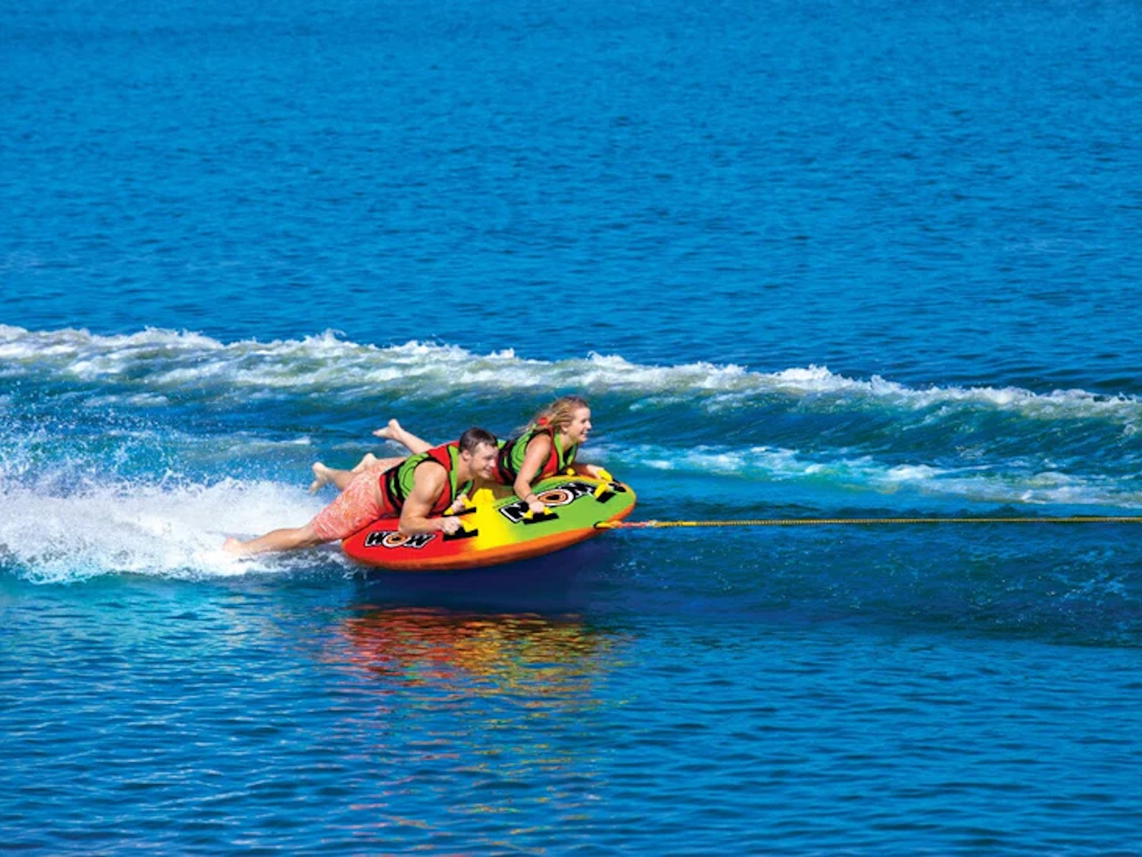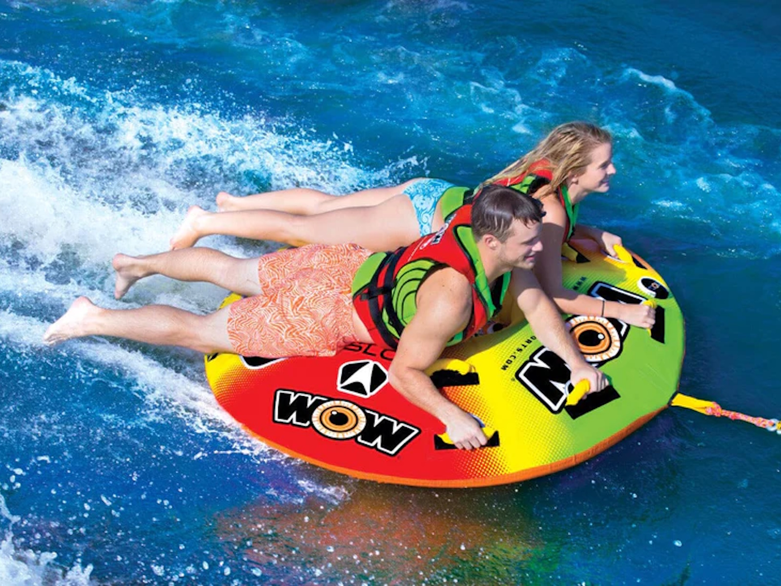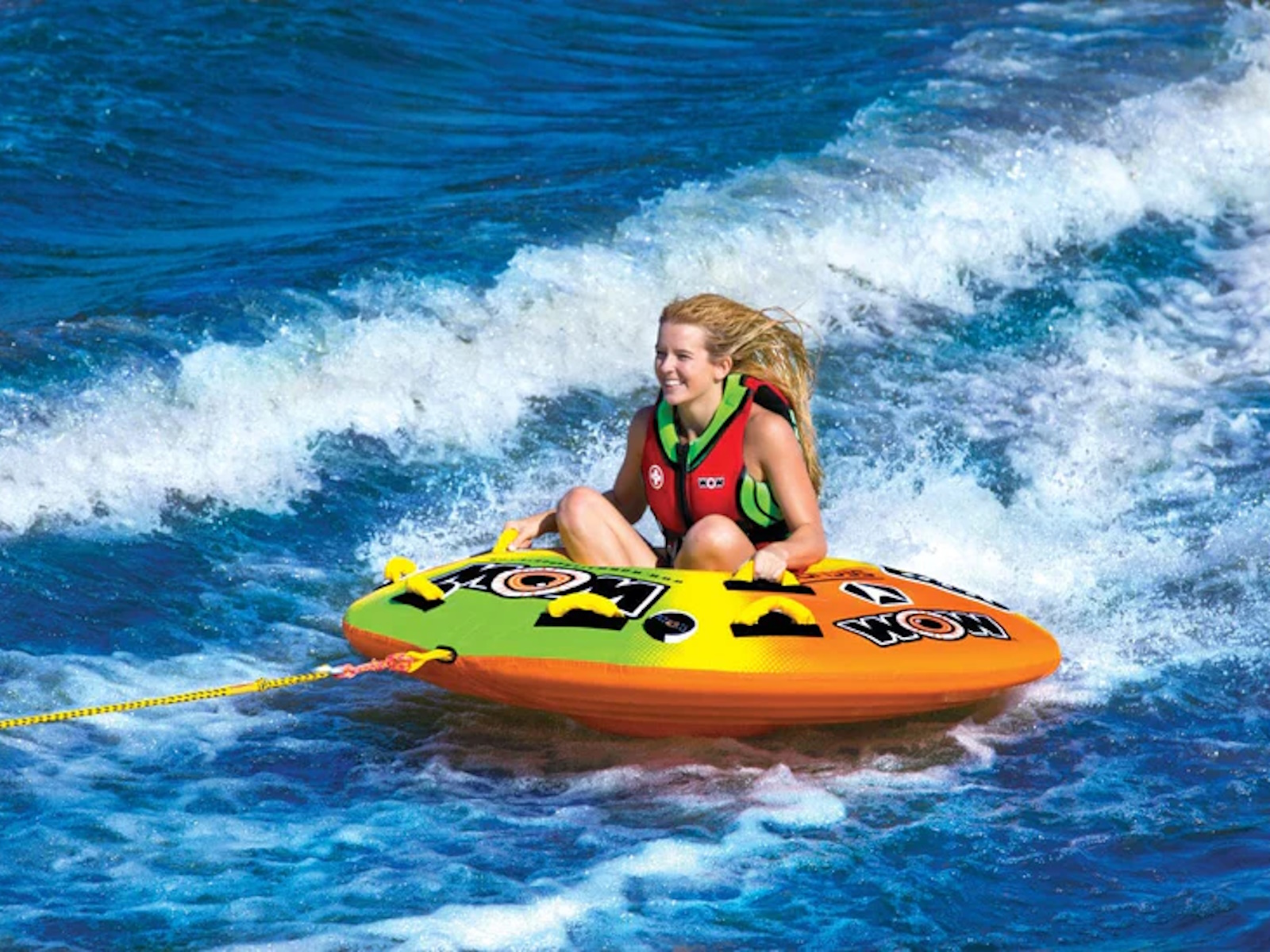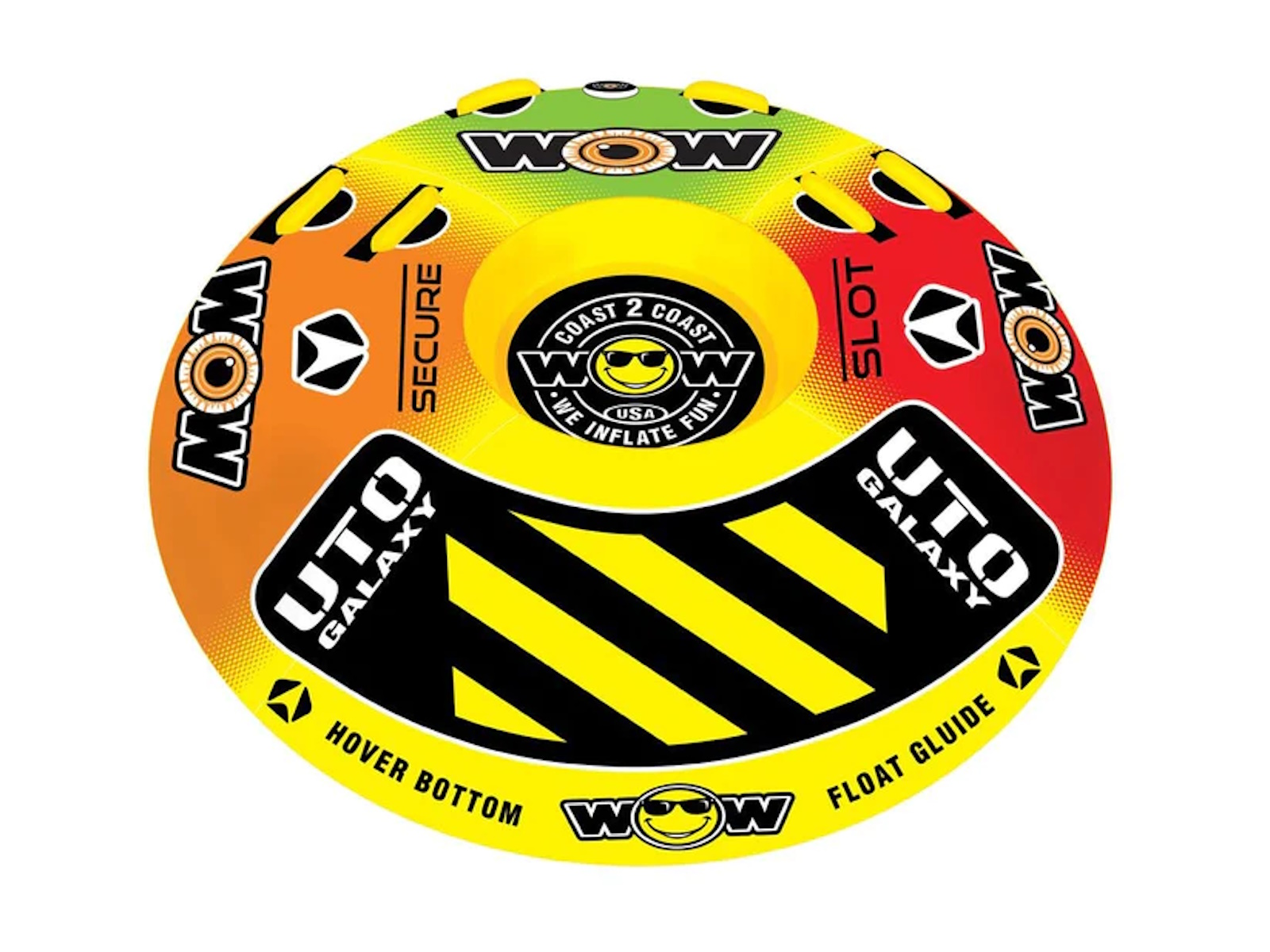 The UTO Galaxy is out of this world. A perfect towable if you want your friends to think you are from another planet. This tube is a hybrid; part deck tube and part cockpit with a hover bottom to keep it fast and glide on the water with little drag. One person can ride this tube sitting in the middle, cockpit style, or you can get two riders lying down like on a traditional deck tube. The versatility makes it seem like you are getting 2 tubes for the price of 1! A great towable for your family outings on the lake.