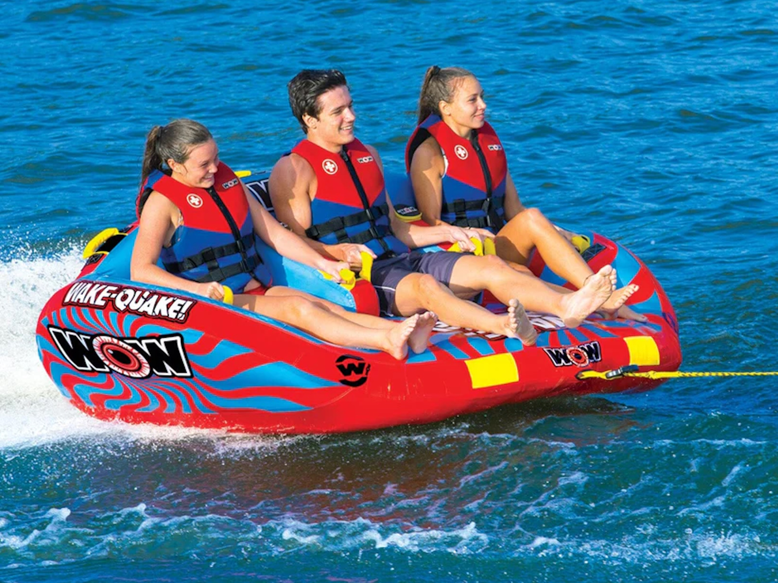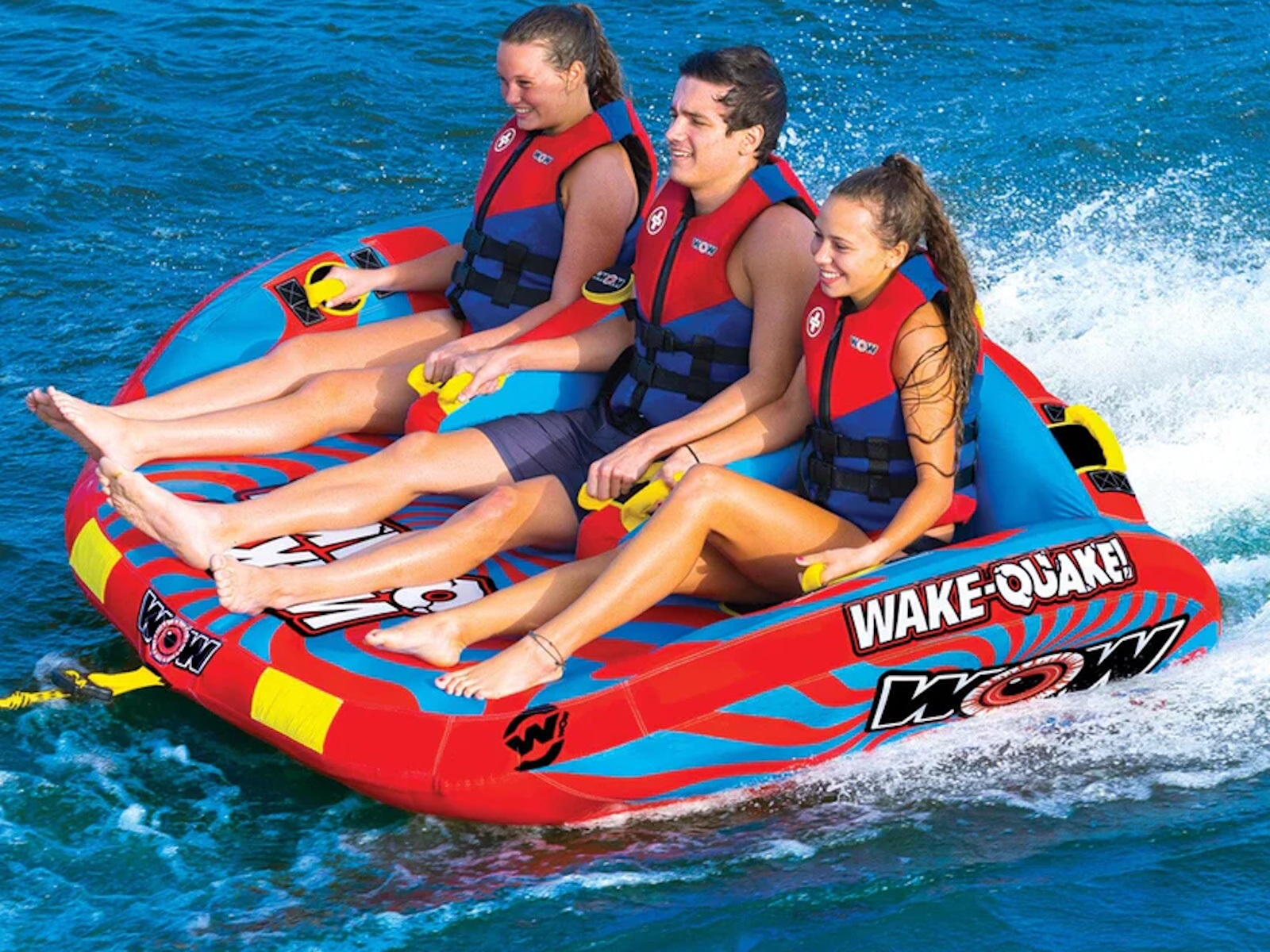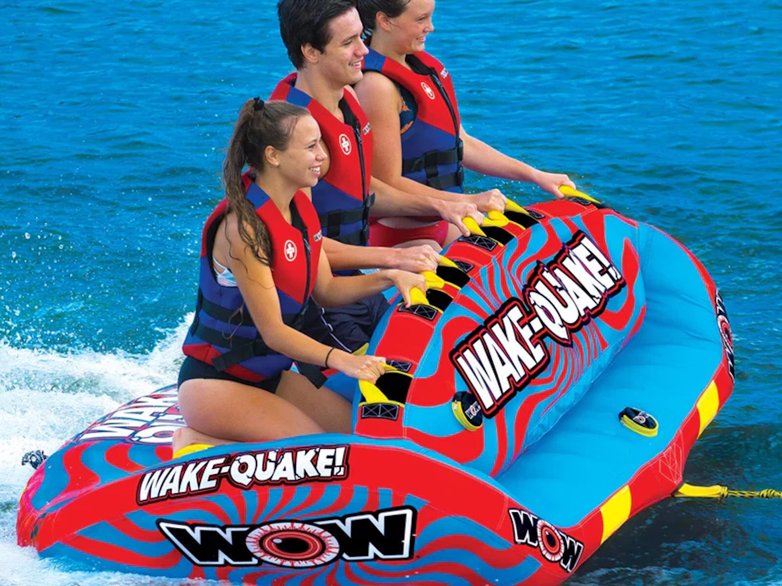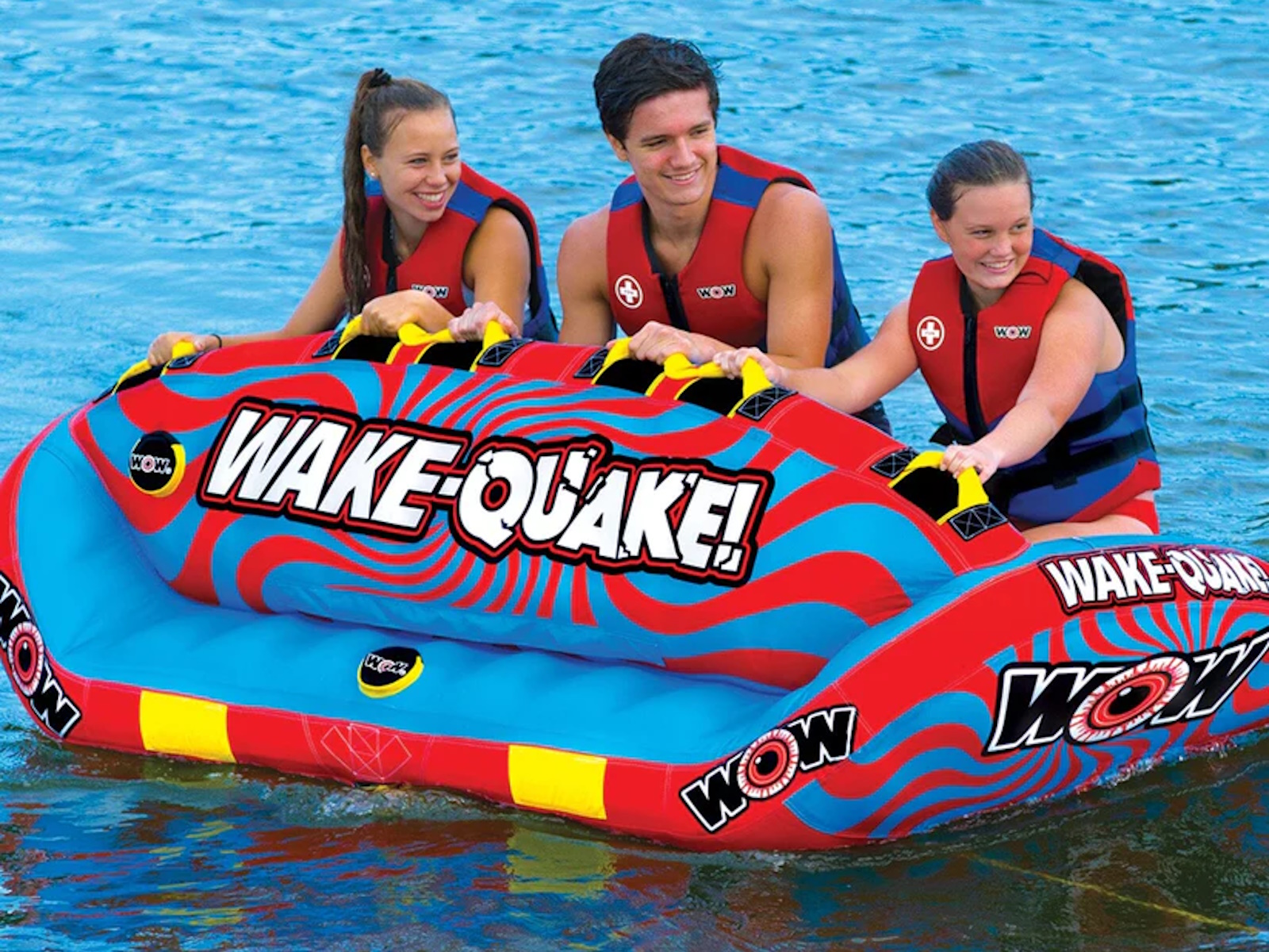 The WAKE-QUAKE Towable from WOW SPORTS is the ultimate choice for anyone looking to have fun at the lake. With its hi-performance features and innovative design, the WAKE-QUAKE is sure to provide an exciting and memorable ride. One of the standout features of the WOW WAKE-QUAKE is its U-shaped winged body design with a curved bottom. This design allows the towable to slide more easily over the wake, resulting in a more exciting ride and less drag on your boat. The WOW WAKE-QUAKE is designed for front and back towing, so you can ride sitting down or going forward, or connect it to the back tow point for chariot style. In addition to its performance features, the WOW WAKE-QUAKE also comes with secure slotted deck seating with slot dividers. This helps keep riders from sliding and bumping into each other on the more extreme rides, ensuring a comfortable and safe ride for all. Overall, the WAKE-QUAKE Towable from WOW SPORTS is a great choice for anyone looking to have fun at the lake. With its hi-performance features and innovative design, it's sure to provide an exciting and memorable ride for the whole family. Whether you're an experienced rider or just looking to try something new, the WAKE-QUAKE is sure to be a hit. Towables can be a fun activity for people of all ages and skill levels, and they can be enjoyed in a variety of settings, including oceans, lakes, and rivers. One potential benefit of buying the WOW WAKE-QUAKE Towable is that it is a high-quality product that is designed for maximum performance and fun. Its U-shaped winged body design with a curved bottom allows it to slide more easily over the wake, resulting in a more exciting ride and less drag on your boat. Additionally, the WOW WAKE-QUAKE comes with front and back towing options and secure slotted deck seating with slot dividers, making it a versatile and comfortable choice for riders. Share your #wowmoments with us by writing about them or sharing pictures or videos on social media or with friends and family. Your #wowmoments inspire the outdoor lifestyle that we innovate and design for you and your family. It is a special way to reflect on and appreciate the special moments in your life with your family so everyday feels like Summer. We love to see your #wowmoments!