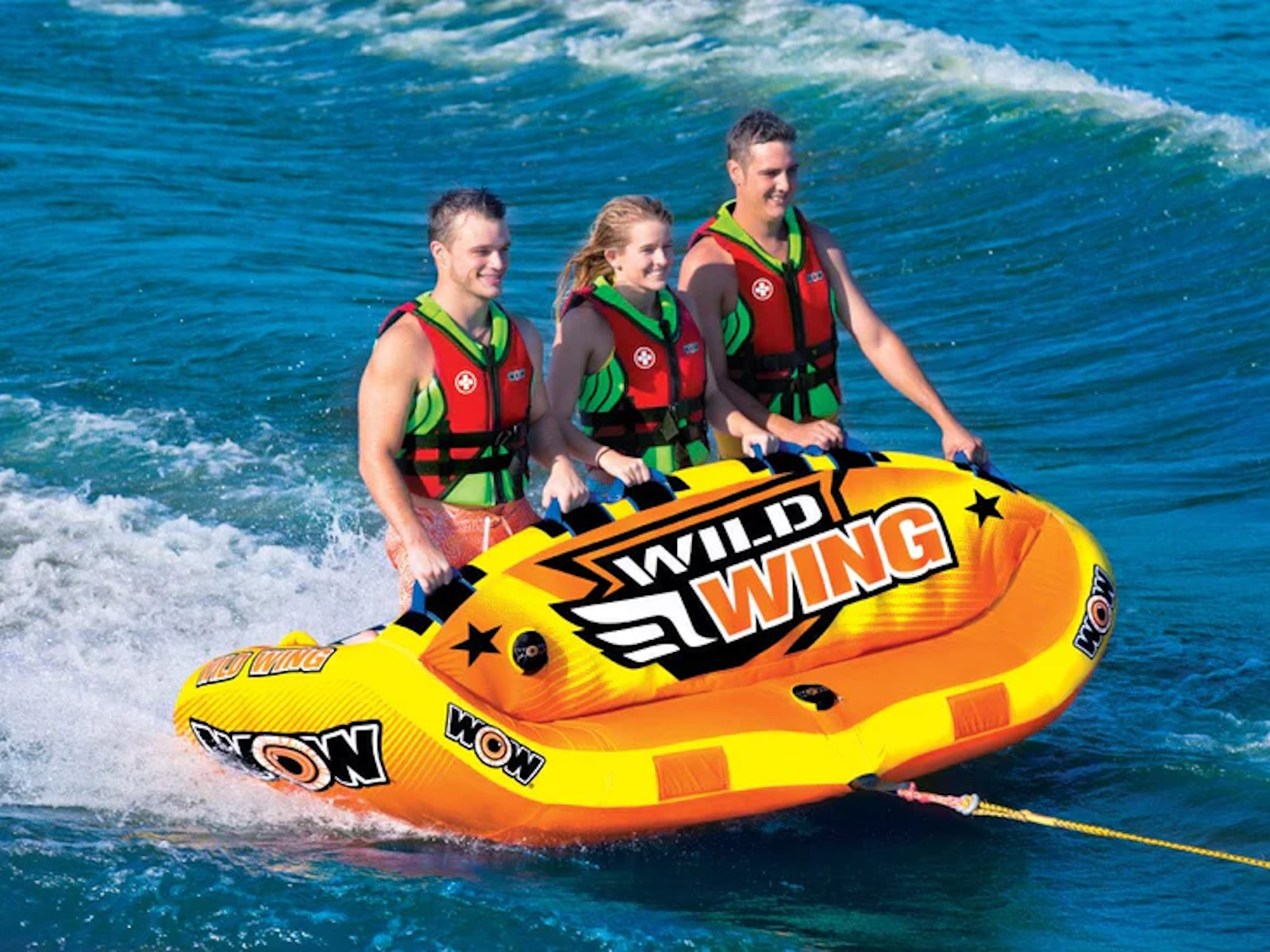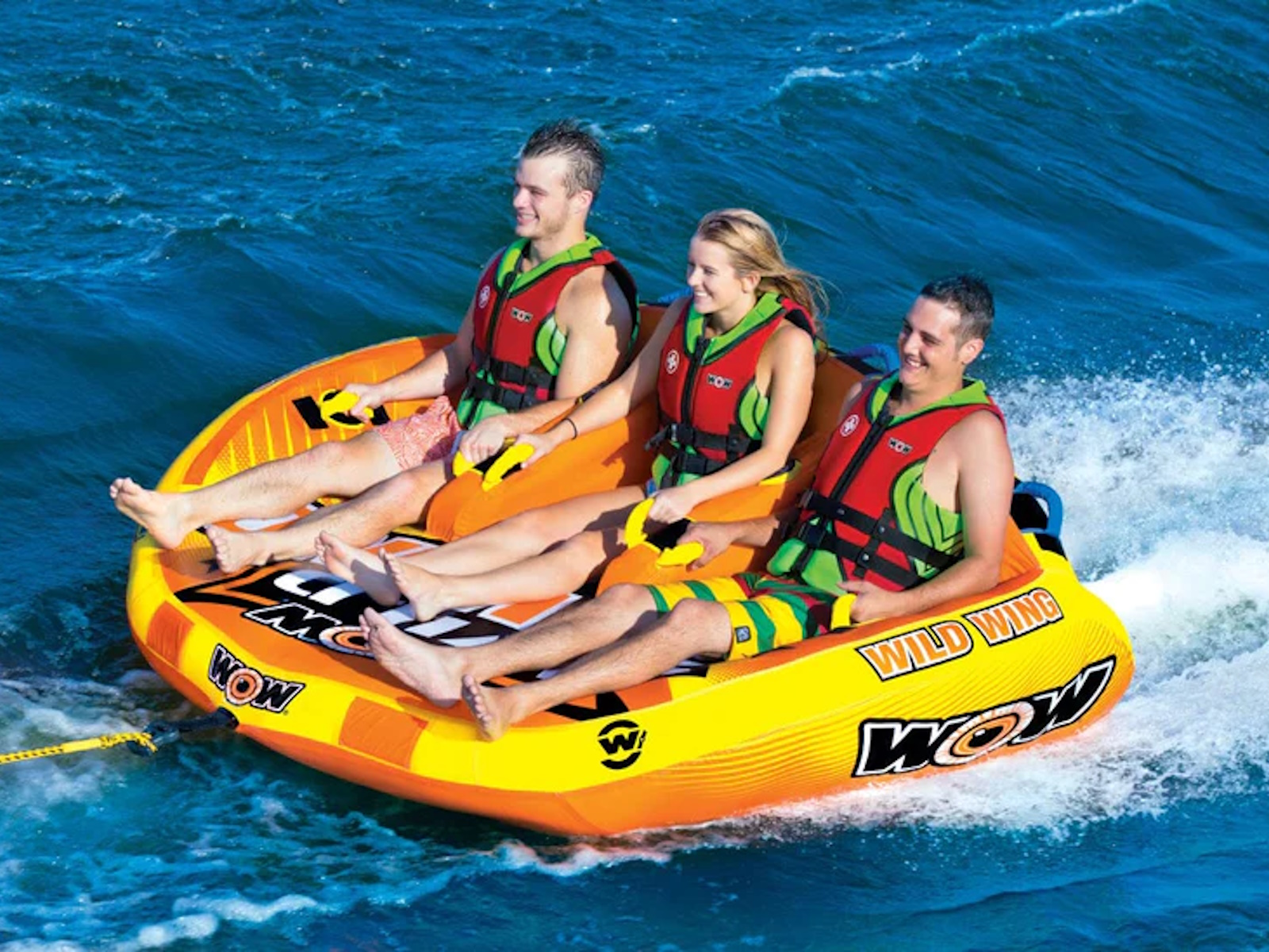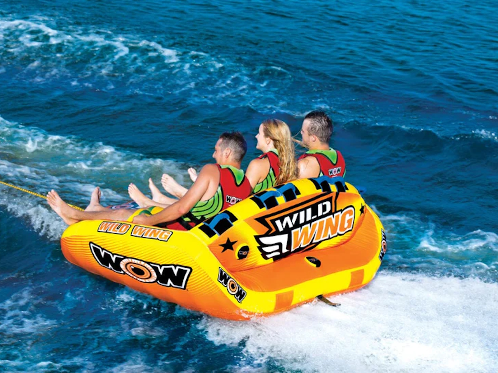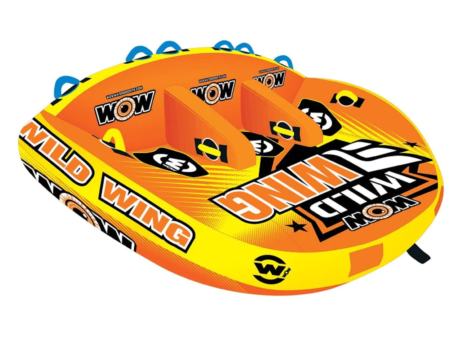The Wild Wing series is similar to the Bubba series from WOW but with more new hi-performance features. The Hi-performance U-shaped winged body design with curved bottom slides much more easily over the wake than the standard flat bottom. This means a more exciting ride, as well as less drag on your boat. The Wild Wing comes with front and back towing so you can ride sitting down going forward or connect it to the back tow point for chariot style. The new HI-Performance Secure slotted deck seating with slot dividers keeps the riders from sliding and bumping into each other on the more extreme rides. So get out on the water with the WOW Wild Wing 3.