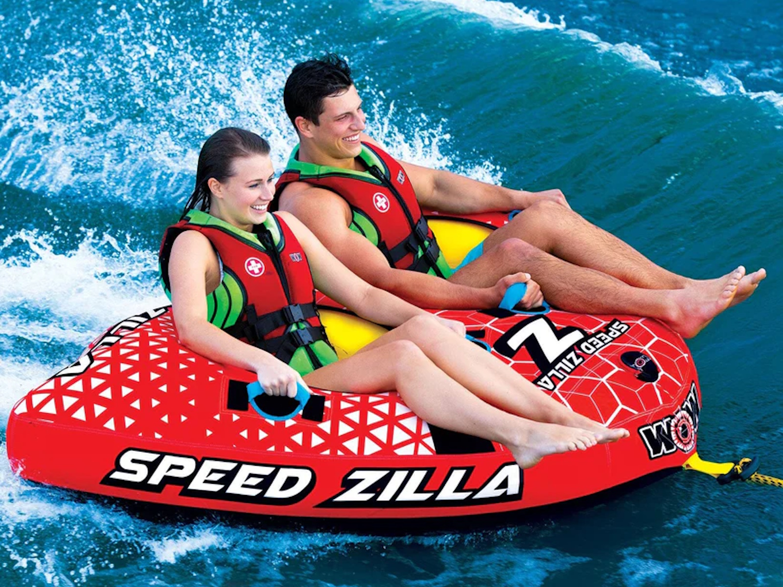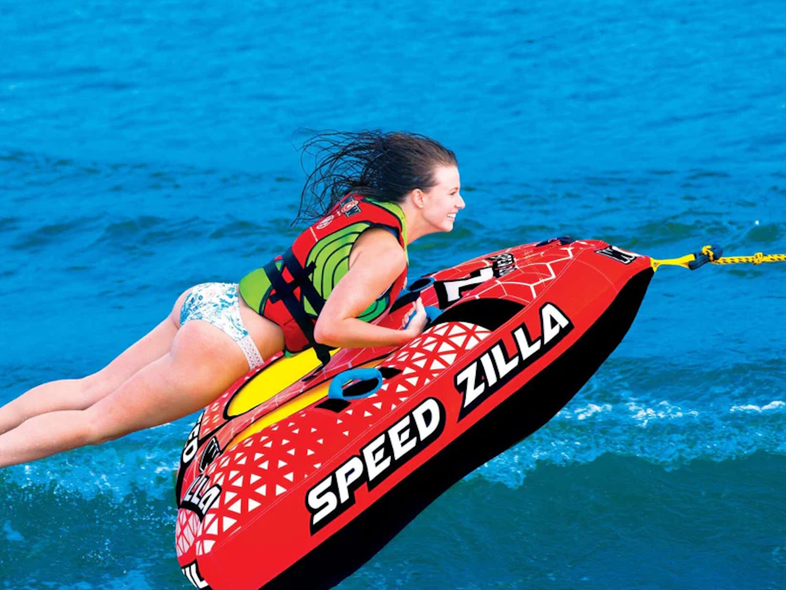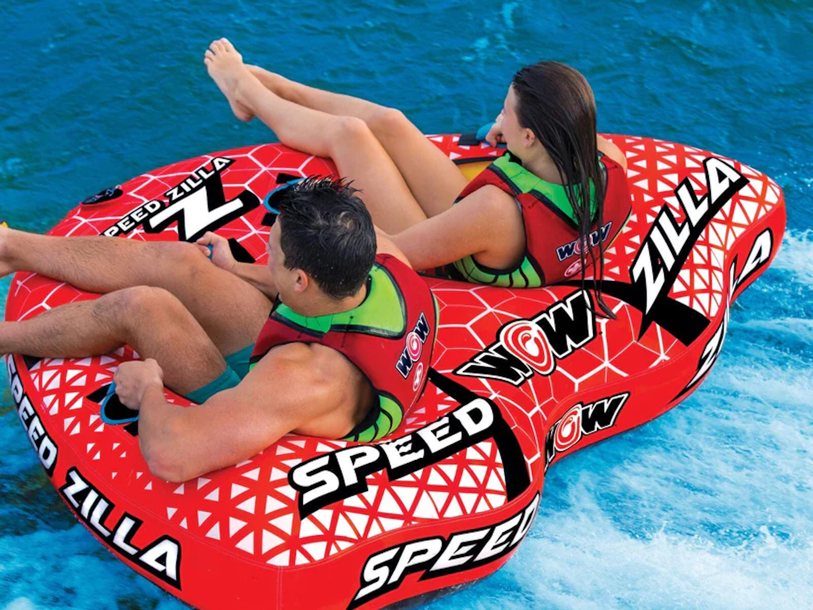 ITÕS SPEEDZILLA! The Speedzilla is a monster of a tube! Built with separate Open Cockpit Seats and a slick shape, this makes the Speedzilla not only a towable that is fast and balanced over the wake and in the whips but is easy to ride all day long. Designed with a partial cover over the heavy-gauge PVC, this towable is lighter and will breeze over the water effortlessly. The superior graphics make it eye-catching to any spectators around. Terrorize the waters with the Speedzilla as your vessel!