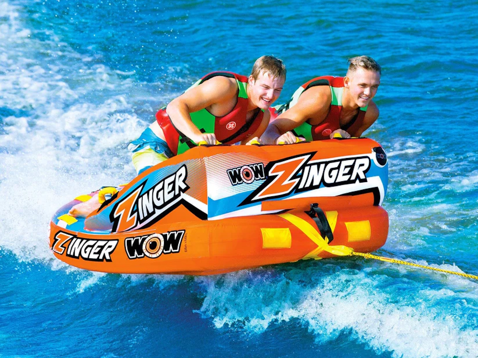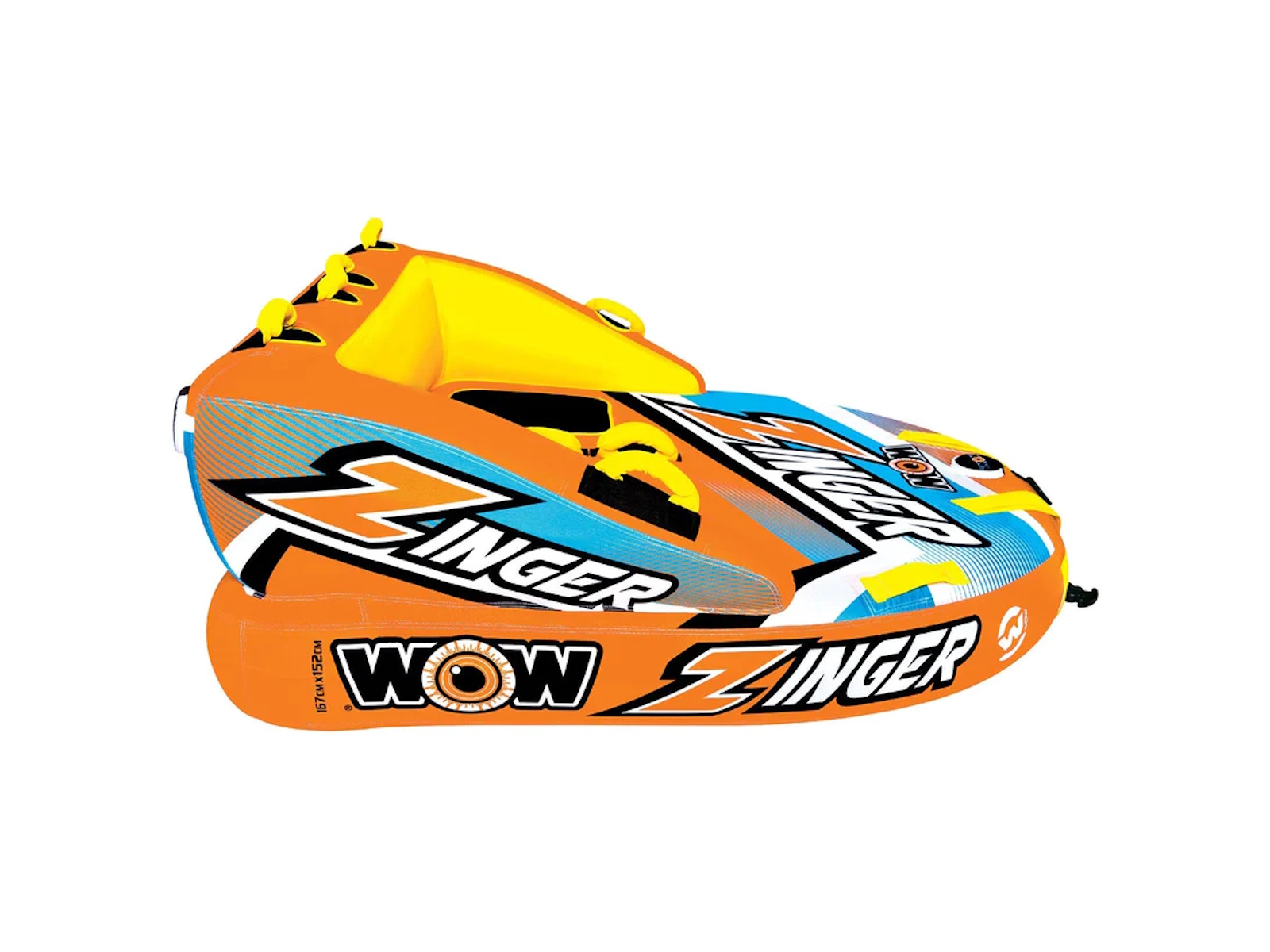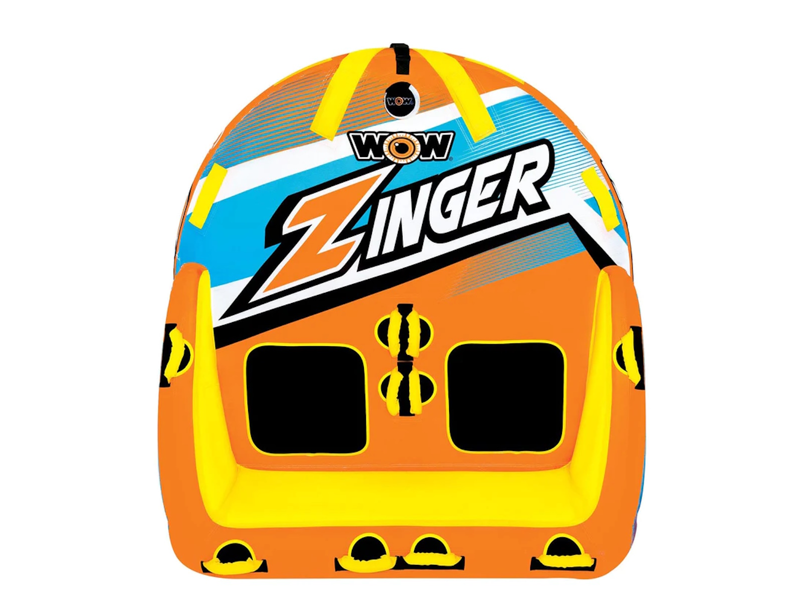 The Zinger couch style towable is one of the most popular tubes on the market. The Zinger makes for a perfect starter tube for the family just getting into towables but also is a tube that just about anybody can have fun on. The Zinger comes with a flat base for a smooth ride over the water and minimal drag on the boat. The SECURE DECK SEATING on the Zinger comes with a super high backrest with sidewalls which is great for keeping young kids safe and for giving them a secure feeling if they are just getting started on towables. But donÕt get us wrong, this isn't just for little kids. The high backrest just means itÕs more difficult to fly off on the more wild rides. The smooth, flat base will get this baby going fast on the water if thatÕs what youÕre in to. The Zinger also comes with front and back tow points so you can ride sitting, laying down, or kneeling chariot style. And after your ride is over the Zinger makes a perfect floating couch on the water. Great for relaxing with your friends at your favorite body of water.