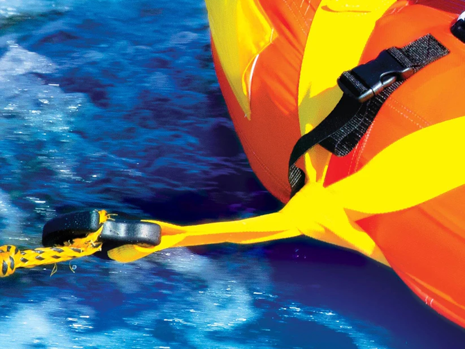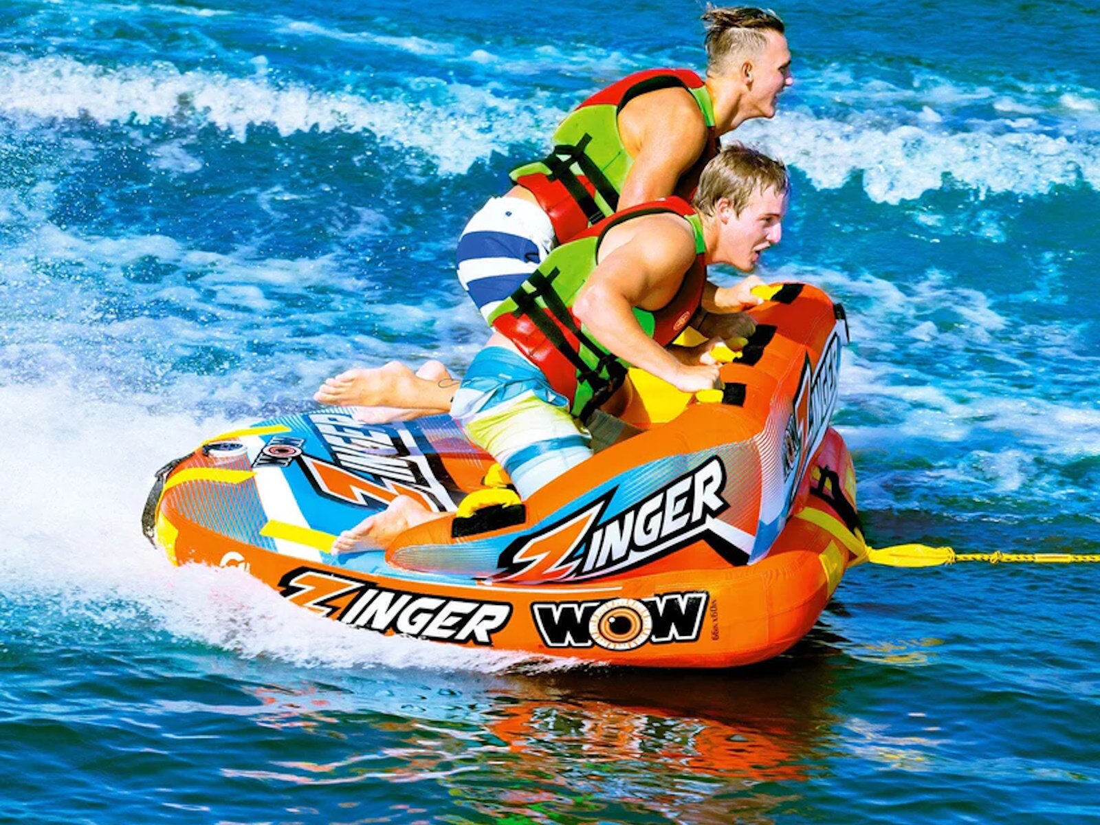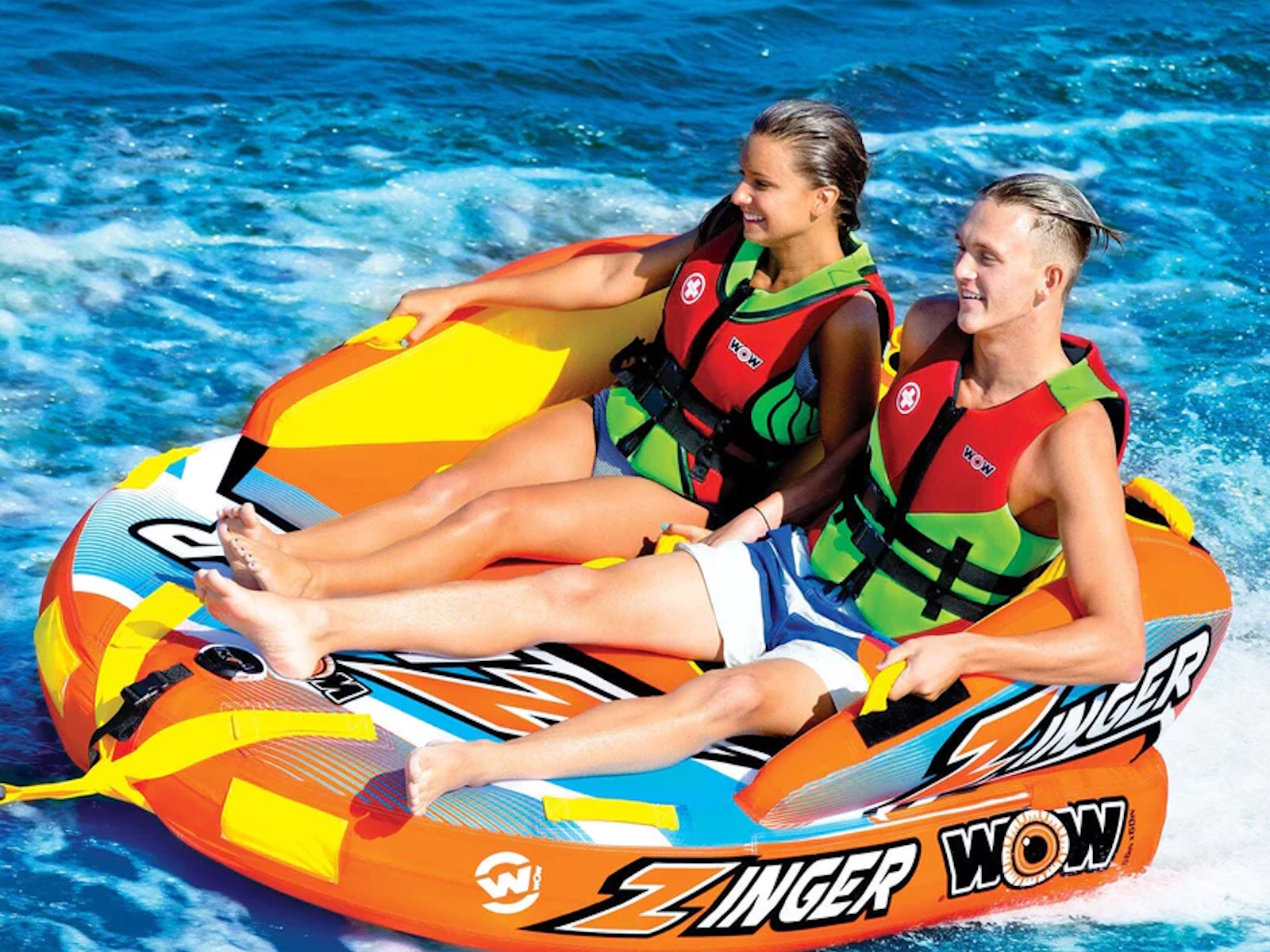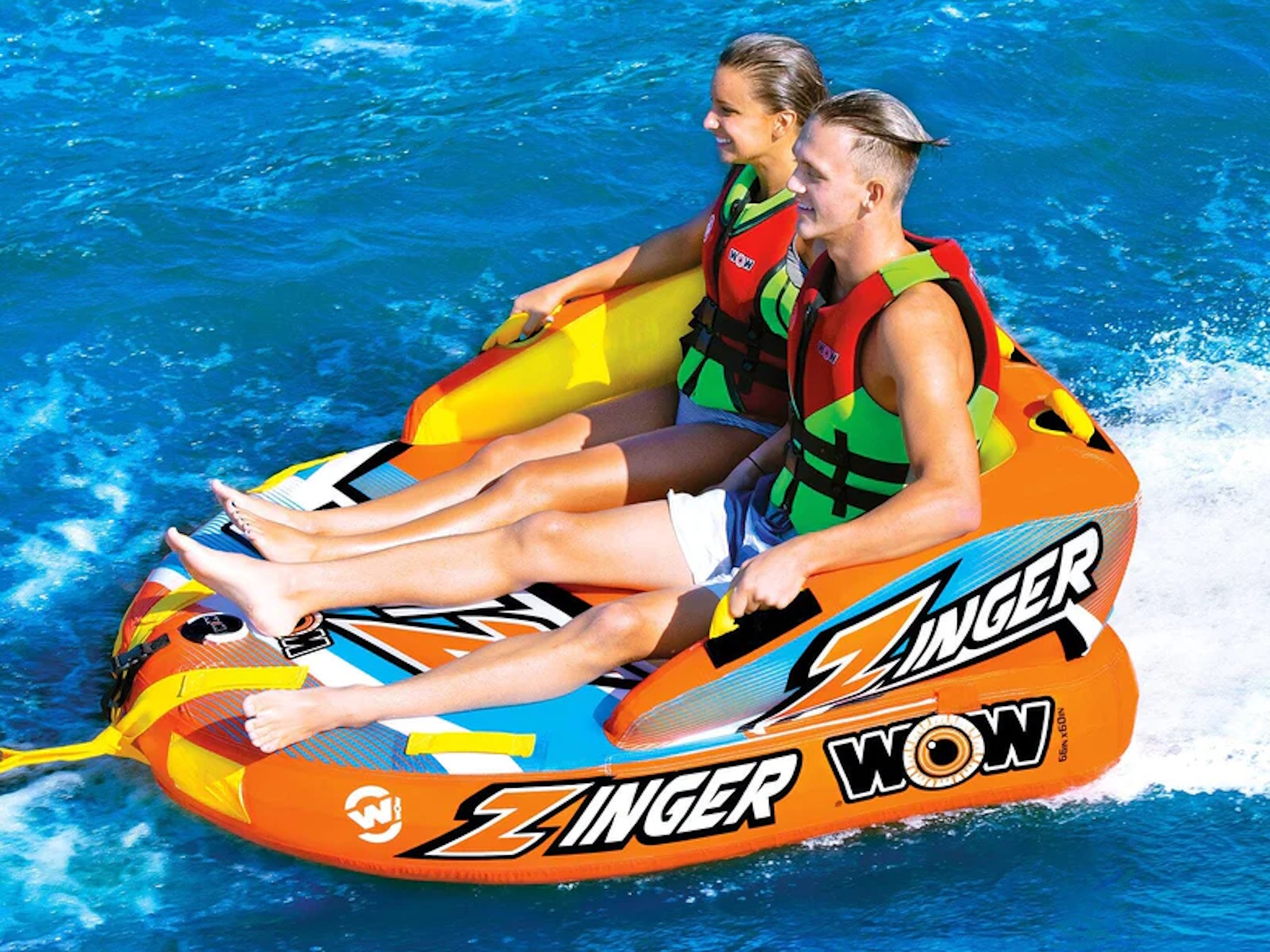 The Zinger couch style towable is one of the most popular tubes on the market. The Zinger makes for a perfect starter tube for the family just getting into towables but also is a tube that just about anybody can have fun on. The Zinger comes with a flat base for a smooth ride over the water and minimal drag on the boat. The SECURE DECK SEATING on the Zinger comes with a super high backrest with sidewalls which is great for keeping young kids safe and for giving them a secure feeling if they are just getting started on towables. But donÕt get us wrong, this isn't just for little kids. The high backrest just means itÕs more difficult to fly off on the more wild rides. The smooth, flat base will get this baby going fast on the water if thatÕs what youÕre in to. The Zinger also comes with front and back tow points so you can ride sitting, laying down, or kneeling chariot style. And after your ride is over the Zinger makes a perfect floating couch on the water. Great for relaxing with your friends at your favorite body of water.