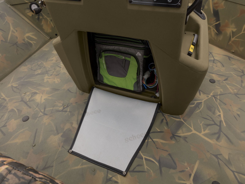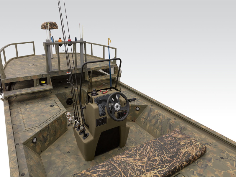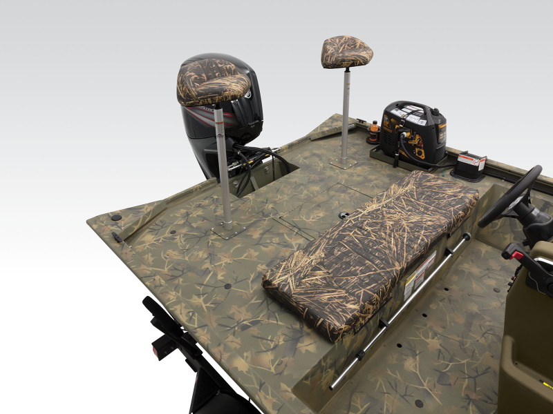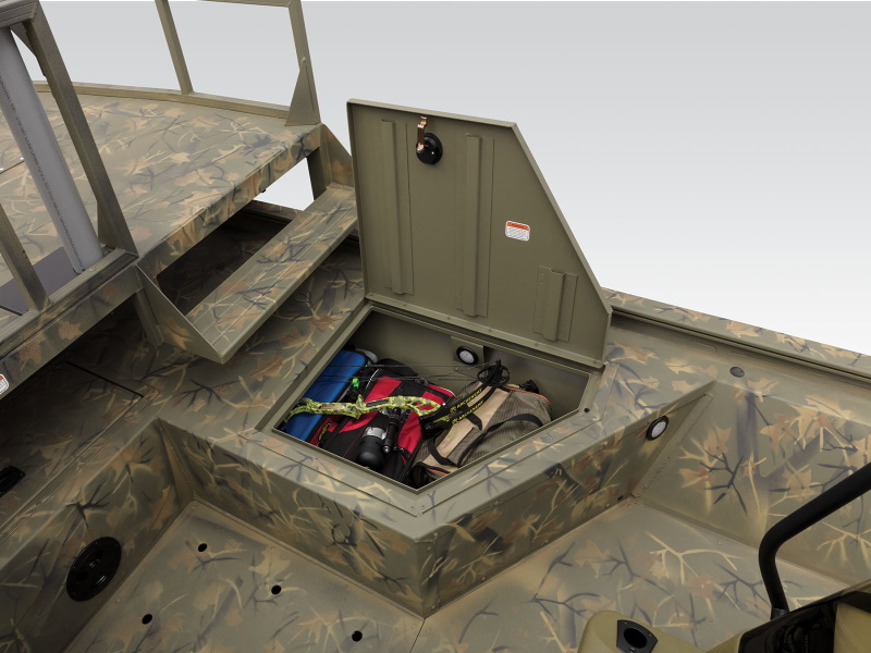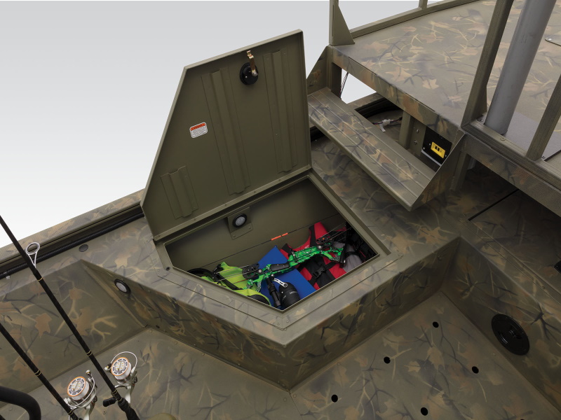 - Removable elevated bow shooting deck w/railing, rail-mounted bow & drink holder, 3 pedestal seat base locations, LED spotlights & trolling motor access hatch