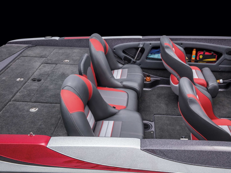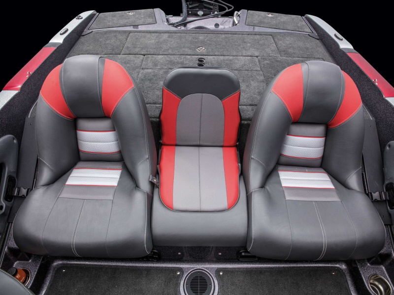 - Custom-Fitted Premium Marine Upholstery (2) Bucket Seats w/ adjustable slides, Aft bench seat, (2) SRS fold-downs w/ (2) Non-adjustable pedestals
