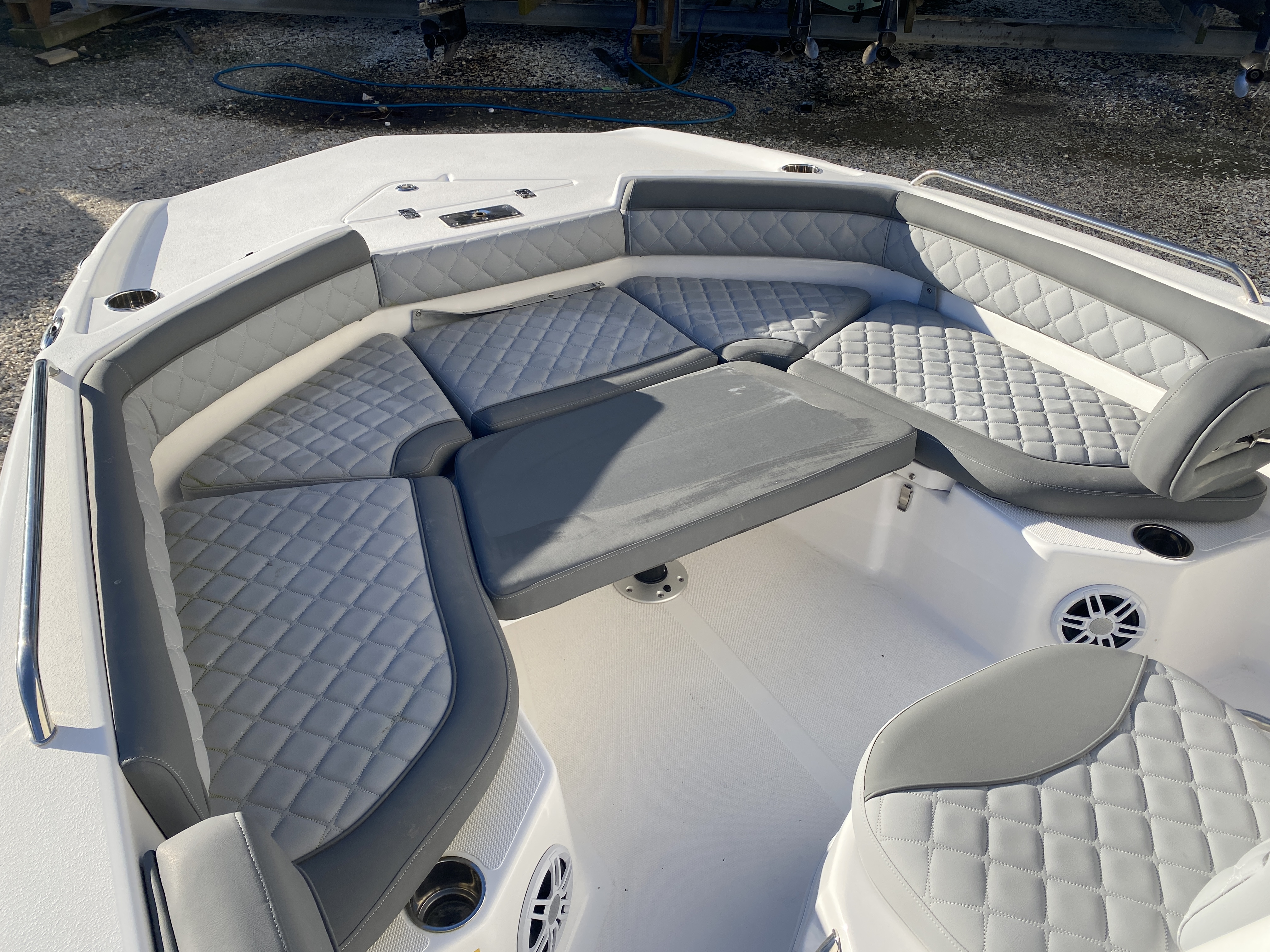 Turn your 211 into a versatile deck boat with an added Sport Package, which includes a swim platform, bimini top, and Fusion stereo system.