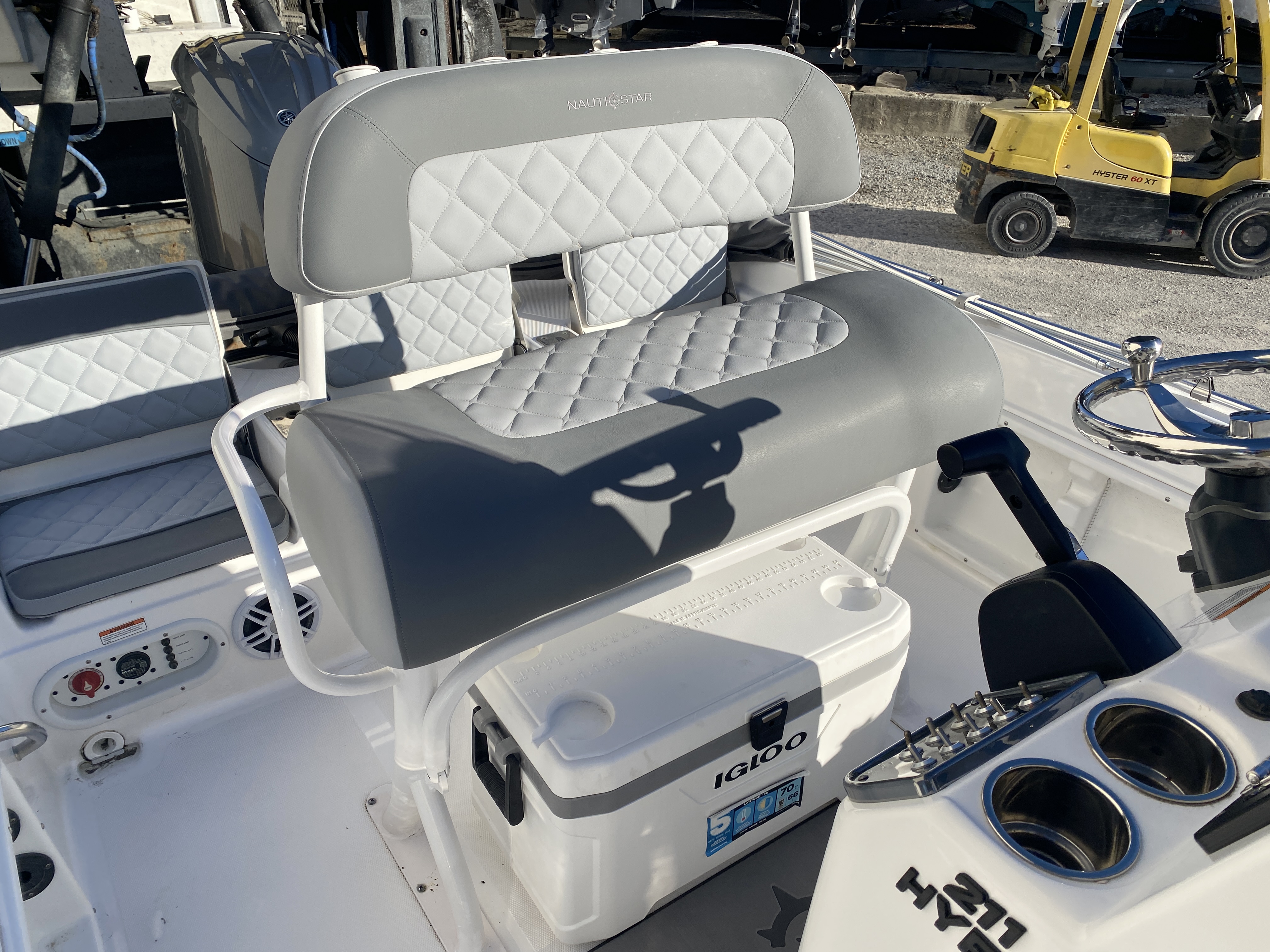 NauticStar’s 211 Hybrid is the perfect host for friends and family. Its ample seating – three-across at aft and five up at bow – make it easy to engage socially on the water. When it is time to get serious about fishing, however, the 211 Hybrid will up your game big time. Features like six in-console rod holders and 13-gallon livewell/baitwell, gunnel rod holders, and a non-skid self-bailing cockpit come standard. The aft and bow seats even convert into casting platforms and are utilized for cast net storage, battery, and livewell storage.