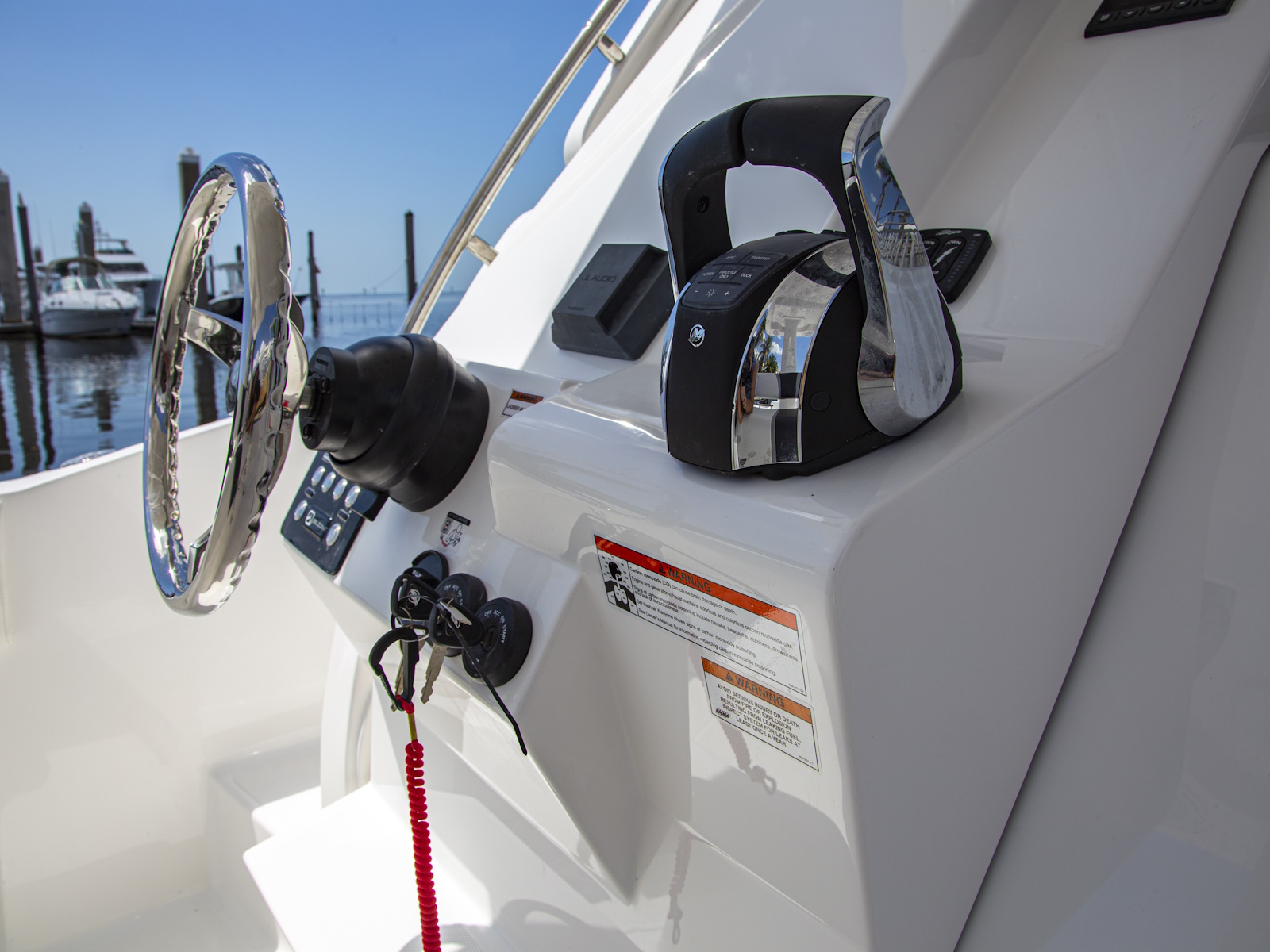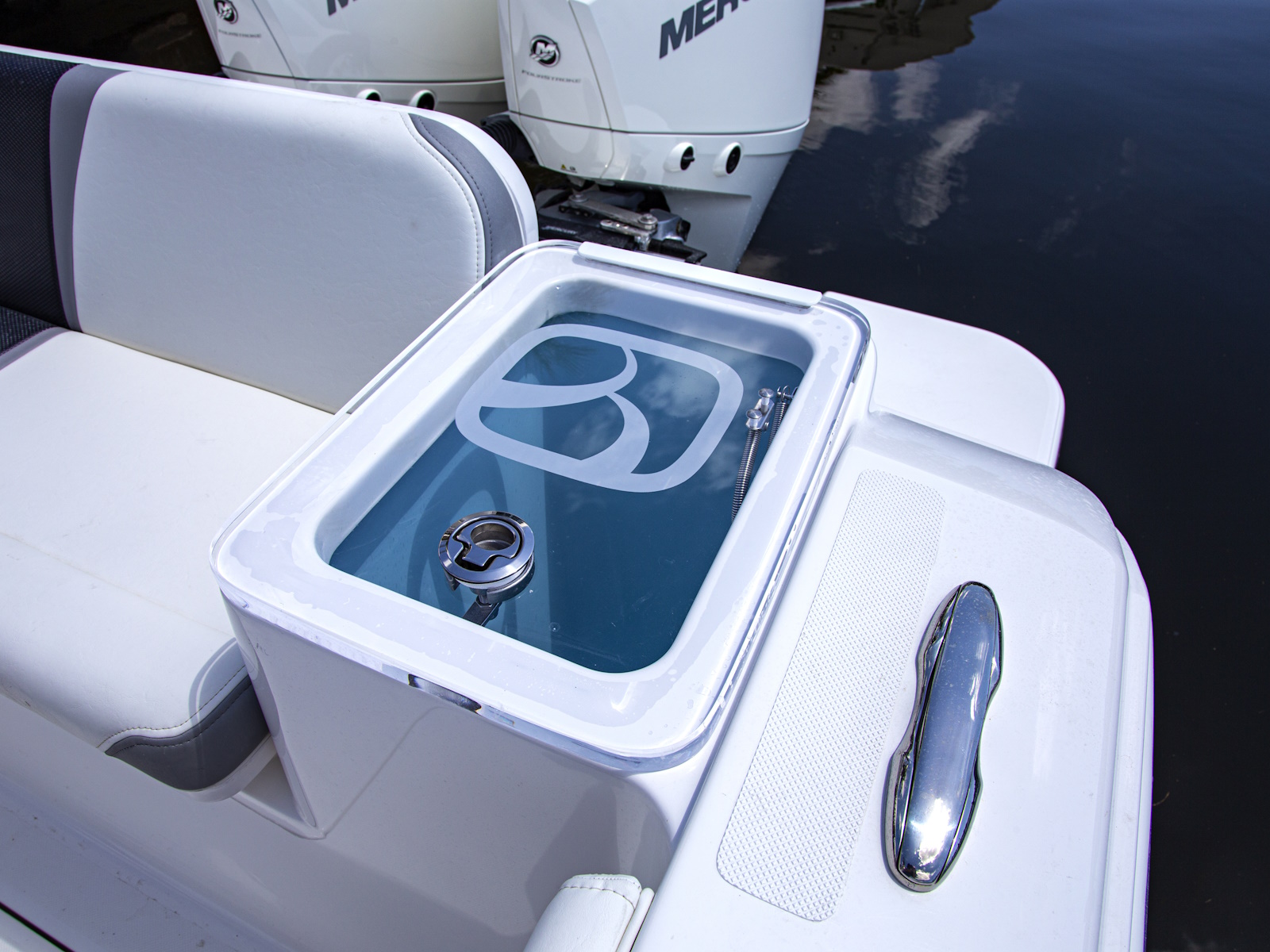 - Twin Mercury FourStroke V6 outboards, 200 HP (standard) or 225 HP (optional)